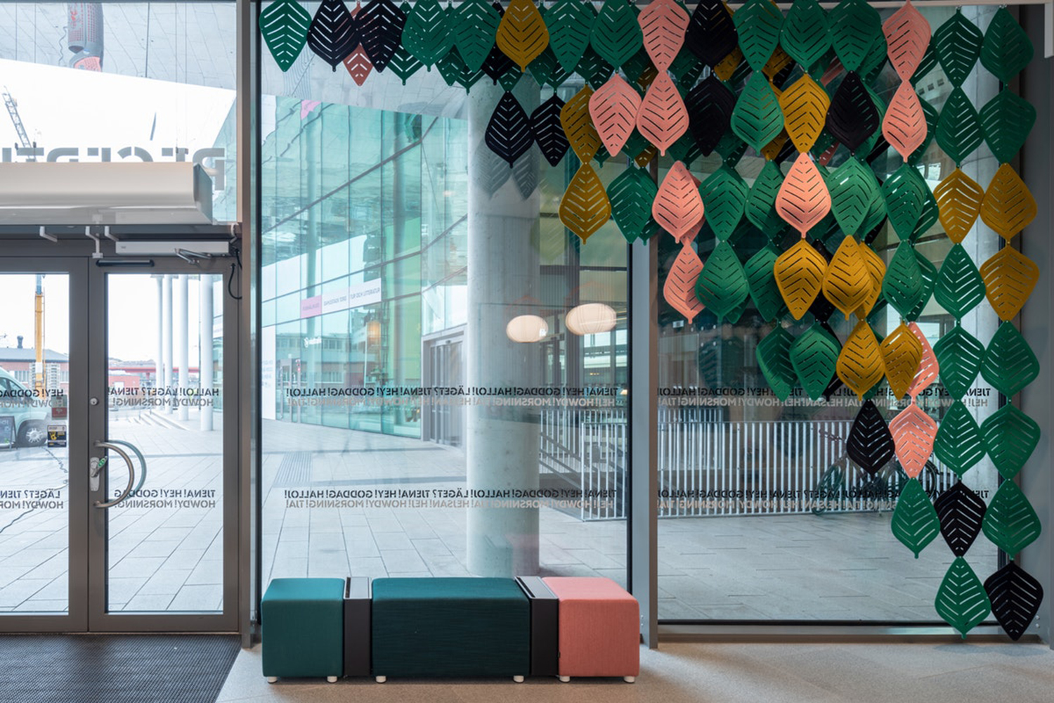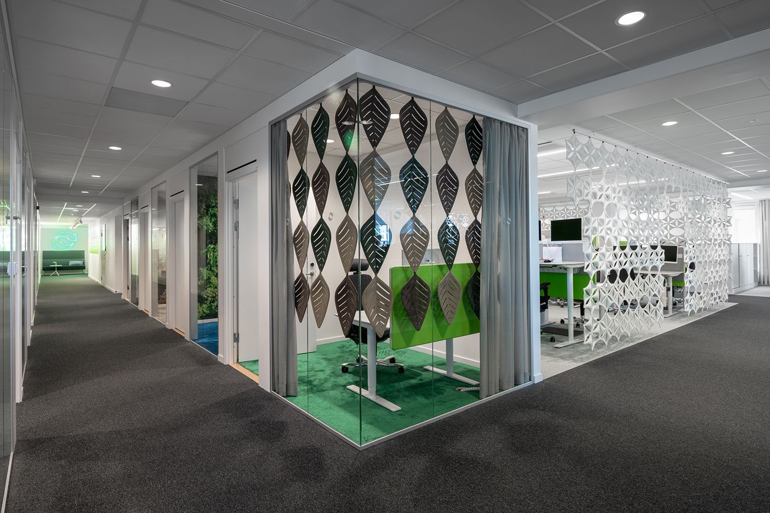Airleaf maakt het mogelijk om afzonderlijke ruimtes te creëren met behoud van openheid. U bepaalt zelf de mate van openheid door te kiezen hoe de bladvormige modules worden gecombineerd. De bladvormige modules kunnen worden gecombineerd tot geluidsverspreidende schermen in verschillende patronen en formaten.