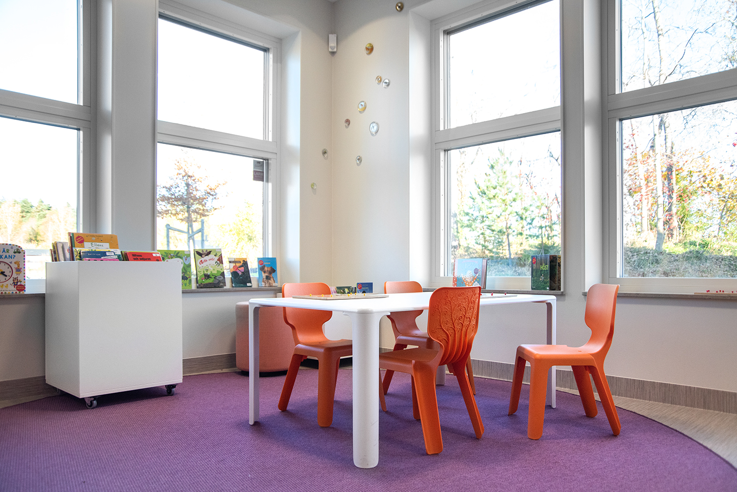 Idee en functie elegant gecombineerd. Kleuren die de vier seizoenen voorstellen : groen voor lente, helder oranje voor zomer, bruin voor de herfst en wit voor de winter.