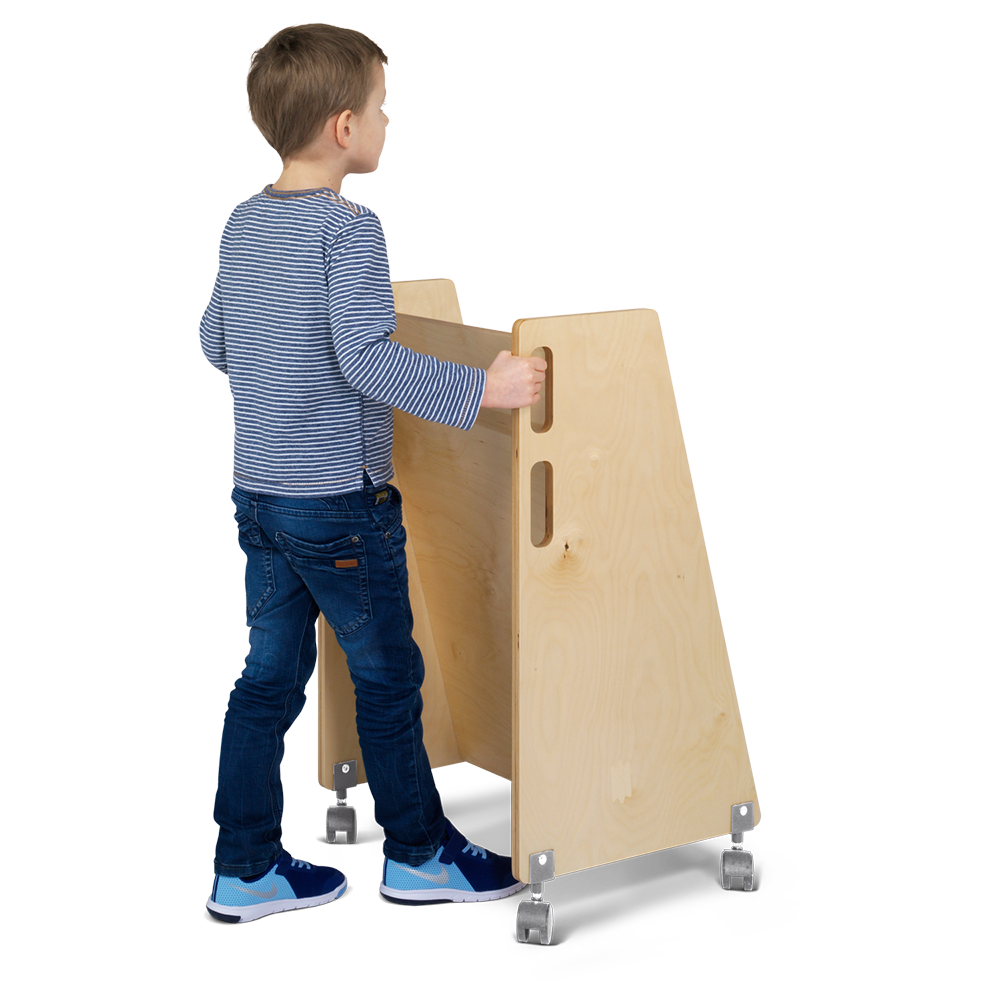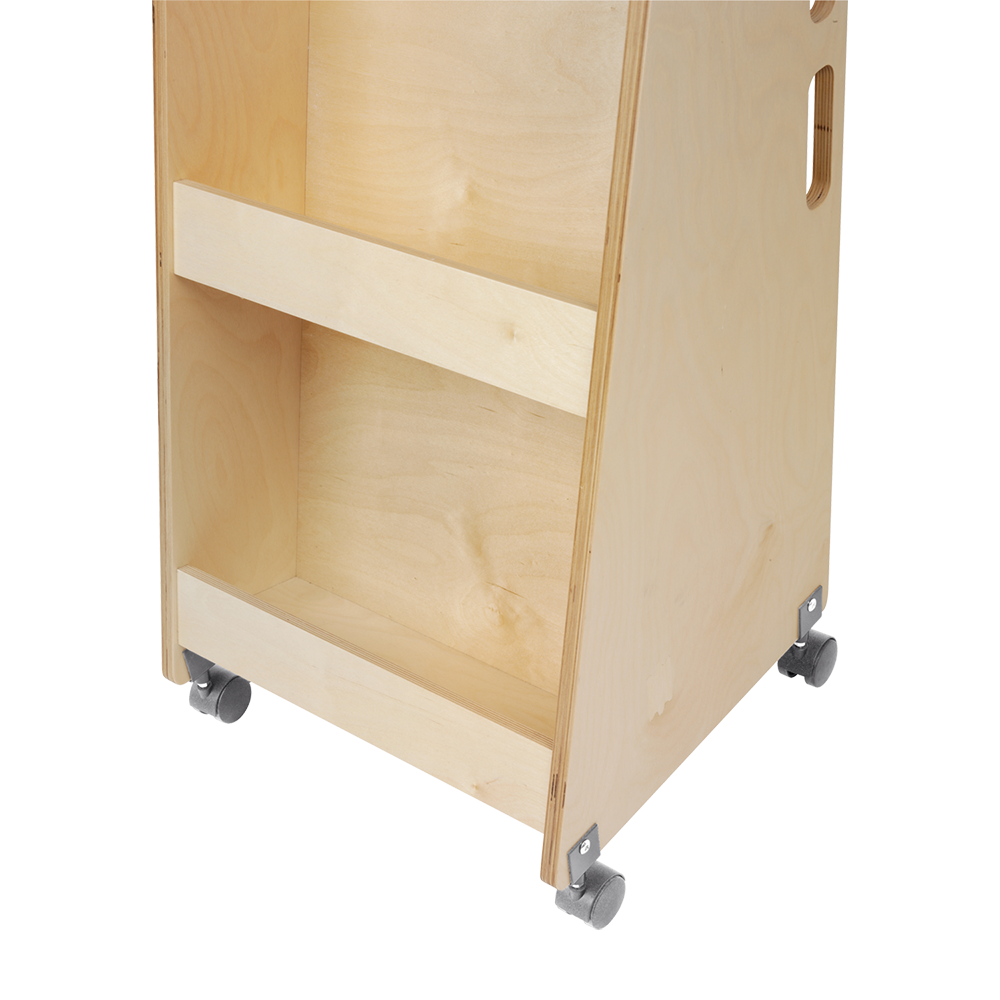 Compacte boekenwagen van berken multiplex met 2 vaste legborden met opstaande voorrand voor frontale presentatie van bv. prentenboeken.