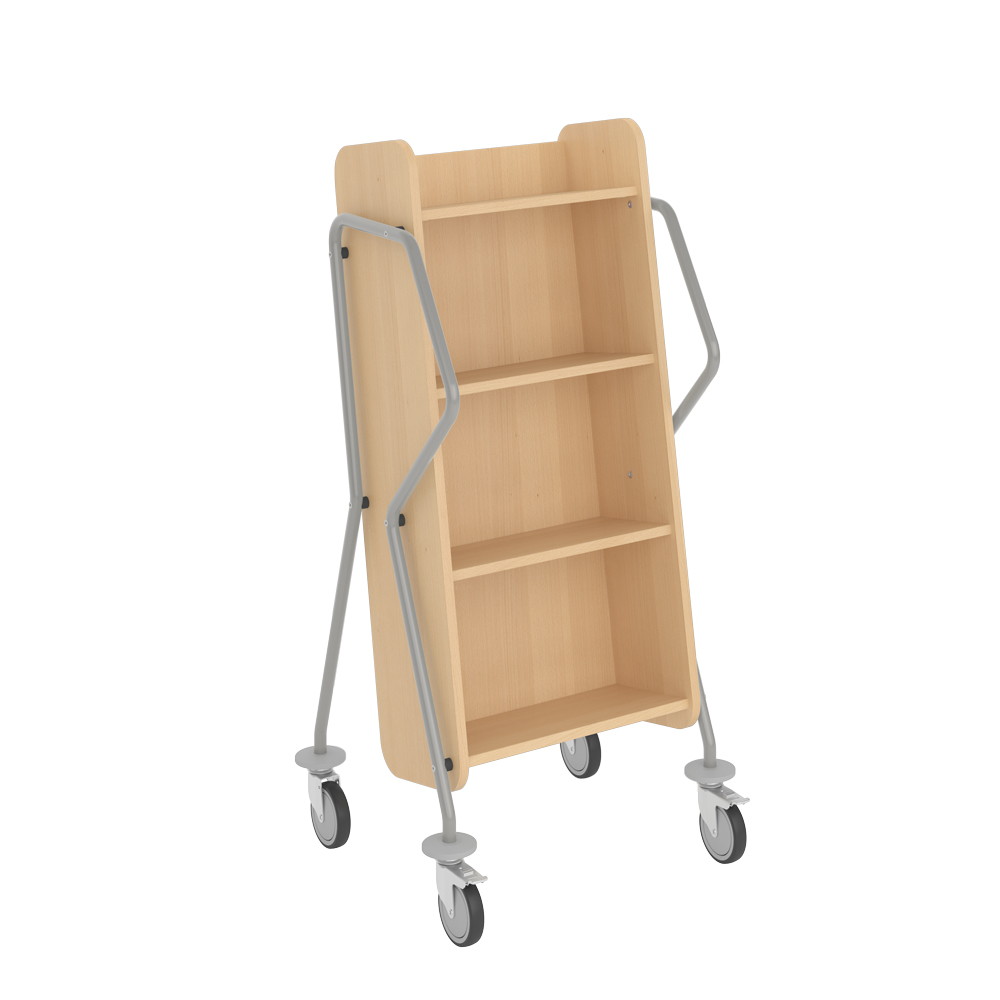 Ergonomische, gebruiksvriendelijke, enkelzijdige boekenwagen met 4 legplanken. Er is een royale ruimte voorzien tussen de planken, ideaal voor grotere boeken.