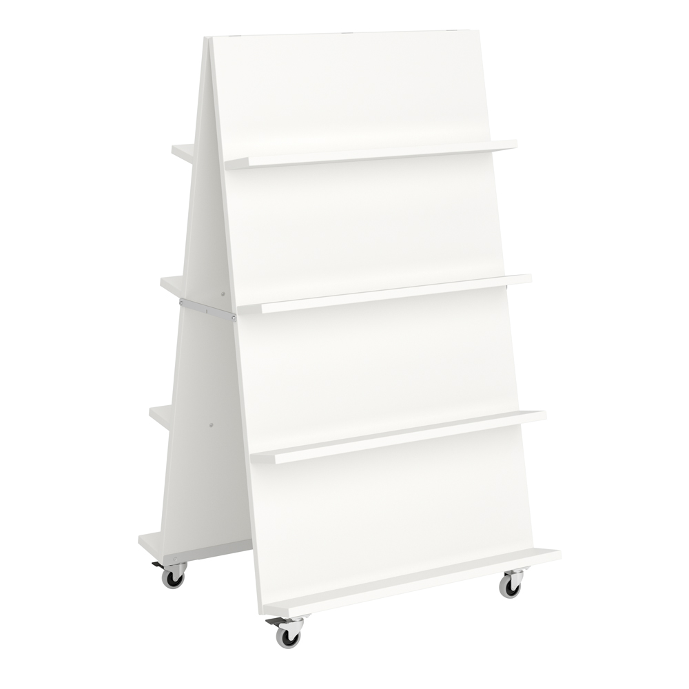 Verschillende mediaformaten kunnen op deze display gepresenteerd worden dankzij de verstelbare planken. Gebruik 3 of 4 planken aan elke zijde. Ideaal in open ruimtes of entree zones waar kleinere displays vaak in verdwijnen.