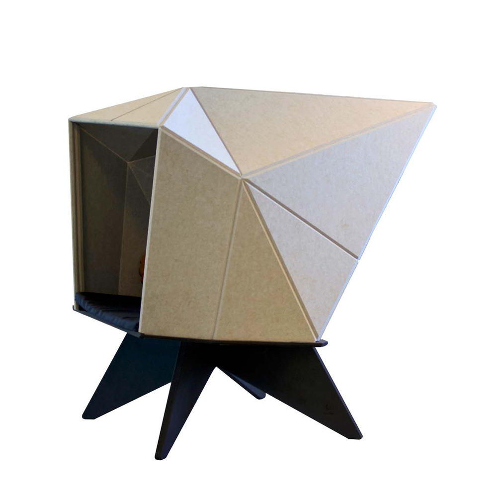 HabiCave is een Deens ontwerp geïnspireerd op de Japanse origami. De eenvoudige esthetiek spreekt de zintuigen aan en het akoestische materiaal helpt niet alleen om het geluidsniveau in de grot te verminderen maar ook in de kamer.