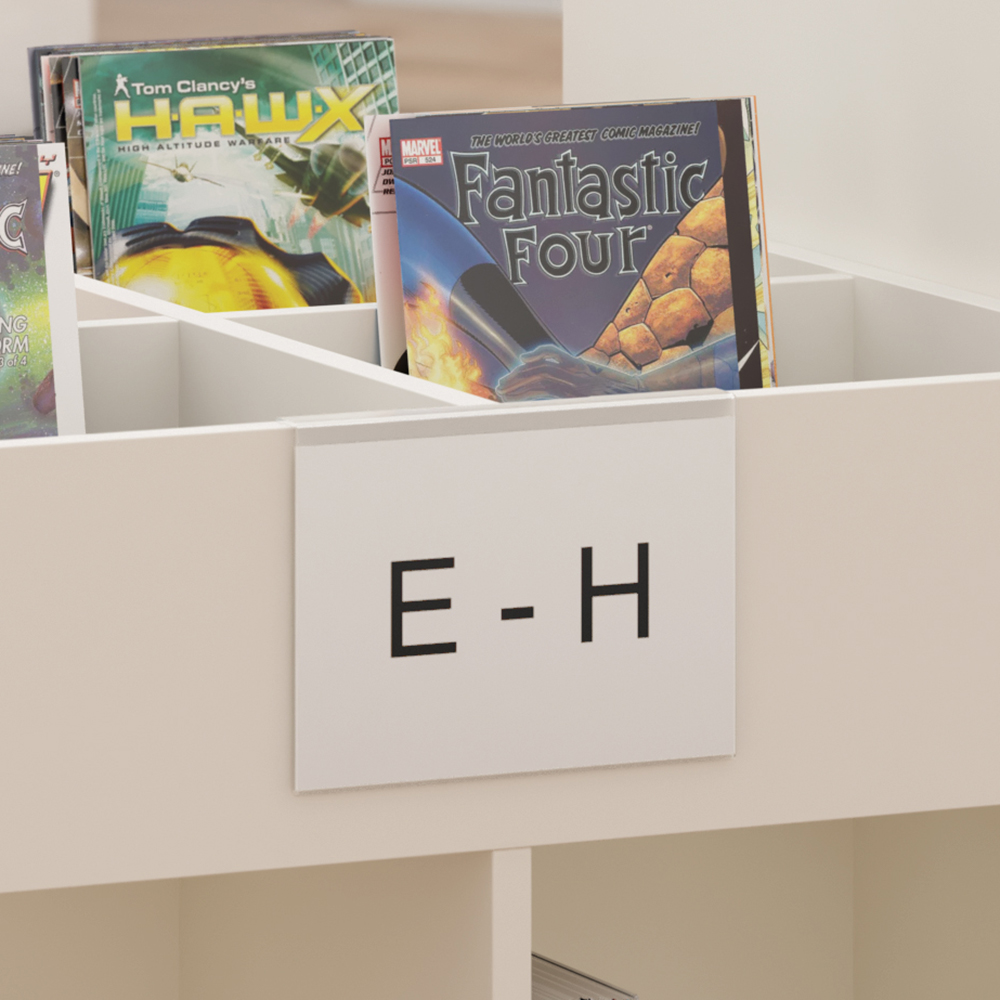 Infohouder met antireflectie folie voor op bv. eindpanelen (max 22 mm) of prentenboekbakken (max 20 mm).