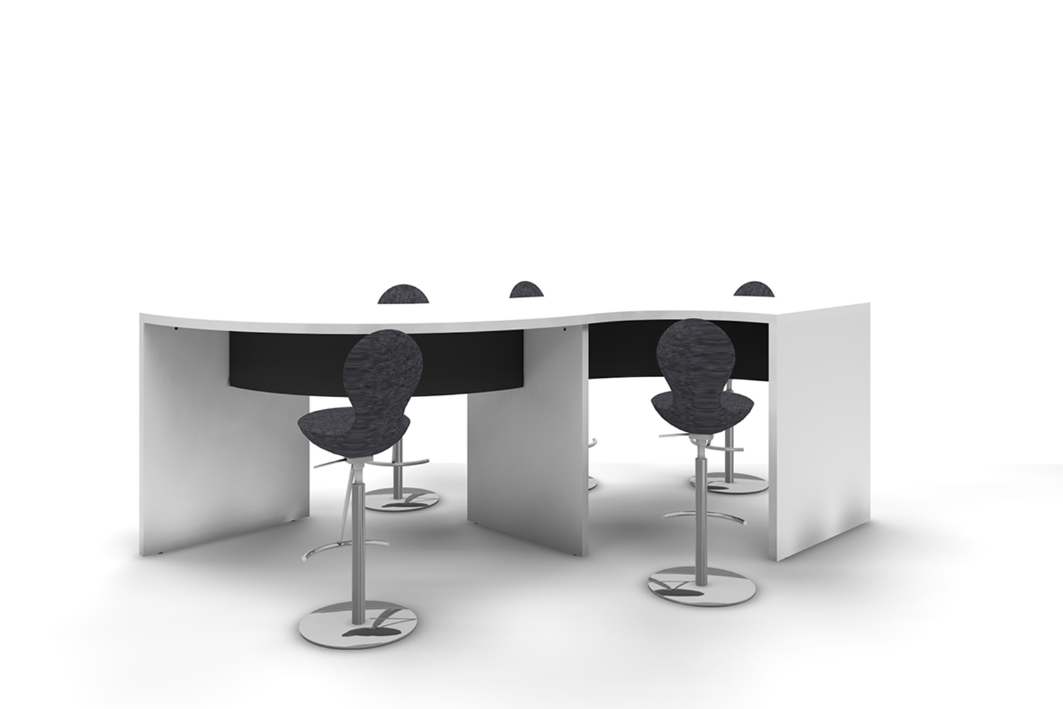 Twin: twee gebogen tafels die een S-figuur vormen met het frontpaneel bijna in het midden geplaatst, waardoor de tafel van beide kanten gebruikt kan worden.