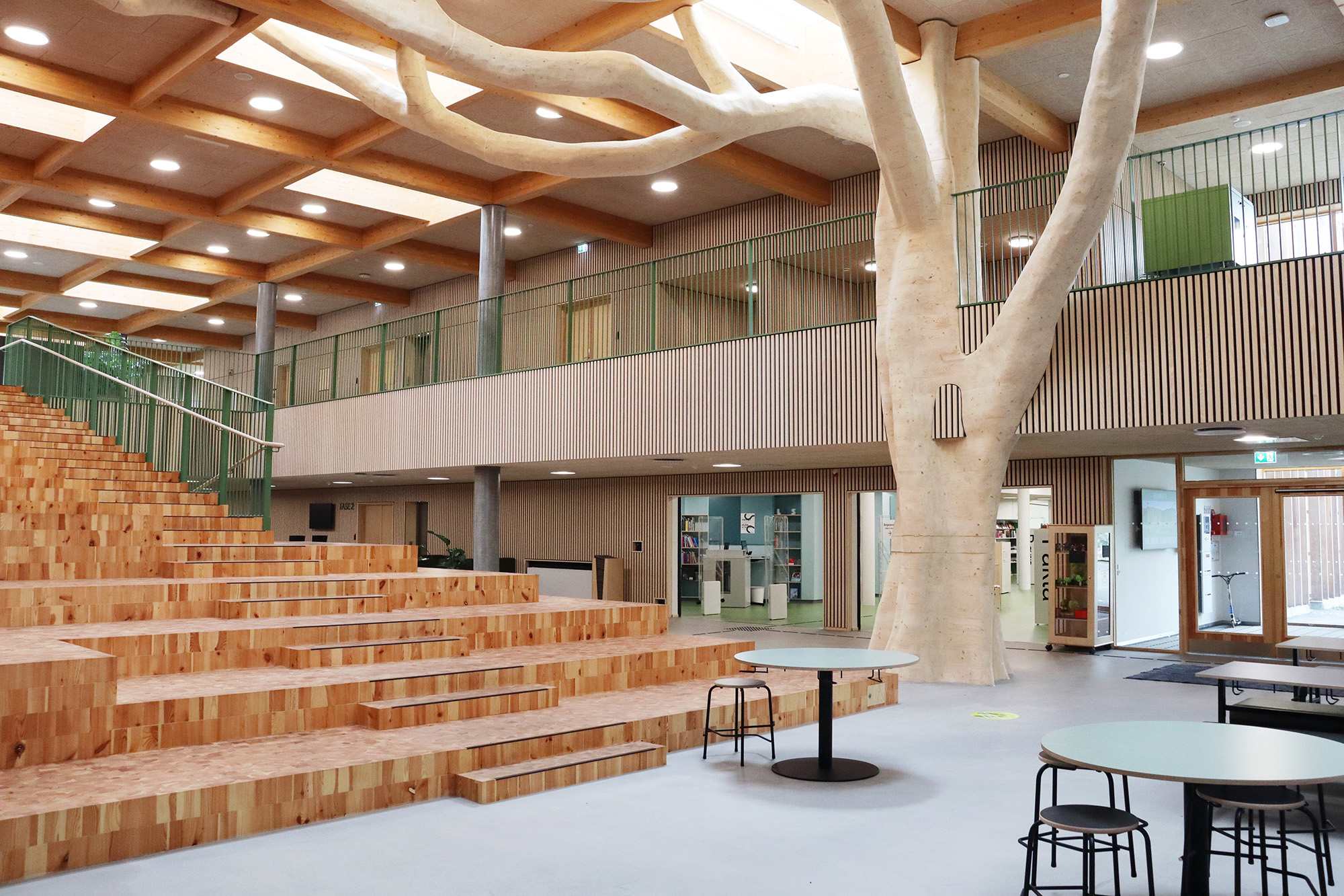 Het Cultuurhuis bouwt voort op een visie op duurzaamheid en is een compleet ecosysteem voor spelen en leren waar natuur en school met elkaar verweven zijn. Bij de entree van het gebouw worden bezoekers opgewacht door de grote boom die aftakt van de begane grond, recht tegenover de bibliotheek, naar de rest van het grote gebouw van 10.000 vierkante meter verdeeld over twee verdiepingen ontworpen door AART Architects.