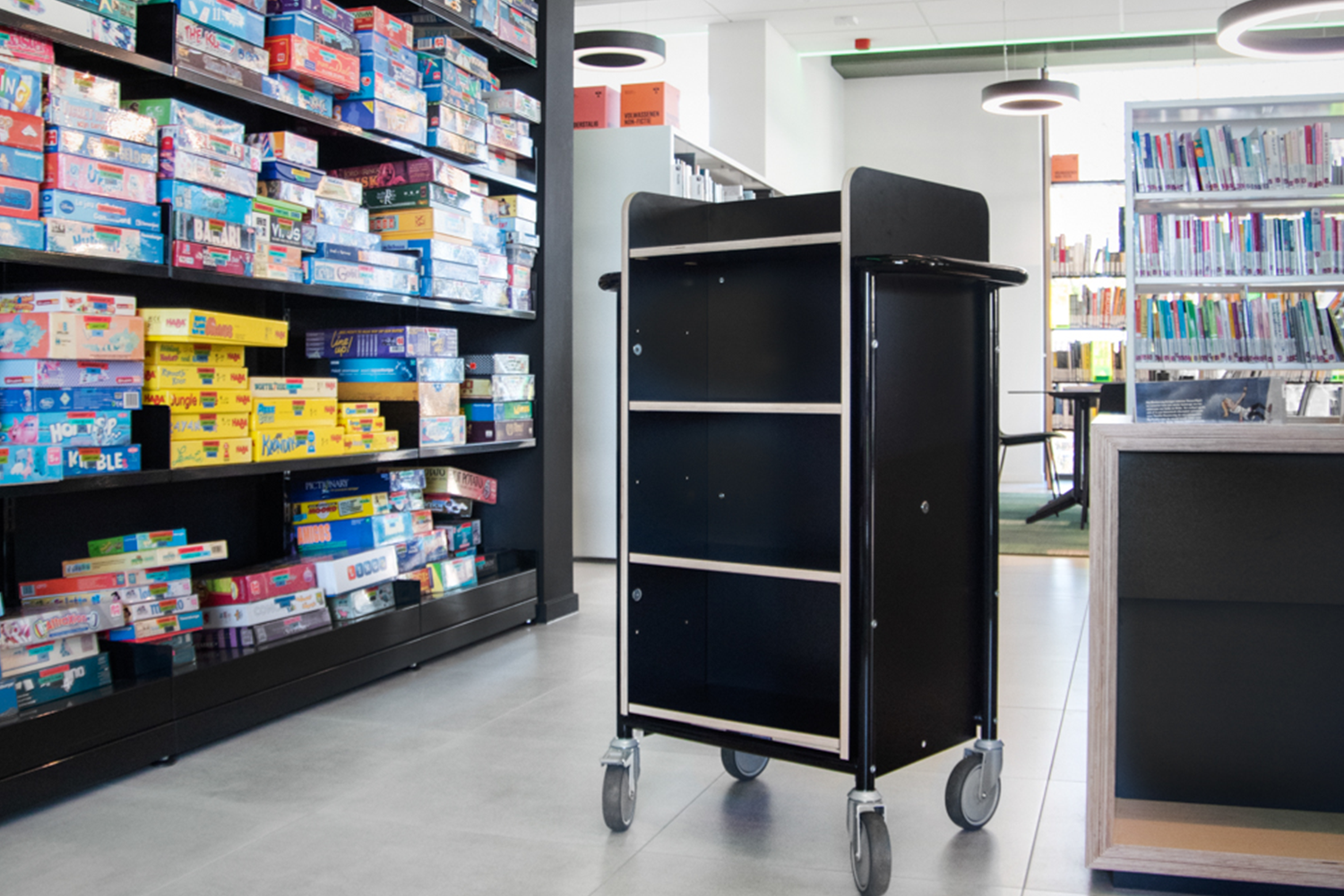 Boekenwagens zijn praktische hulpmiddelen om ingeleverde boeken en andere items te verplaatsen. Plaats boekenwagens bij inleverbalies en -boxen, zodat de boeken na ontlening weer vlot op hun plaats in het rekkensysteem terechtkomen.
