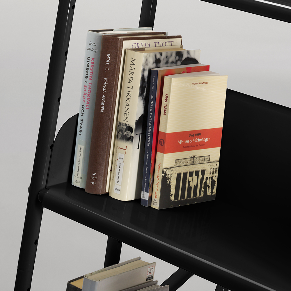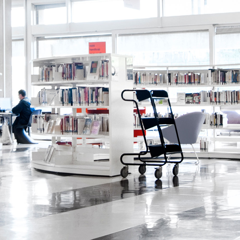 Enkelzijdige, stabiele metalen boekenwagen met drie schuine, afneembare en omkeerbare legborden voor verschillende soorten media en boeken. Plaats de legborden waar nodig d.m.v. de gaten in het frame.
