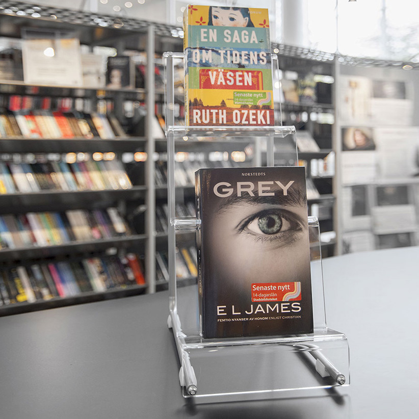 Vrijstaande, enkelzijdige standaard voor boekendisplay, met 3 verdiepingen.