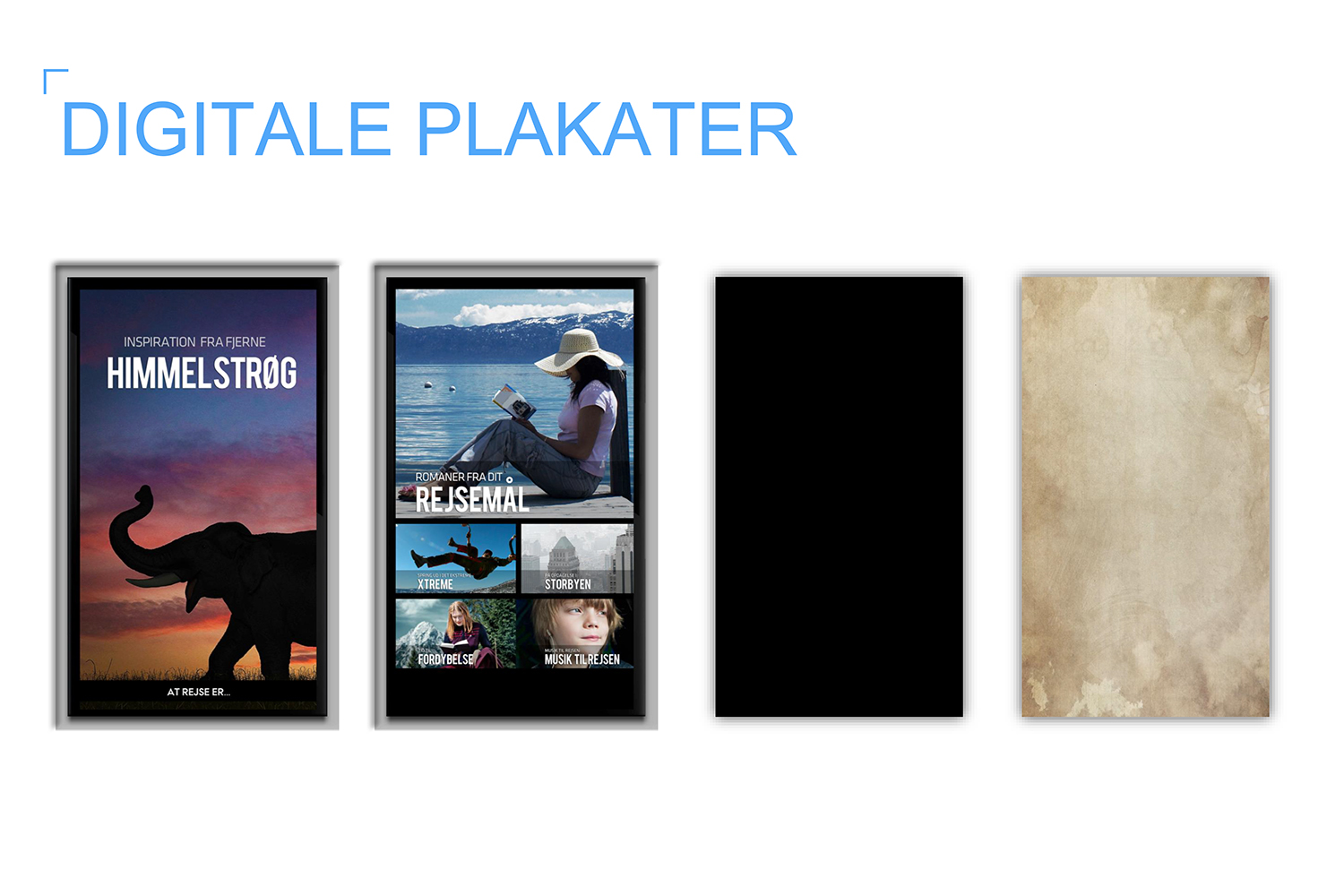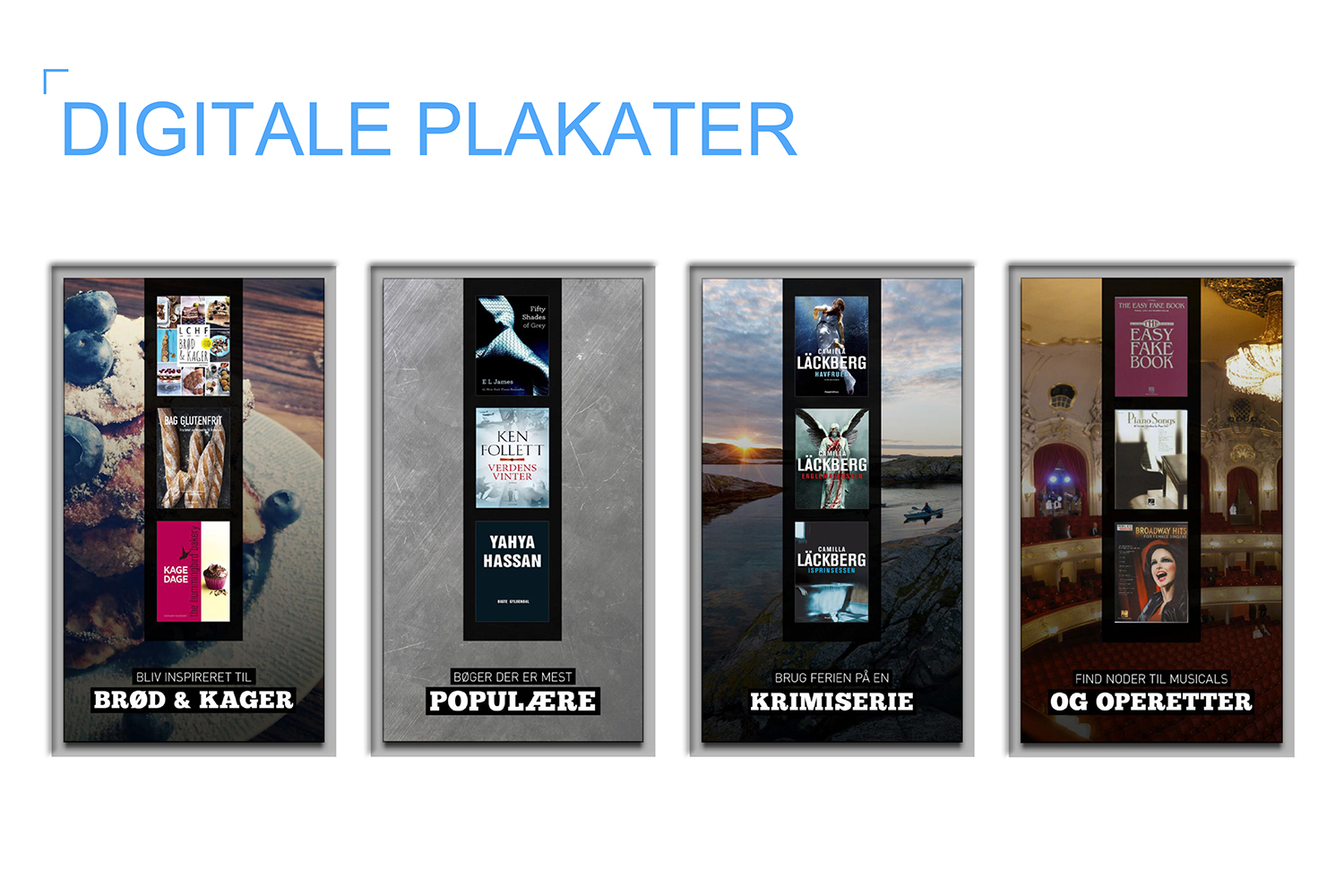 Digitale posters maken een bibliotheek dynamisch en marktgericht. Met gloednieuwe technologie kunt u alle mogelijke boodschappen overbrengen! Hier kunt u boeken, evenementen, campagnes en thema's promoten. Voor veel van het materiaal kan er automatisch inhoud worden gedownload via externe bronnen, er kan inhoud worden geüpdatet uit de evenementenkalender en de diensten van de bibliotheek kunnen steeds worden gepromoot.
