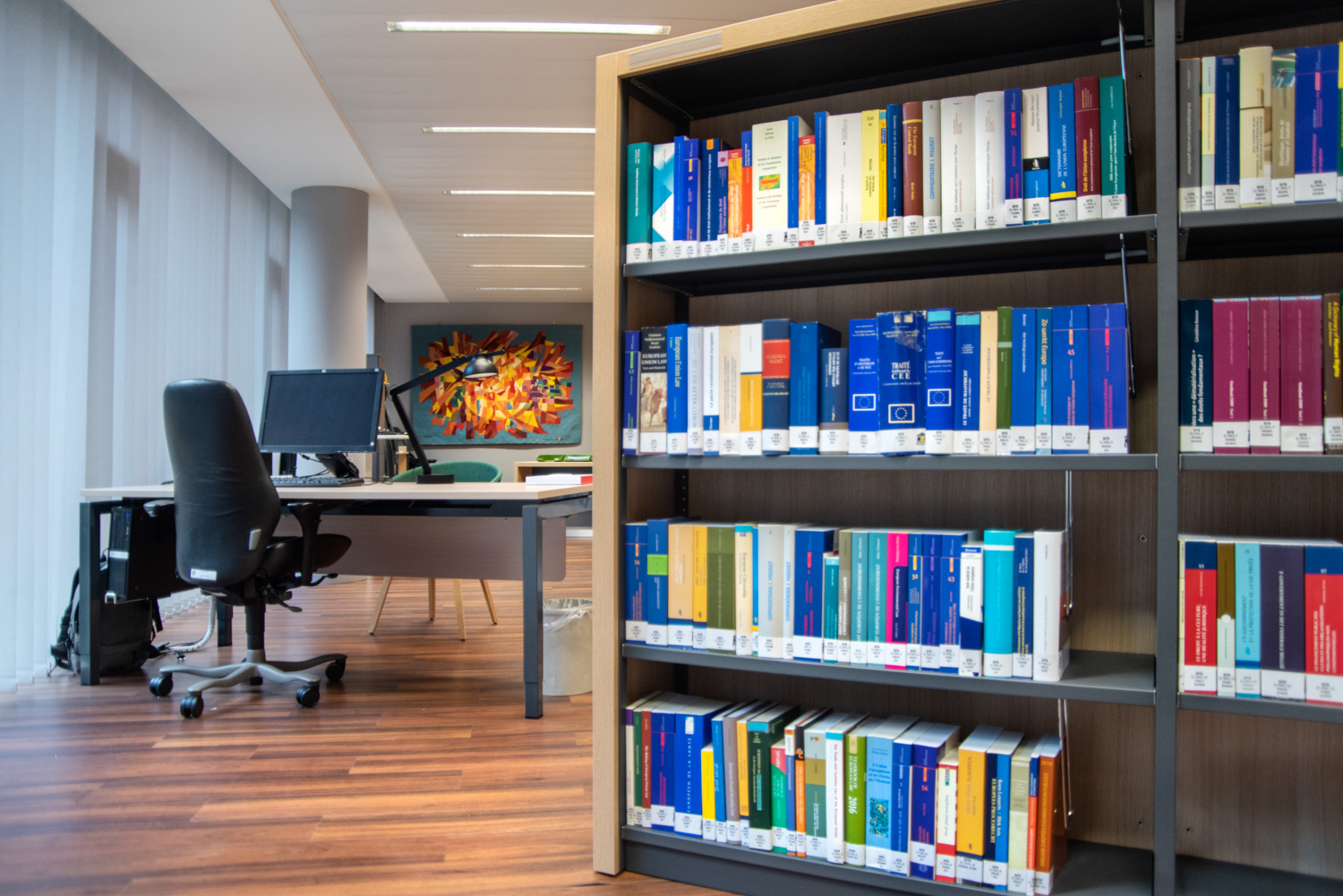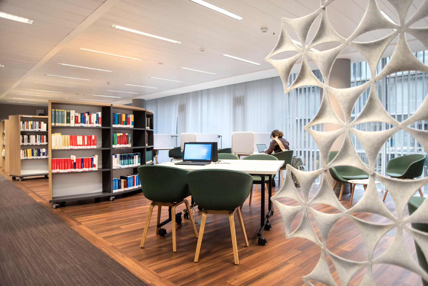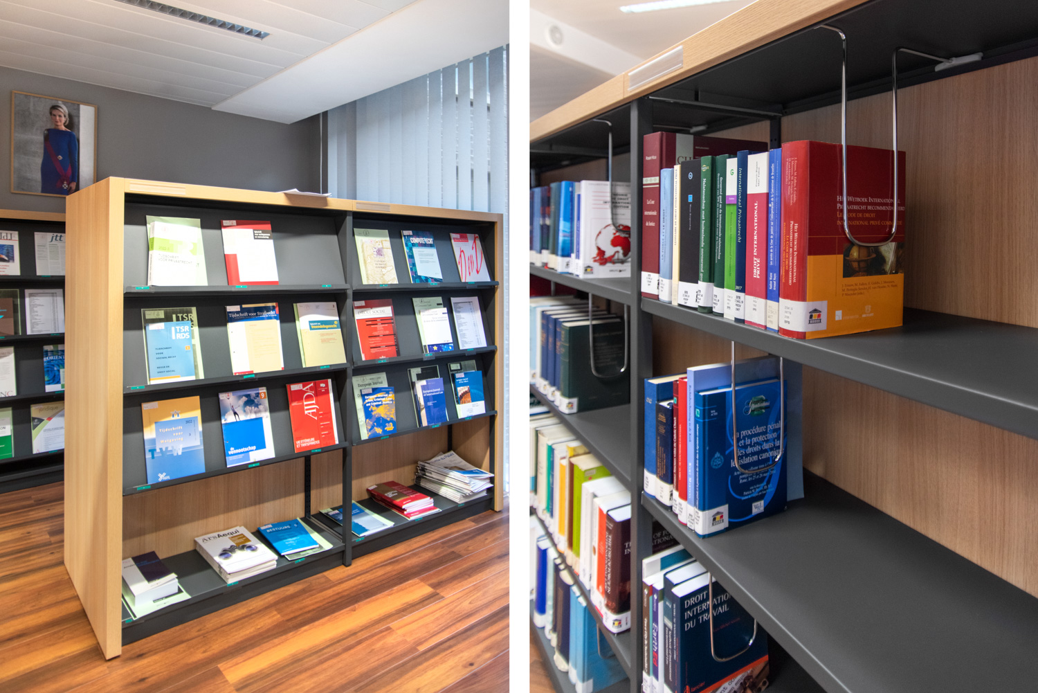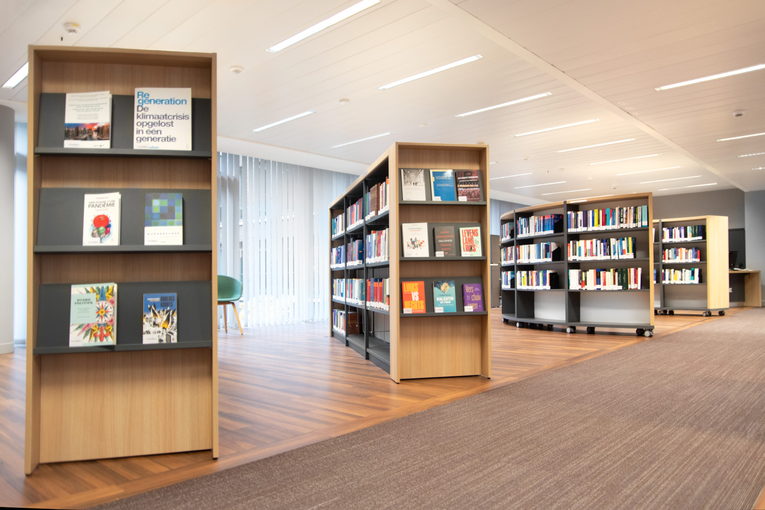 De ronde rekken verlenen de inrichting een ongedwongen karakter. Verschillende types stoelen en fauteuils laten de keuze aan de lezer om haar of zijn lievelingsplekje te vinden. Het kleurenpallet verwijst naar de huisstijl van De Kamer van Volksvertegenwoordigers en draagt bij tot de leeszaal als comfortabel rustpunt.