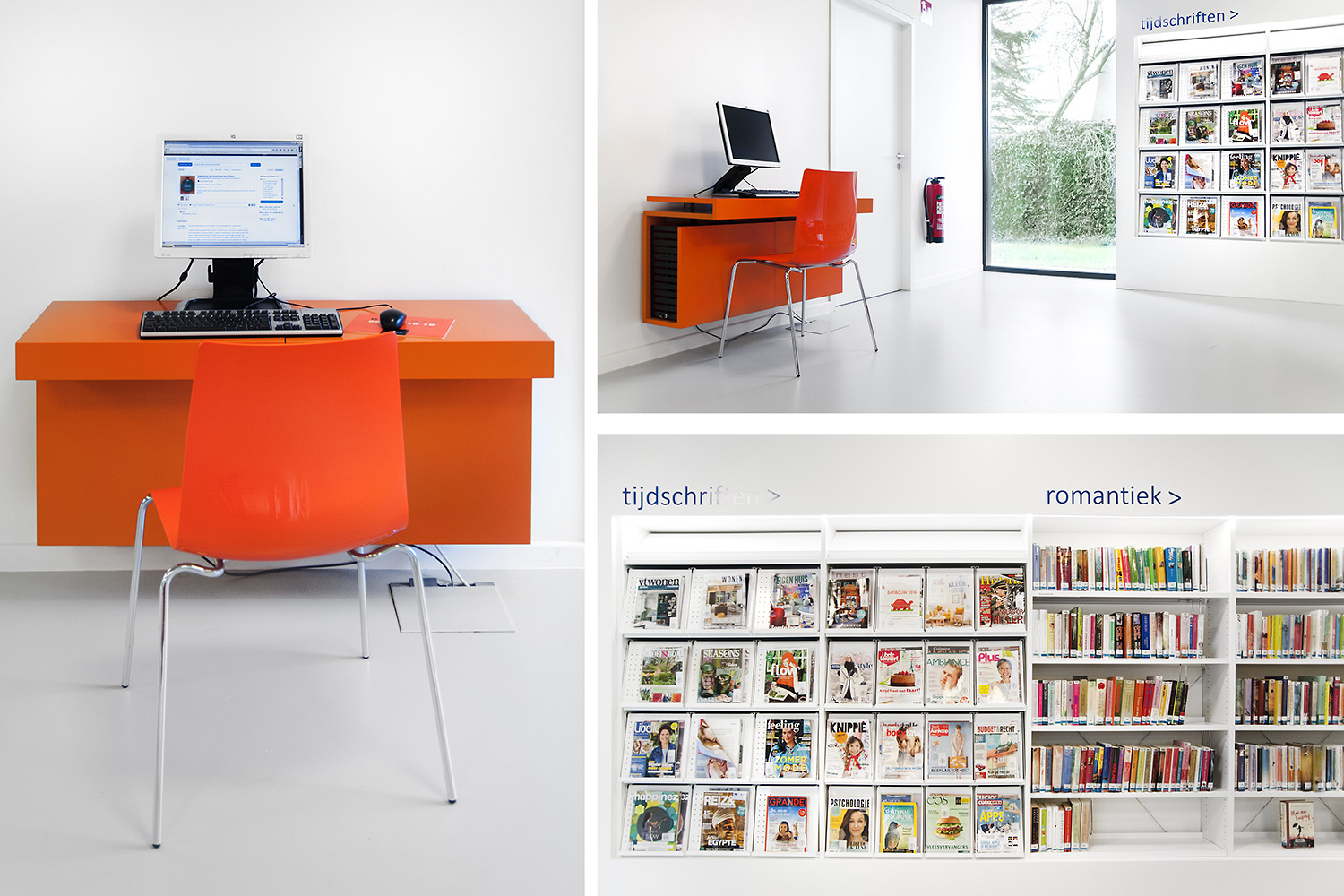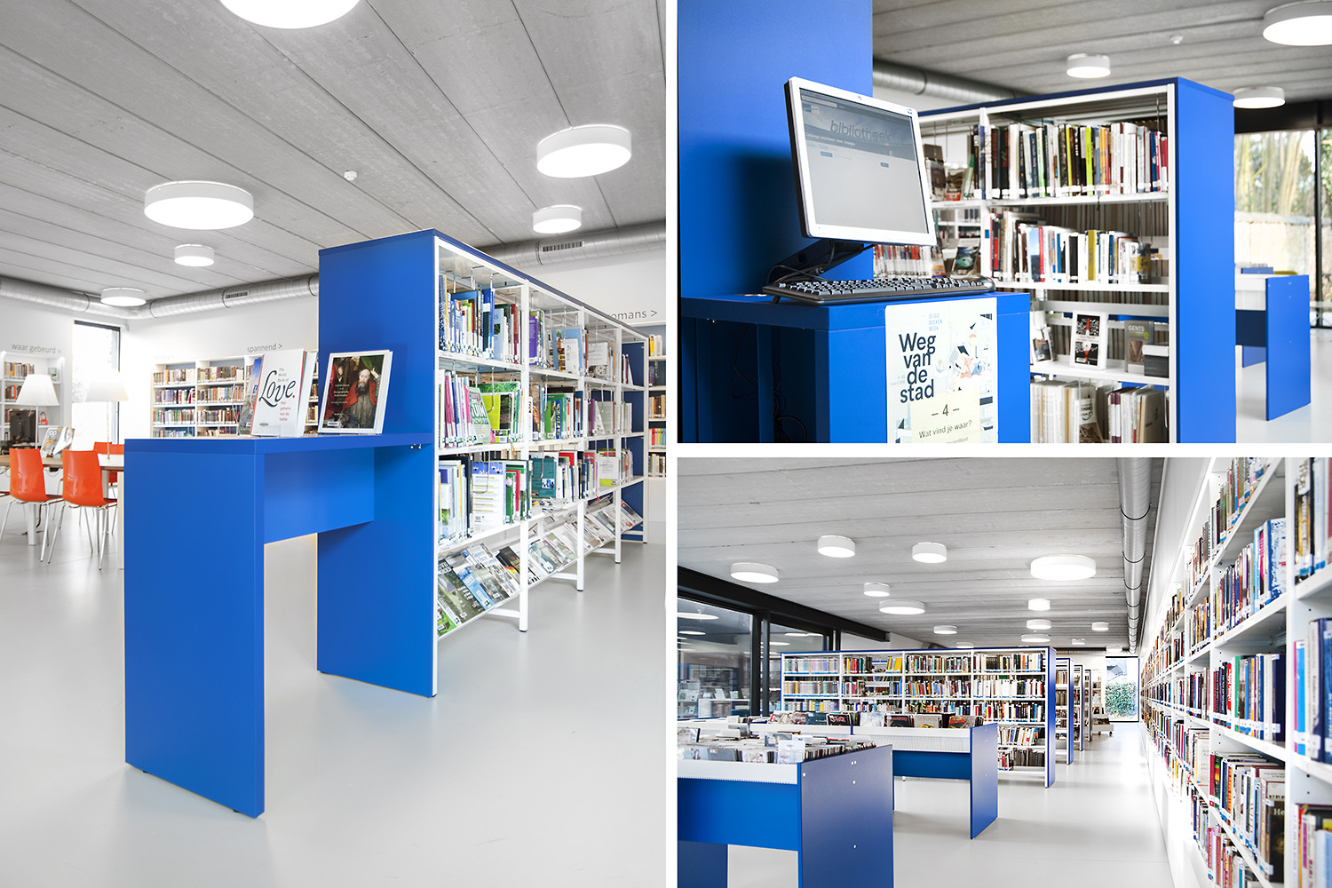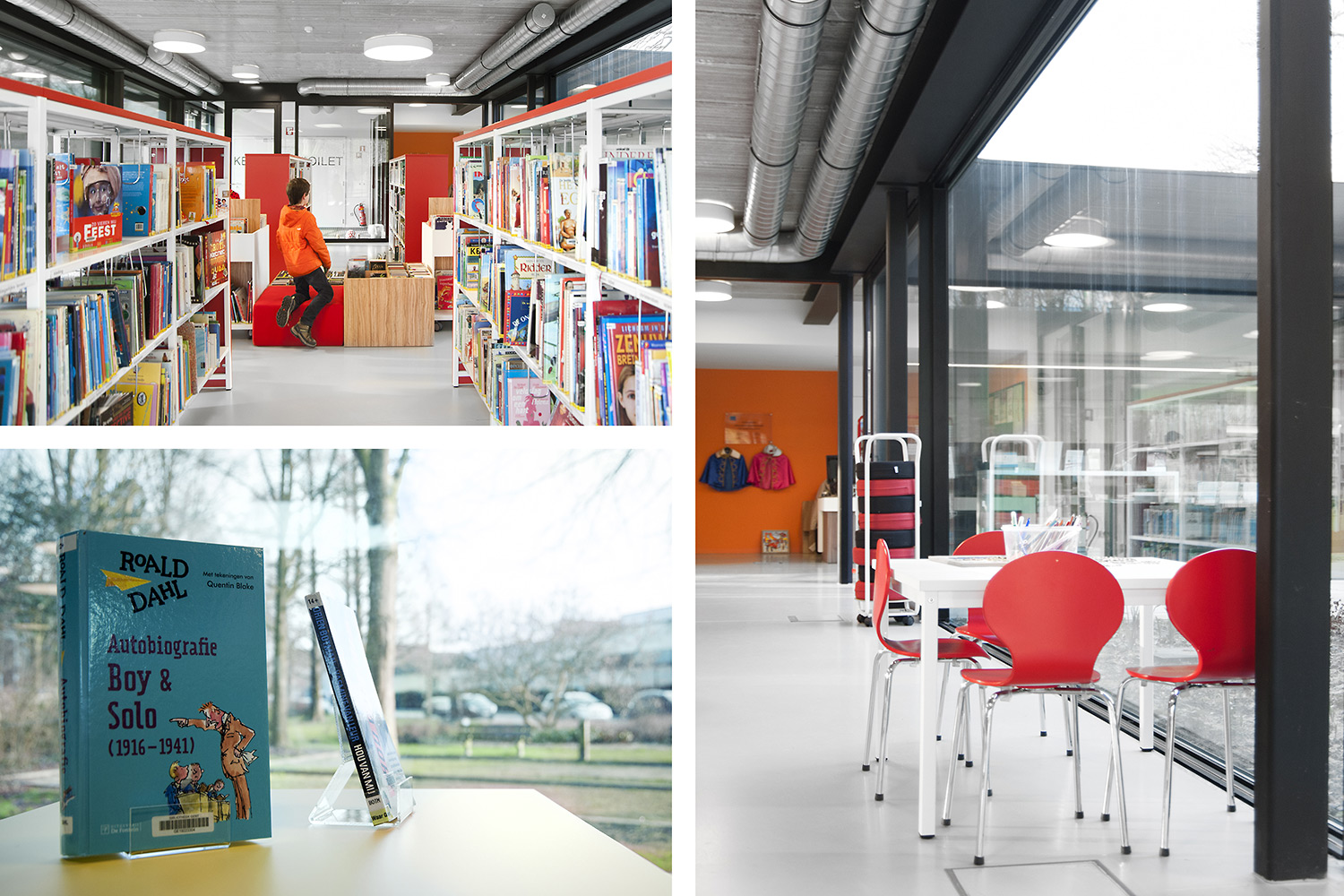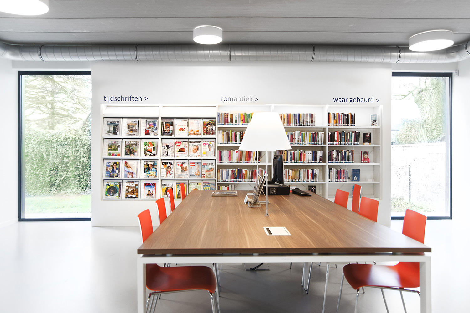 Het overvloedige daglicht en het zicht naar het park vormen de basis voor een aangename bibliotheek in een modern, tijdloos design. Enkele kleuraccenten leggen een link met de verschillende doelgroepen. Wandrekken werden omkast om de strakke lijn te behouden.