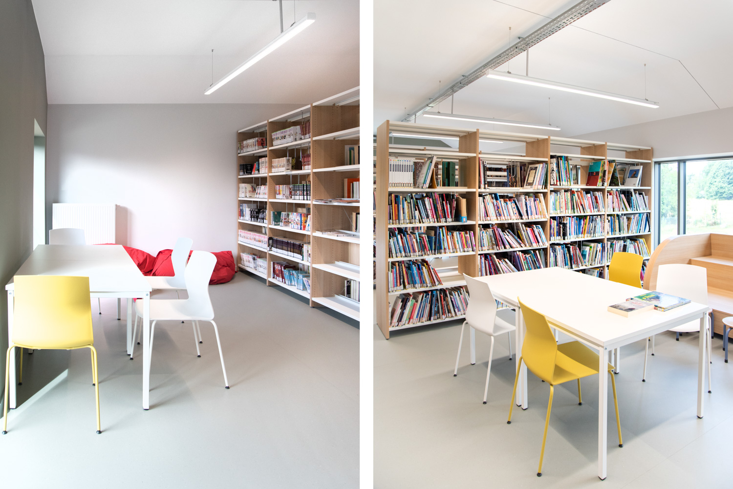 De bibliotheek van Florenville maakt deel uit van een gemeentelijk project om verschillende actoren samen te brengen in één gebouw. De ruime balie bij de ingang is gemakkelijk toegankelijk voor mensen met beperkte mobiliteit. De houten bibliotheekrekken zijn mooi gecombineerd met kleurrijke zitmeubels.