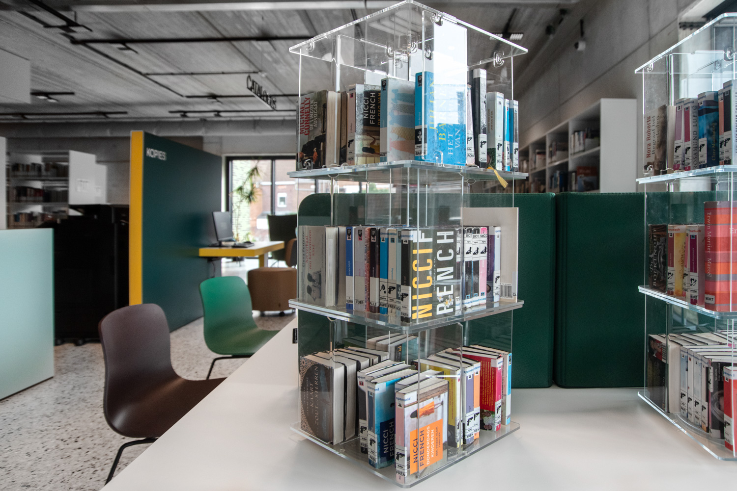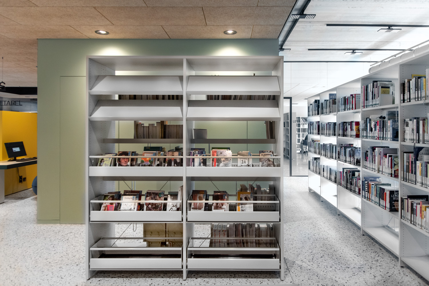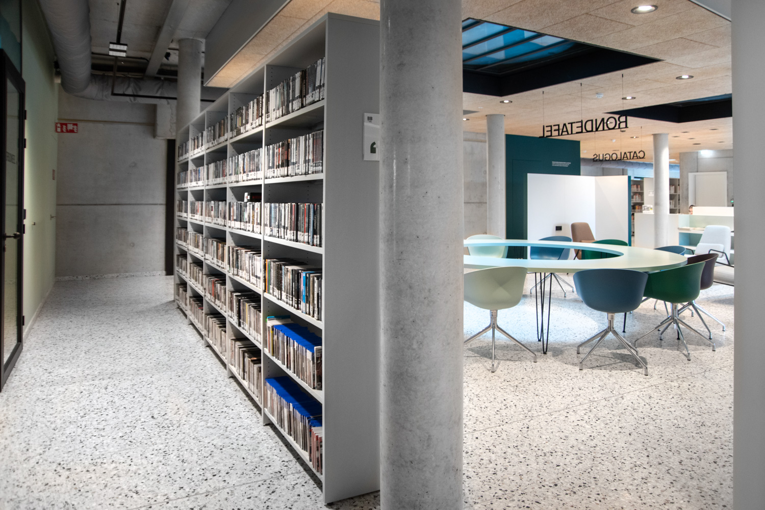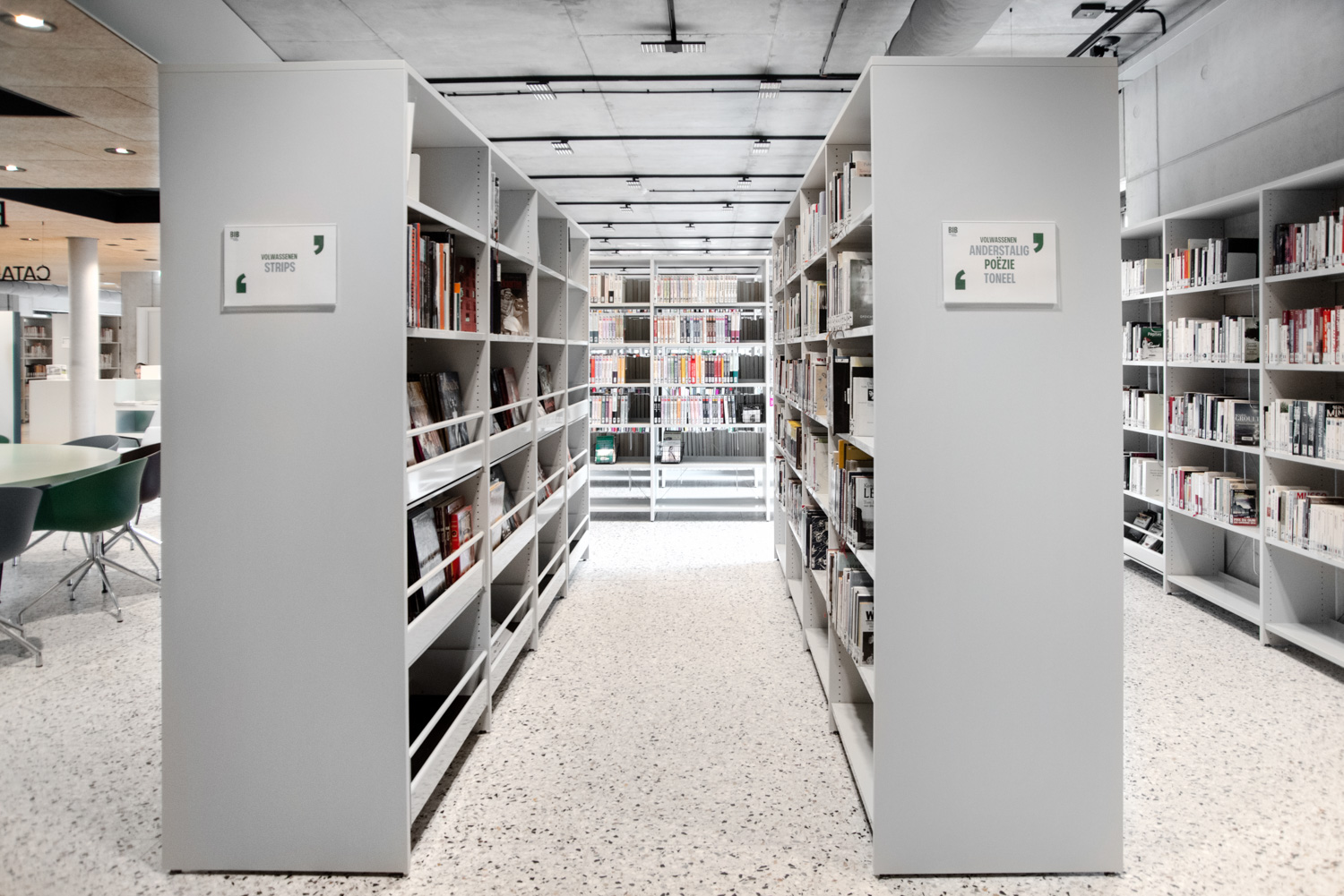 Doorheen de bibliotheek zijn de rekken in het wit uitgevoerd om alle aandacht aan de inhoud – de boeken – te laten. Het hedendaags kleurenpallet van het gebouw werd doorgetrokken in het meubilair en het maatwerk. Een verschil van dag en nacht met de oude locatie.
