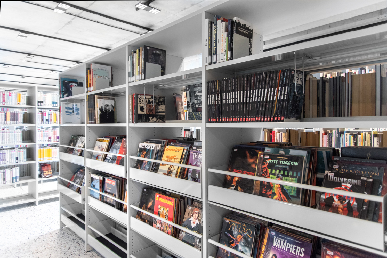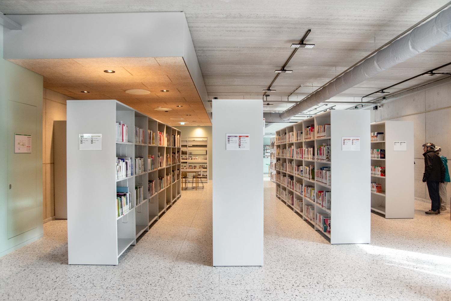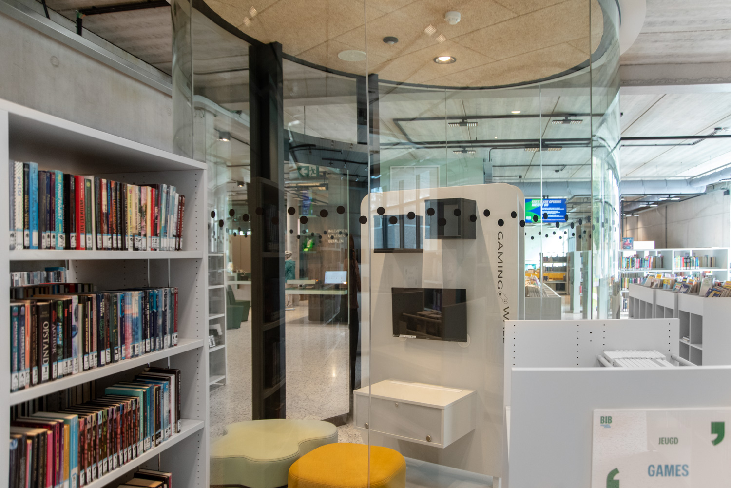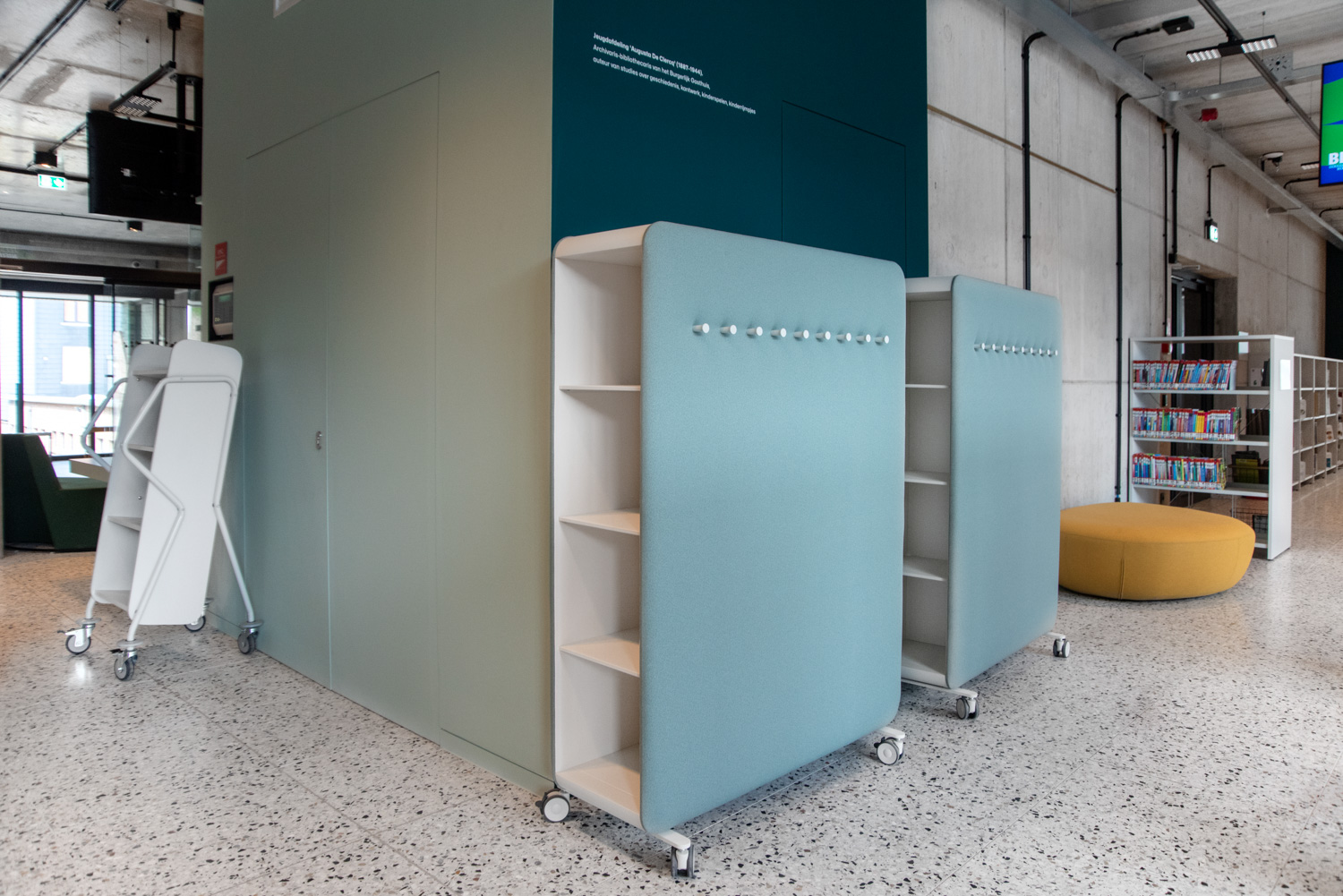 Doorheen de bibliotheek zijn de rekken in het wit uitgevoerd om alle aandacht aan de inhoud – de boeken – te laten. Het hedendaags kleurenpallet van het gebouw werd doorgetrokken in het meubilair en het maatwerk. Een verschil van dag en nacht met de oude locatie.