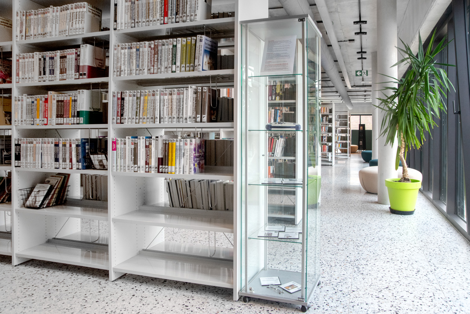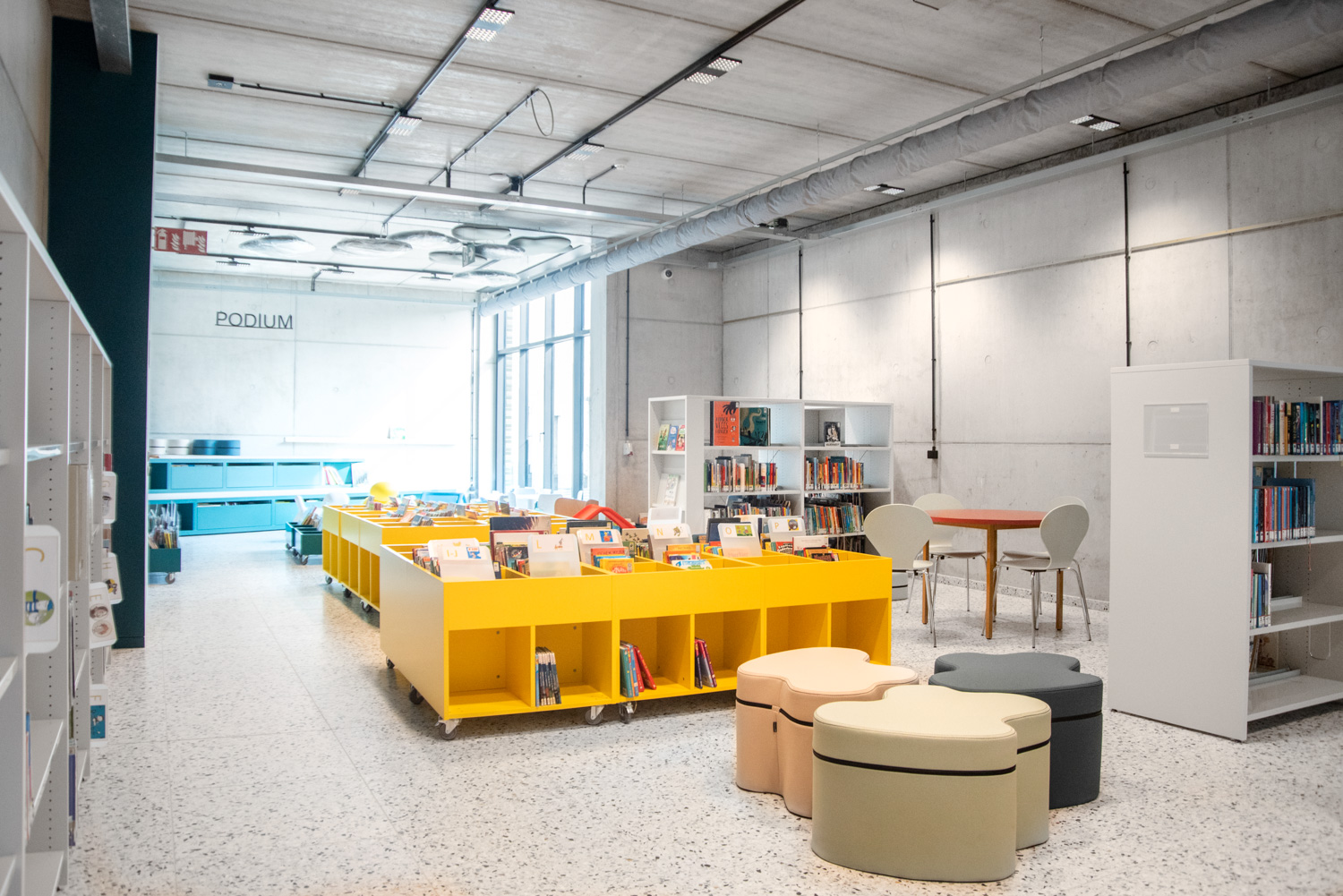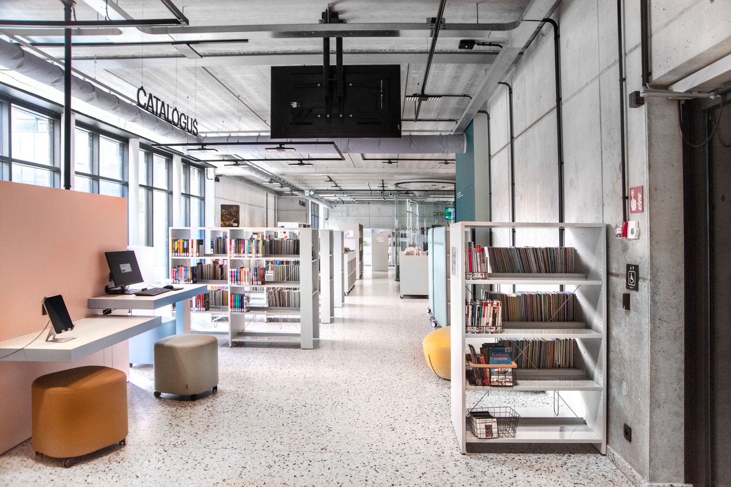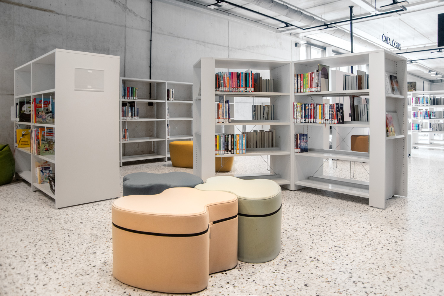 Doorheen de bibliotheek zijn de rekken in het wit uitgevoerd om alle aandacht aan de inhoud – de boeken – te laten. Het hedendaags kleurenpallet van het gebouw werd doorgetrokken in het meubilair en het maatwerk. Een verschil van dag en nacht met de oude locatie.
