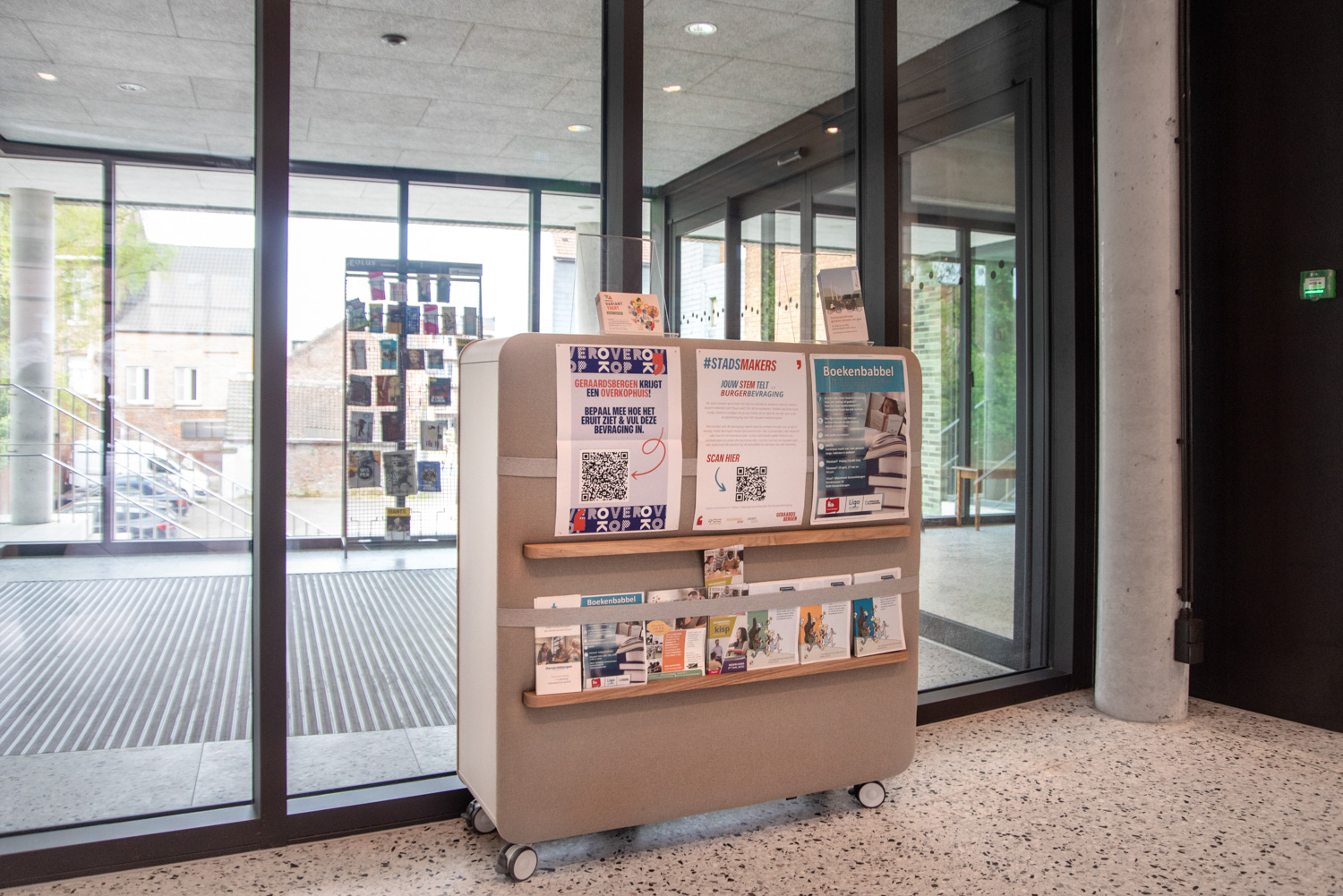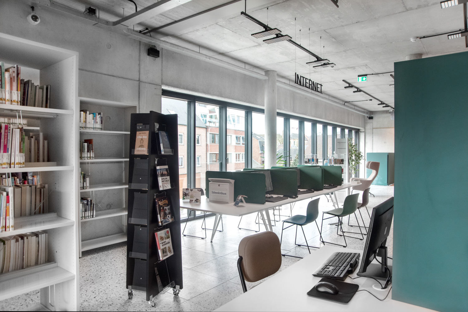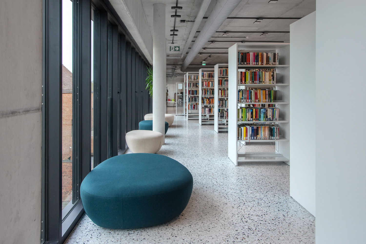 Licht en ruimte staan centraal in de nieuwe bibliotheek van Geraardsbergen. De bib is meer dan een plaats om een boek te lenen; je kan er ter plekke lezen, studeren, gamen, enz. De bezoeker kan kiezen uit verschillende zitmeubels: tafels en stoelen om aan te werken of studeren, gezellige comfortabele leesfauteuils om in achterover te leunen, poefjes om snel een boek te consulteren.
