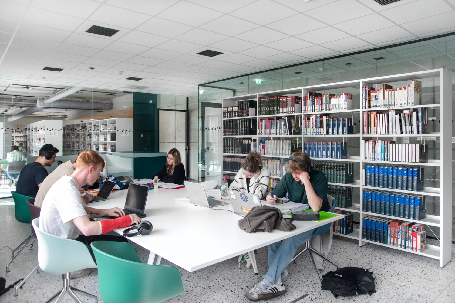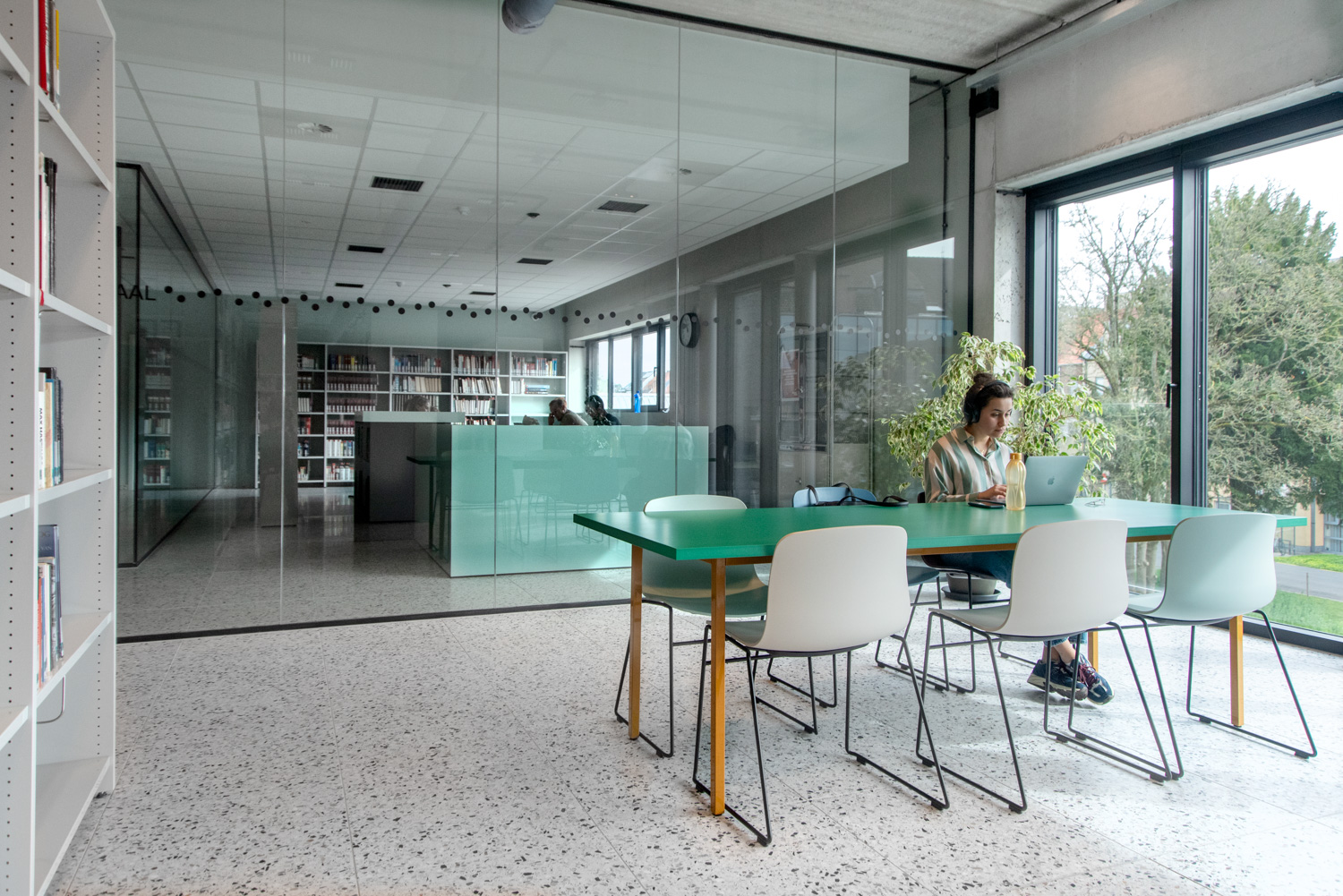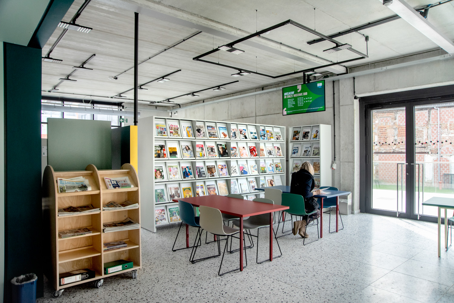 Licht en ruimte staan centraal in de nieuwe bibliotheek van Geraardsbergen. De bib is meer dan een plaats om een boek te lenen; je kan er ter plekke lezen, studeren, gamen, enz. De bezoeker kan kiezen uit verschillende zitmeubels: tafels en stoelen om aan te werken of studeren, gezellige comfortabele leesfauteuils om in achterover te leunen, poefjes om snel een boek te consulteren.