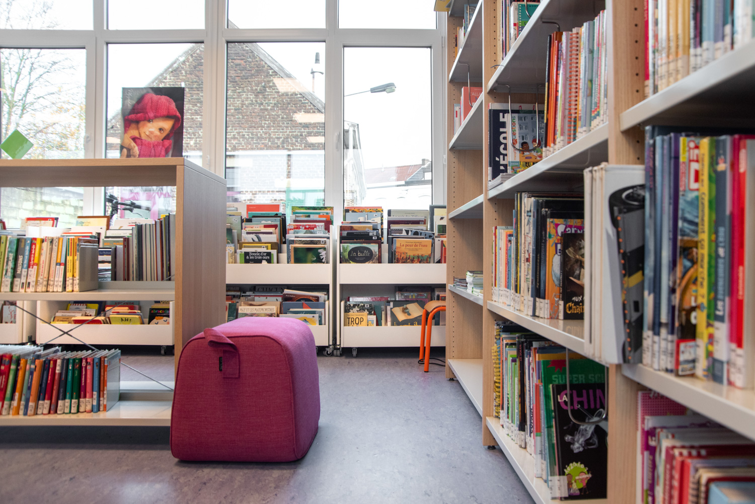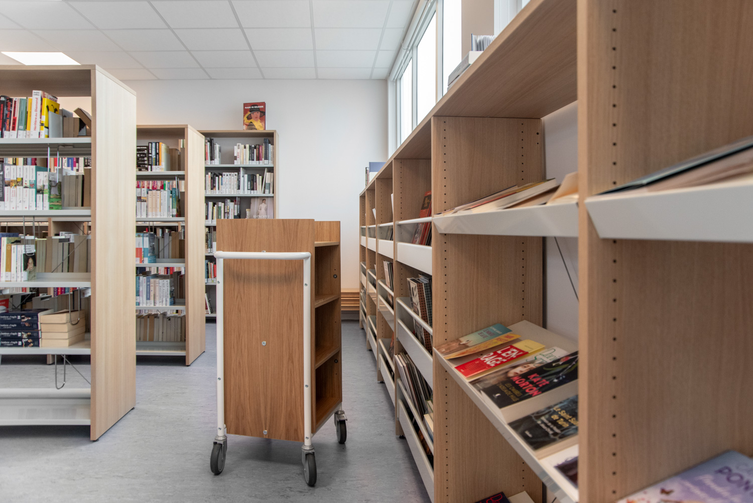 Omdat asbest moest verwijderd worden uit het gebouw, maakte het bestuur van de gelegenheid gebruik om de bibliotheek opnieuw in te richten met het oog op meer gezelligheid. Er zijn minder rekken dan voorheen wat een betere circulatie mogelijk maakt. De bib is opgesplitst in twee verschillende ruimtes gescheiden door een entreegang: een kant voor de jeugd en een kant voor volwassenen. De ruimtes zijn visueel aan elkaar gelinkt door hetzelfde kleur- en materiaalgebruik.