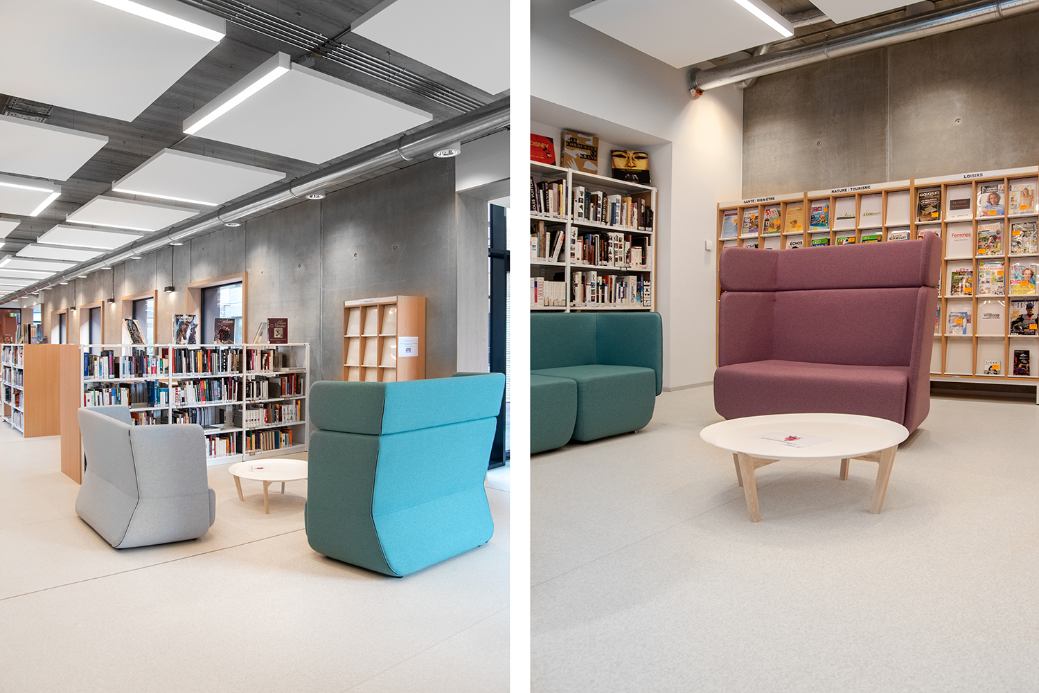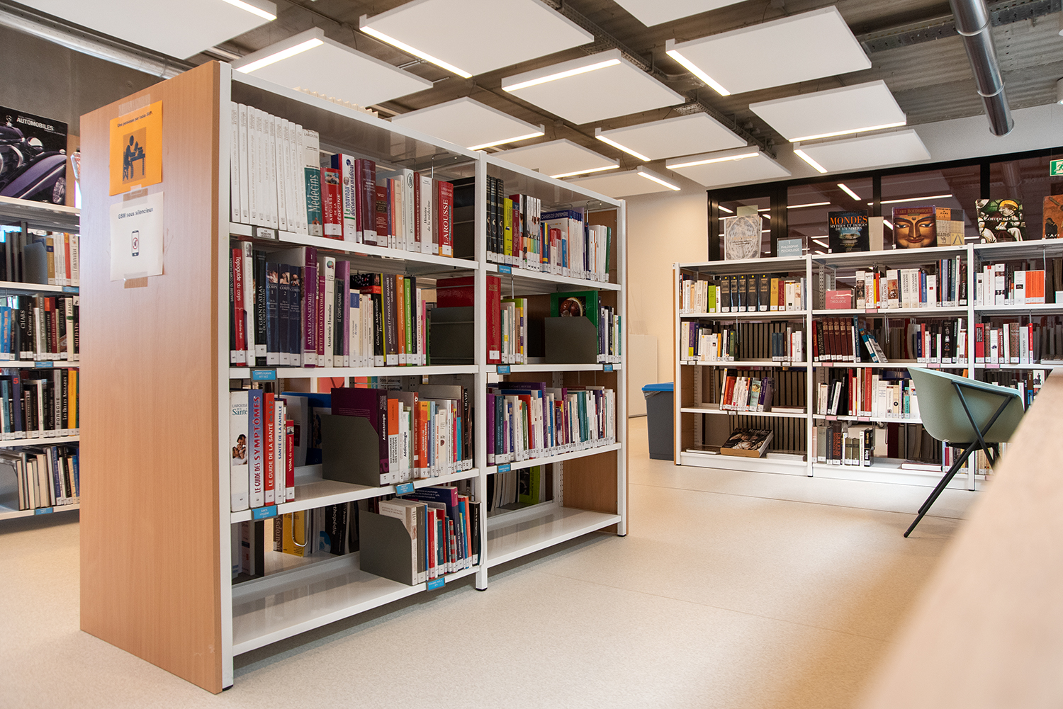 Bijzondere aandacht is besteed aan de materiaalkeuze en hun duurzaamheid. Het resultaat: een gezellig en verfijnd interieur. Het publiek waardeert het comfortabele en lichte interieur, waar je je goed voelt. Mevrouw Rossi citeert Gaston Bachelard om het belang van een hedendaagse bibliotheek te benadrukken: "Het paradijs is, zonder enige twijfel, slechts een enorme bibliotheek".