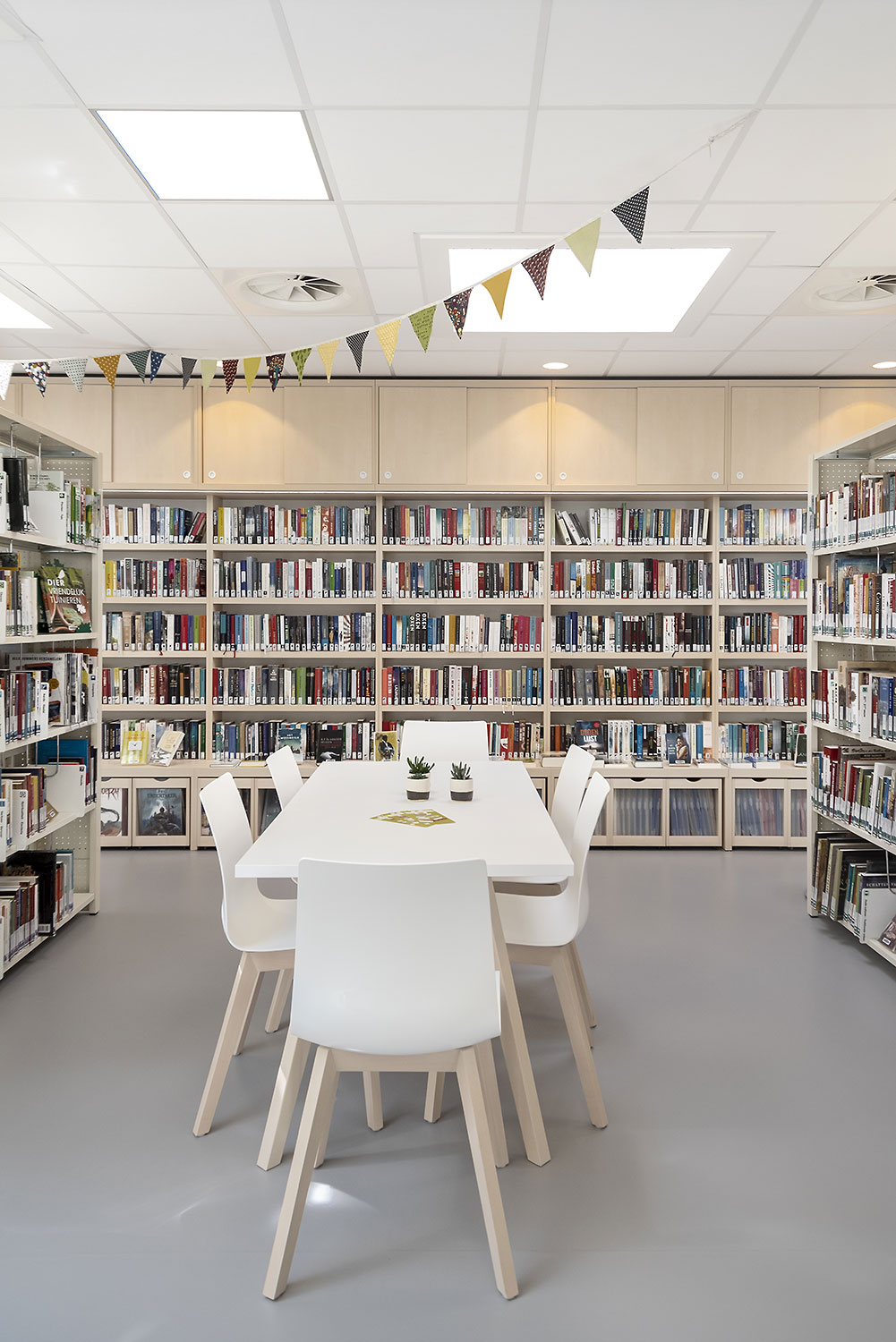 Voor de nieuwe bib koos men resoluut voor kleurenharmonie: witte muren en rekken, afgewisseld met toetsen berkenhout. De bezoekers waarderen het daglicht, de esthetiek en gezelligheid van de huiselijke inrichting en blijven dan ook graag wat langer hangen. De bib als een warme huiskamer in de stad…
