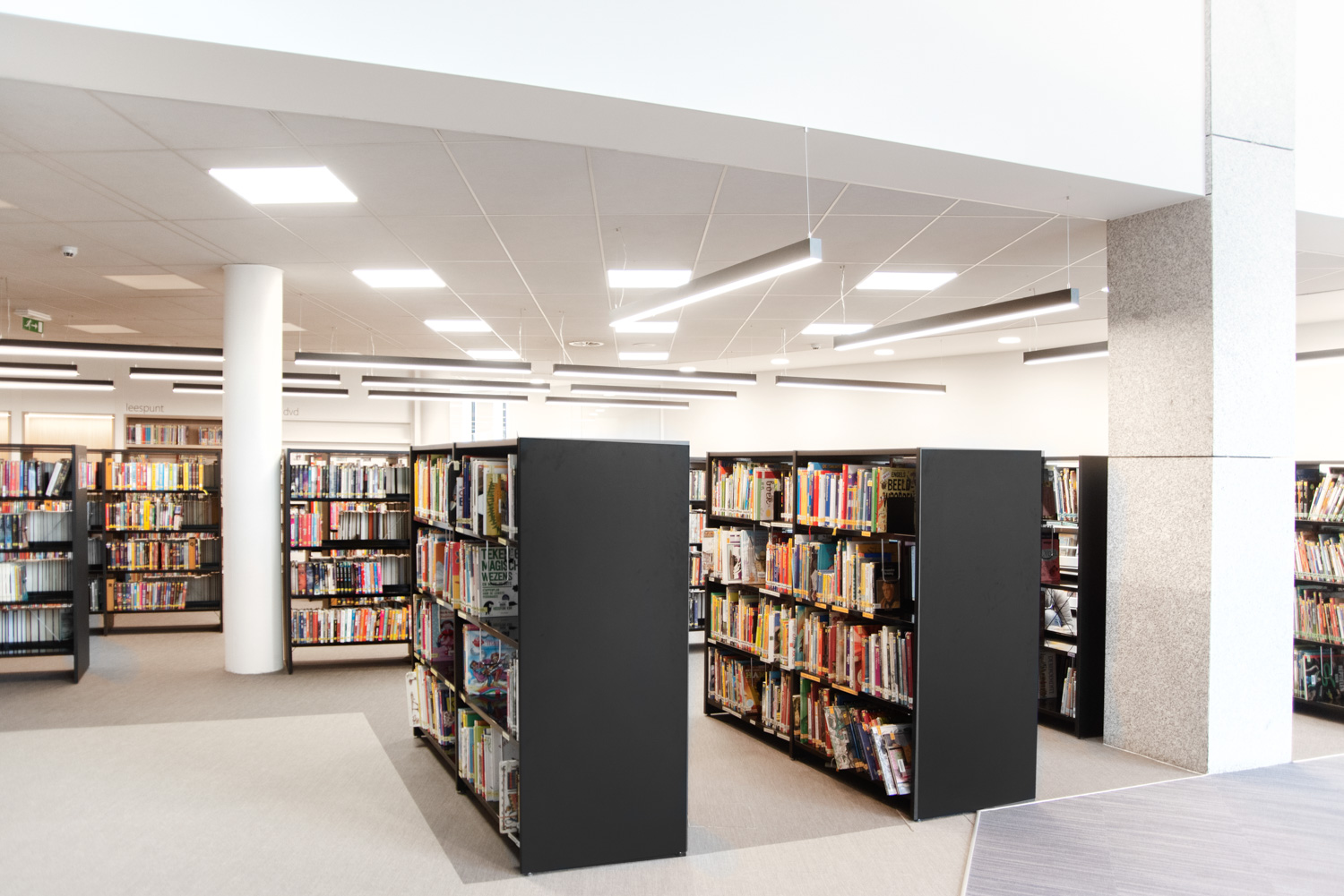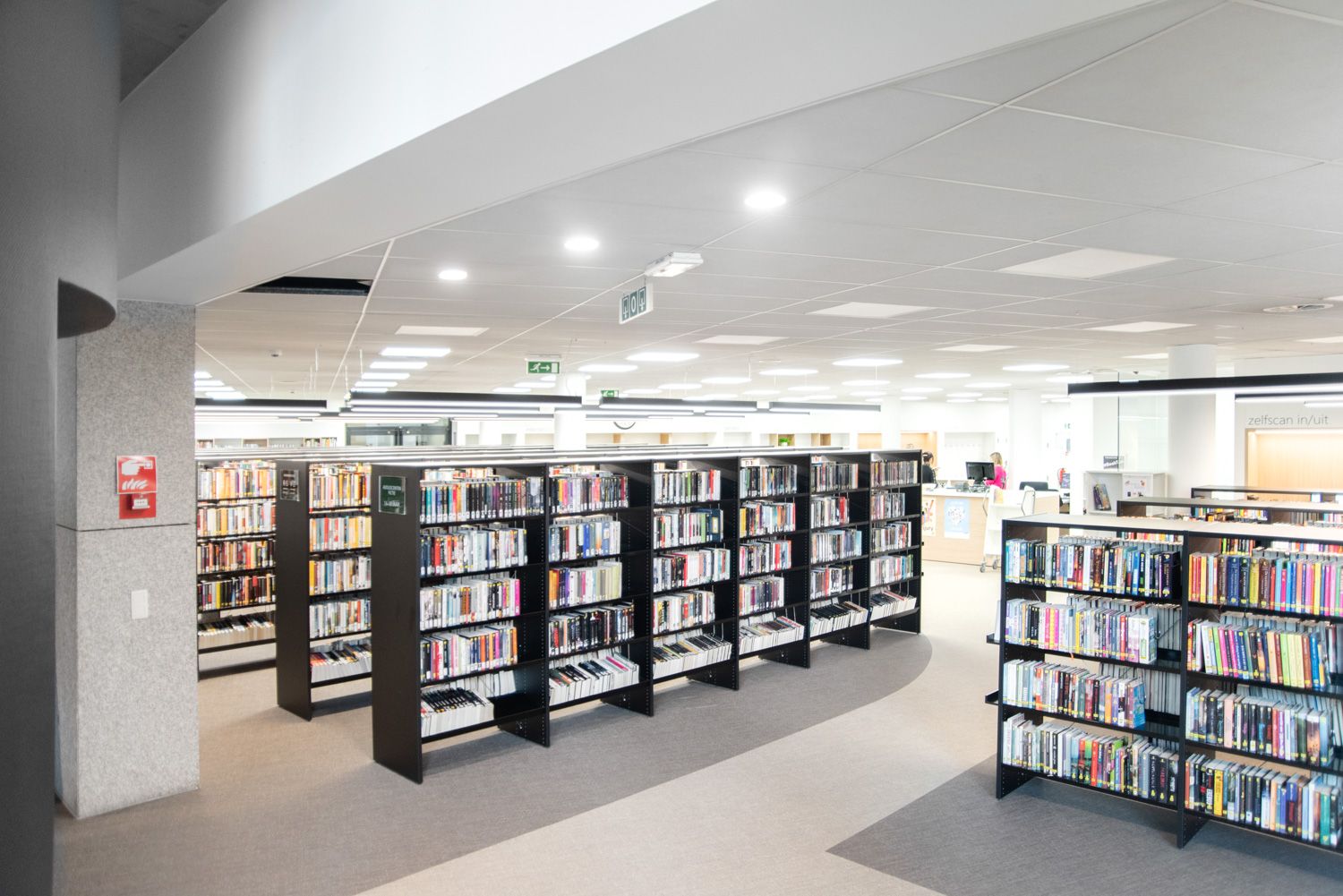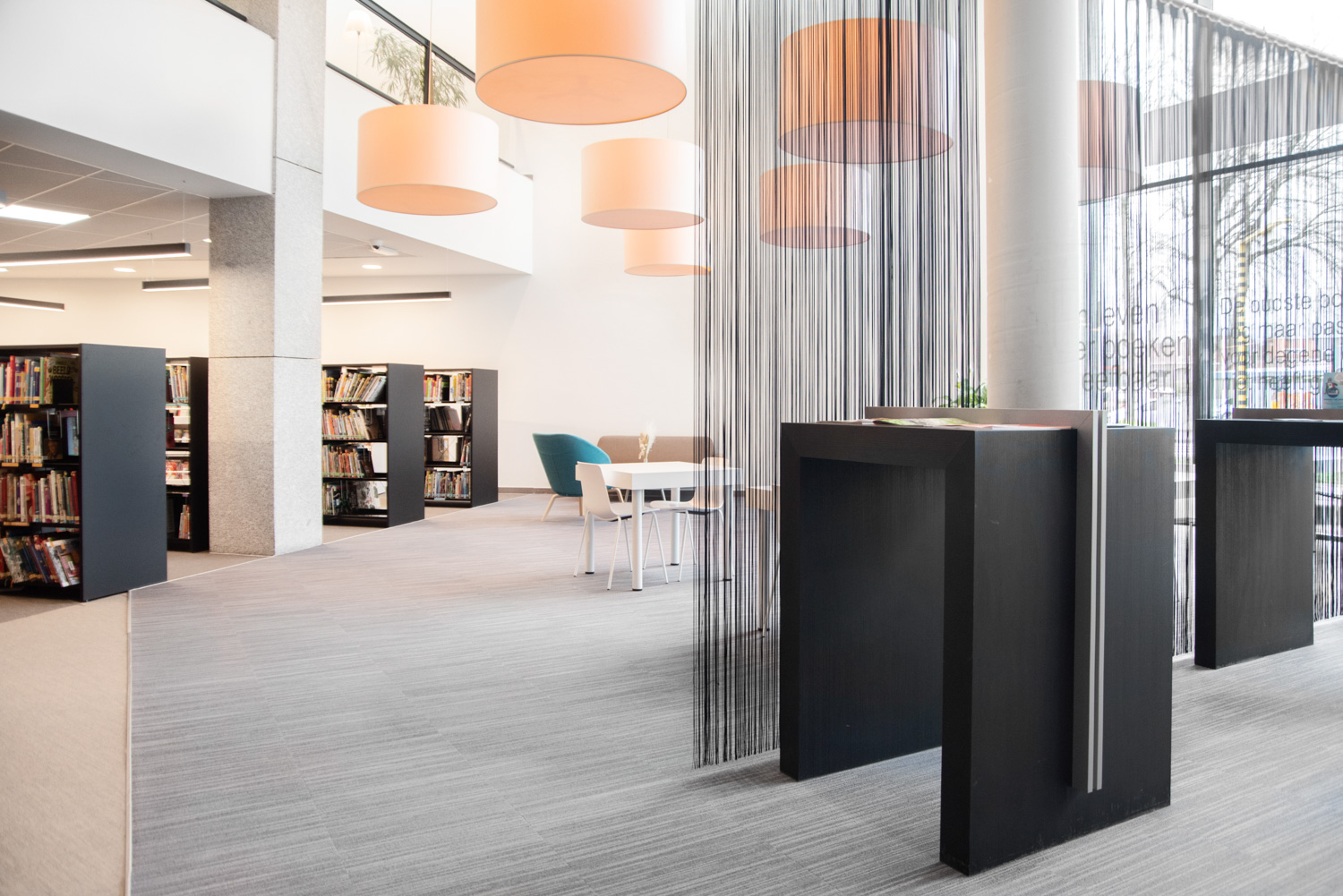 De bibliotheek werd omgetoverd tot een gezellige huiskamer, waar het aangenaam vertoeven en ontspannen is. Want mensen komen niet alleen naar de bibliotheek om boeken te lenen; ze gebruiken de bibliotheek ook om rustig te studeren, de krant te lezen of een praatje te maken. Daarom werden er comfortabele lounges geïnstalleerd. Nieuwe aanwinsten worden zowel bij de ingang als op de eindpanelen van de rekken gepresenteerd.