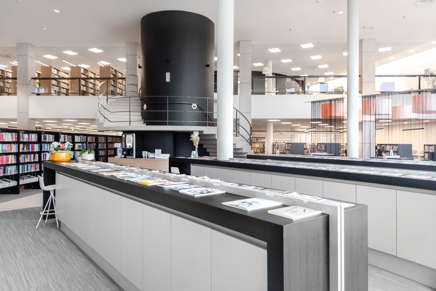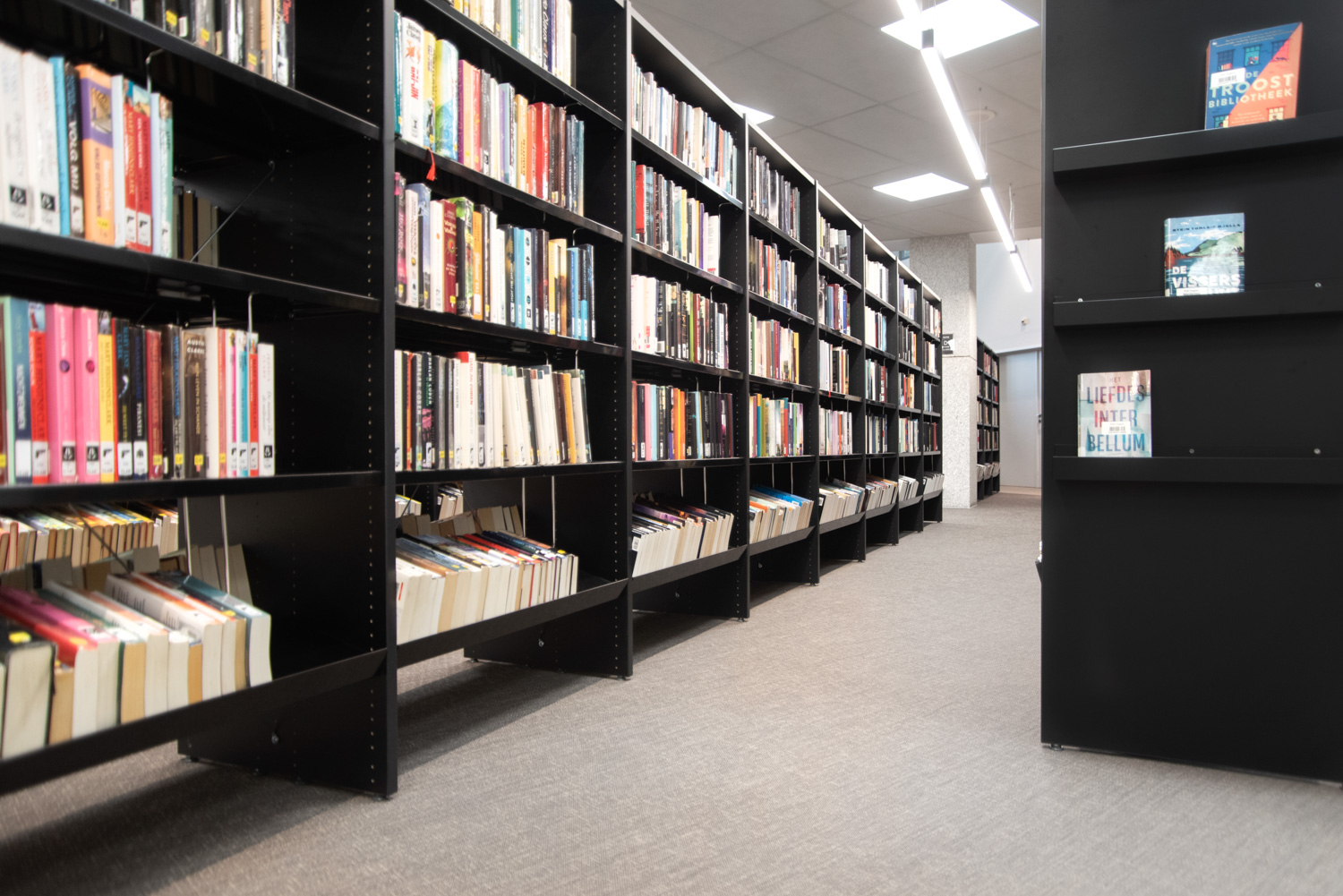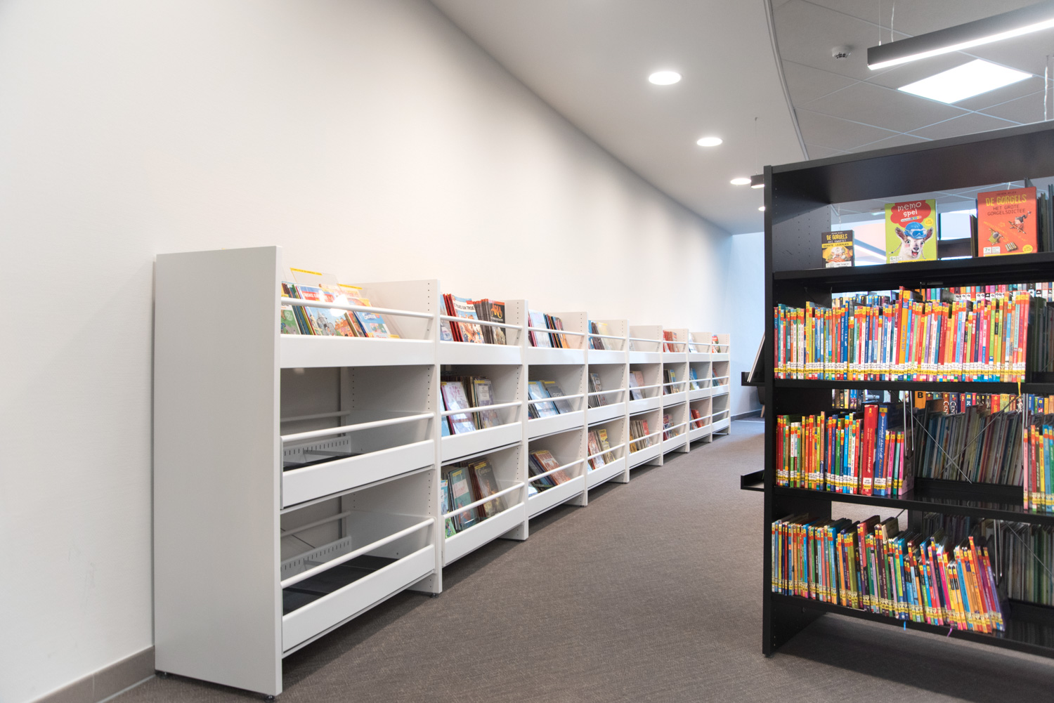 De bibliotheek werd omgetoverd tot een gezellige huiskamer, waar het aangenaam vertoeven en ontspannen is. Want mensen komen niet alleen naar de bibliotheek om boeken te lenen; ze gebruiken de bibliotheek ook om rustig te studeren, de krant te lezen of een praatje te maken. Daarom werden er comfortabele lounges geïnstalleerd. Nieuwe aanwinsten worden zowel bij de ingang als op de eindpanelen van de rekken gepresenteerd.