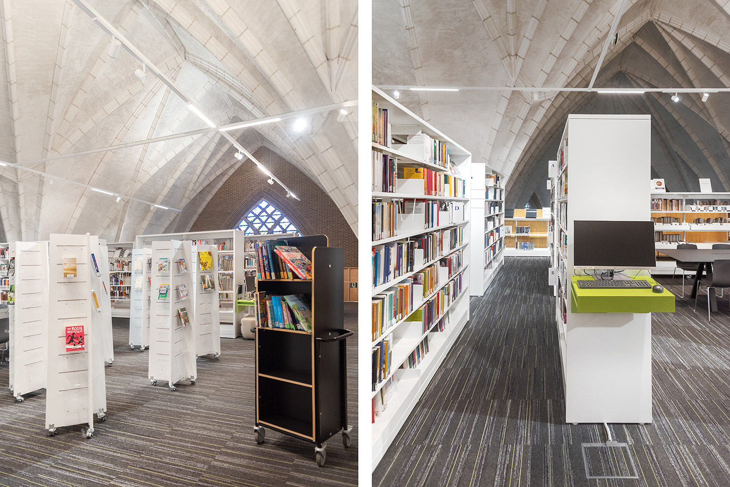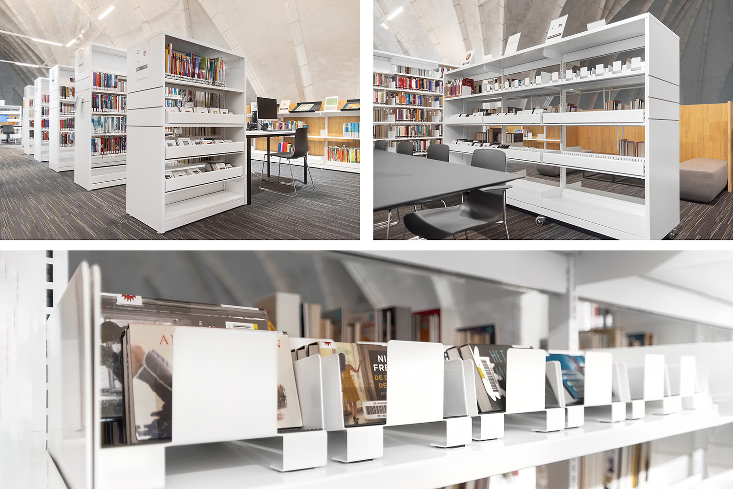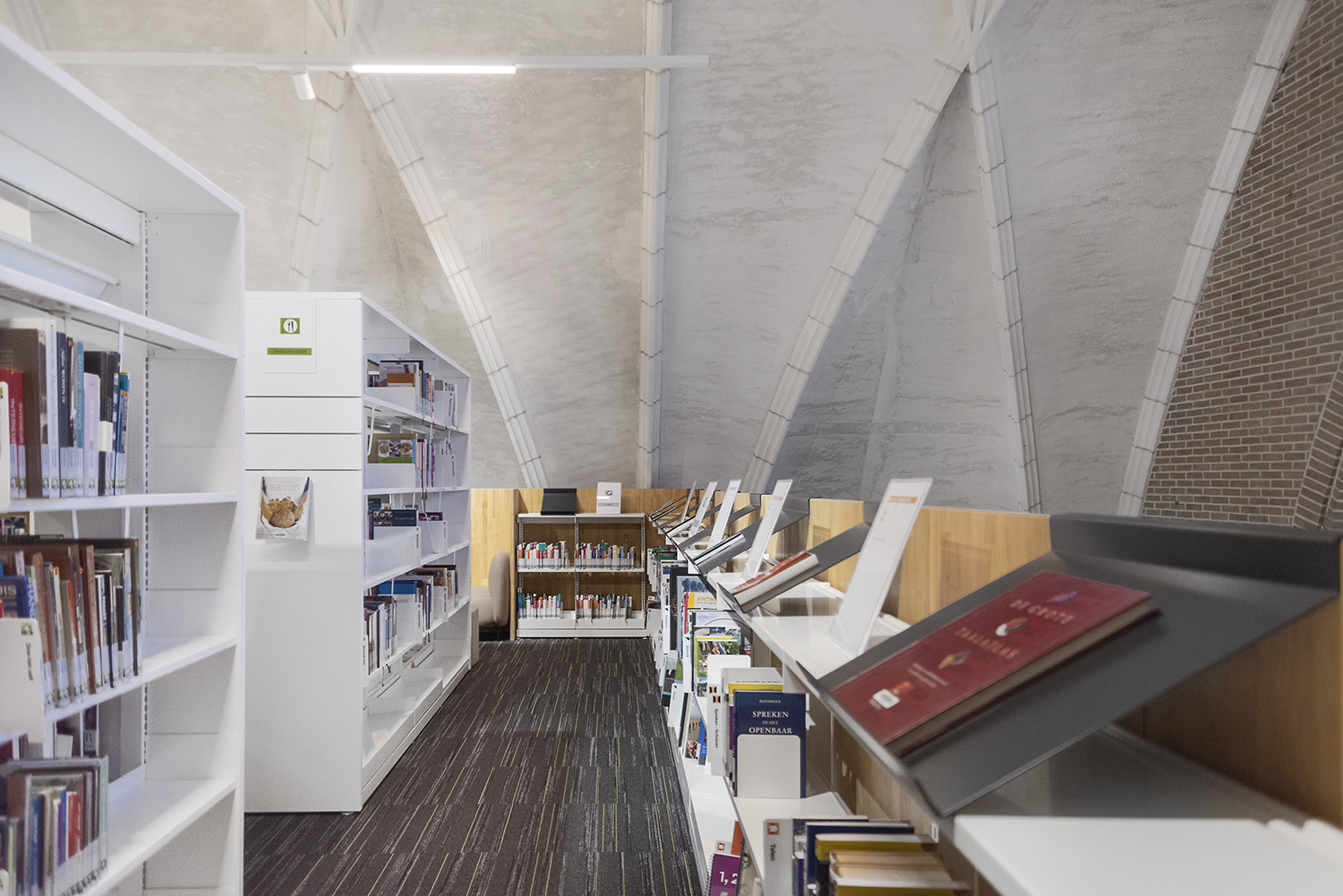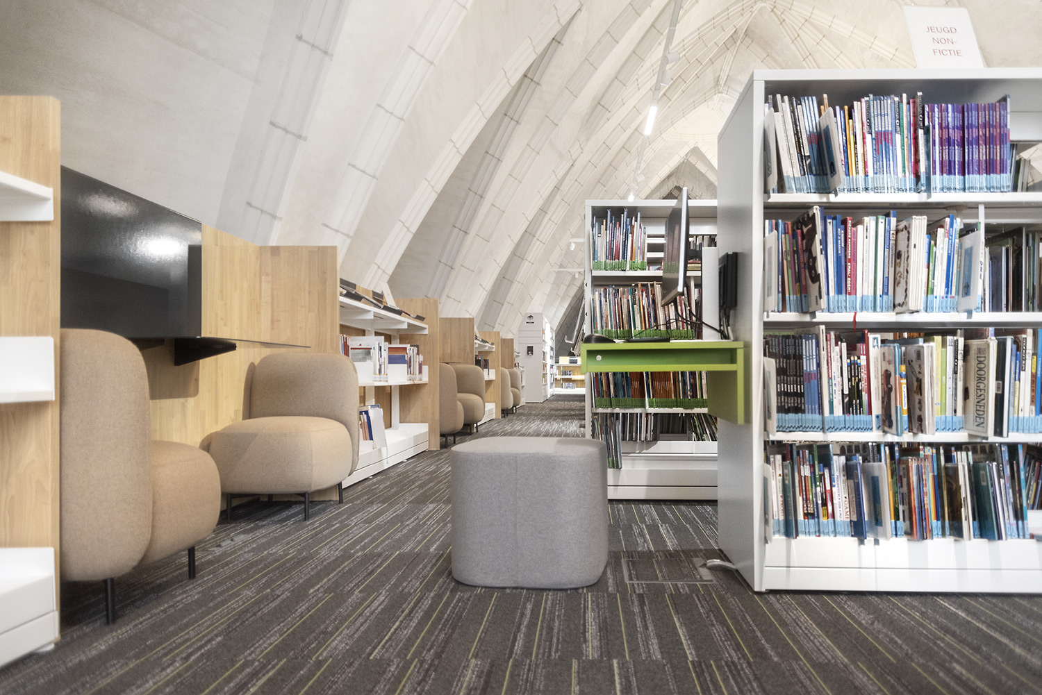 Bibliotheekrekken en meubels in wit en zachte kleuren laten alle aandacht aan de boeken, maar de ruimte biedt meer. Bibliothecaris Nele Verfaille: ‘Onze boekencollectie is comfortabel uitgestald en we hebben verschillende plaatsen waar mensen ook kunnen zitten om te lezen of op te zoeken, elkaar te ontmoeten, en waar activiteiten georganiseerd worden.'
