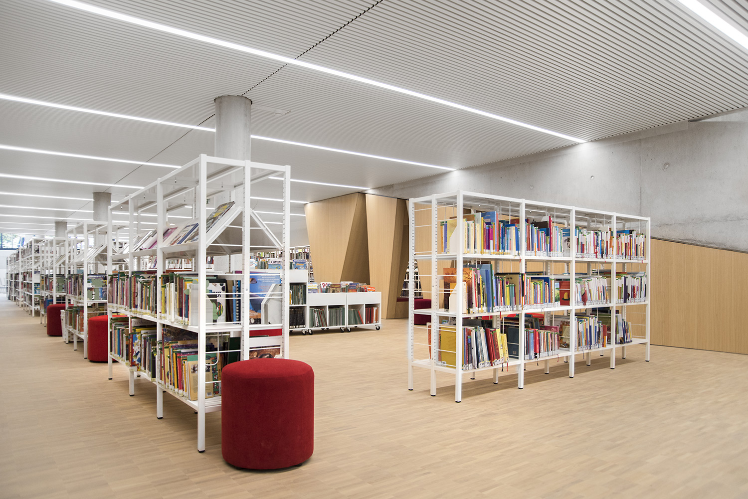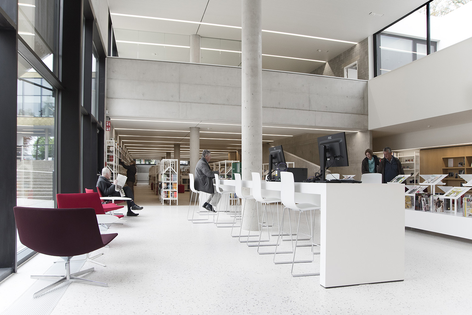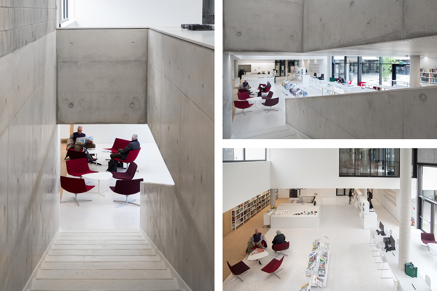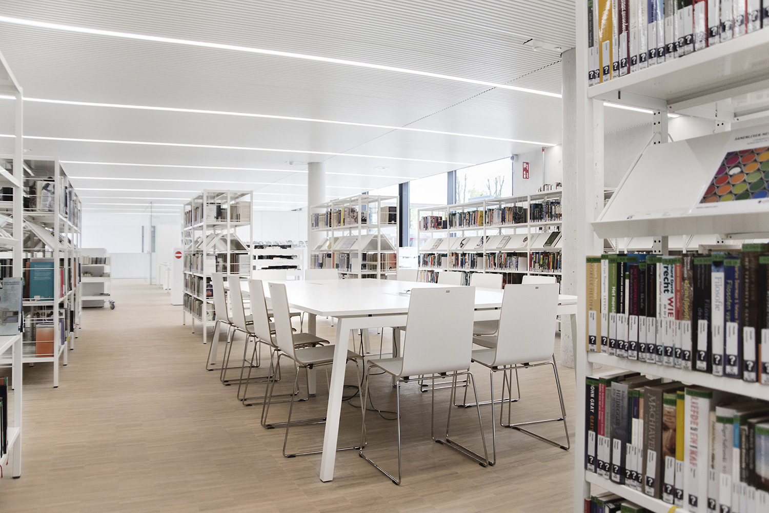 Dankzij een goede samenwerking tussen architect en interieurontwerpers met inbreng van de bib kon ieder zijn competenties inzetten om tot een doordacht resultaat te komen. Dankzij de overdadige lichtinval en het bijna ontbreken van kleur in de ruimte wordt de boekencollectie als belangrijkste onderdeel in het gebouw naar voren geschoven.