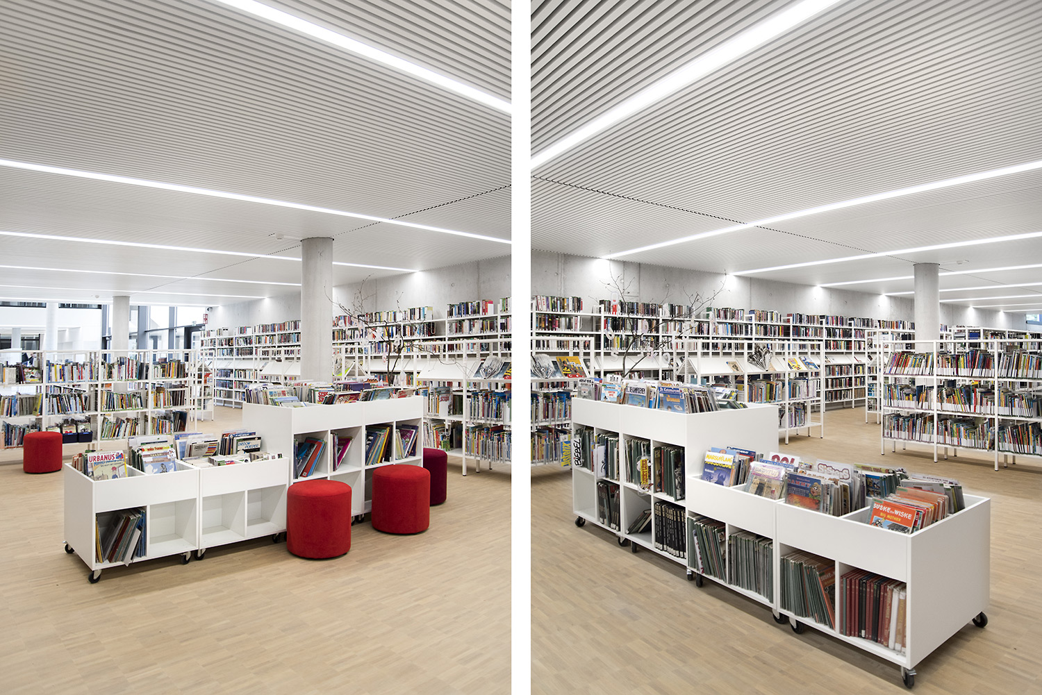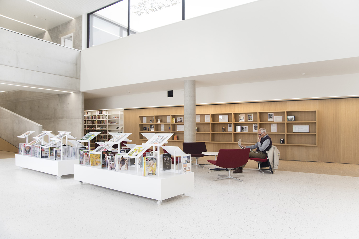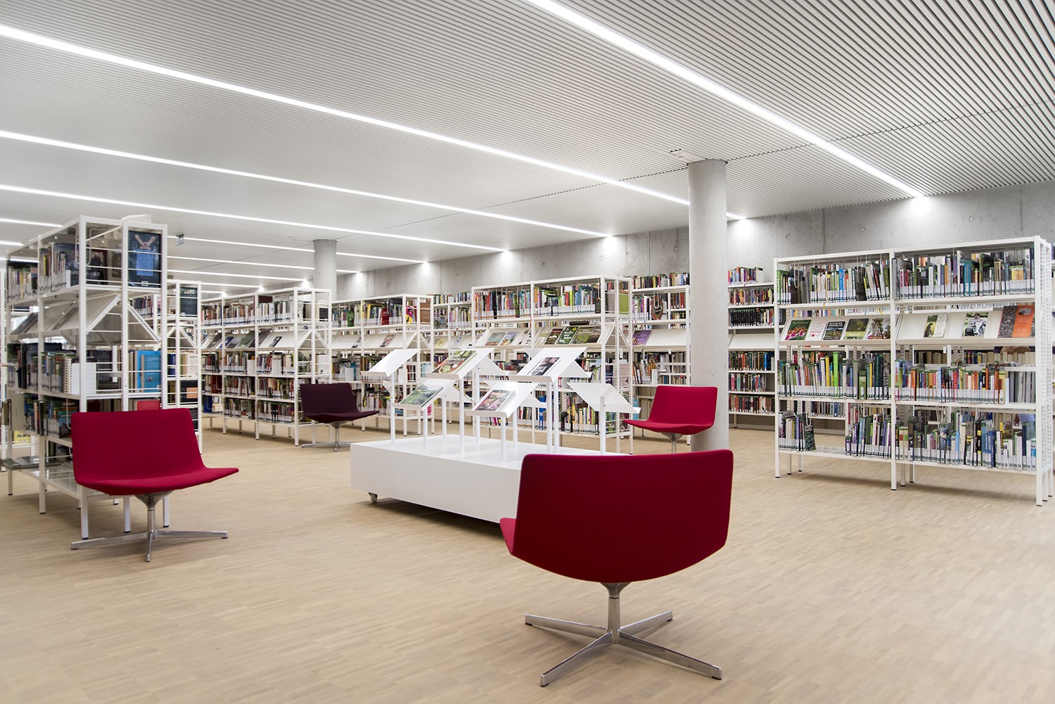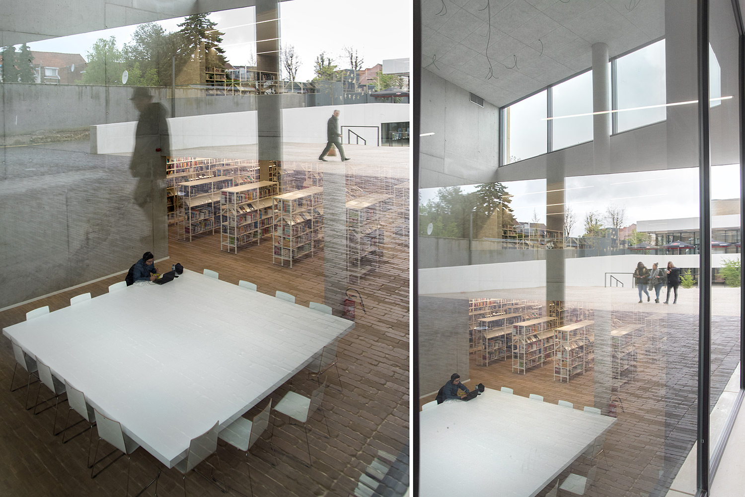 Dankzij een goede samenwerking tussen architect en interieurontwerpers met inbreng van de bib kon ieder zijn competenties inzetten om tot een doordacht resultaat te komen. Dankzij de overdadige lichtinval en het bijna ontbreken van kleur in de ruimte wordt de boekencollectie als belangrijkste onderdeel in het gebouw naar voren geschoven.