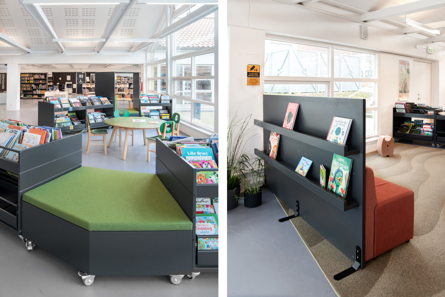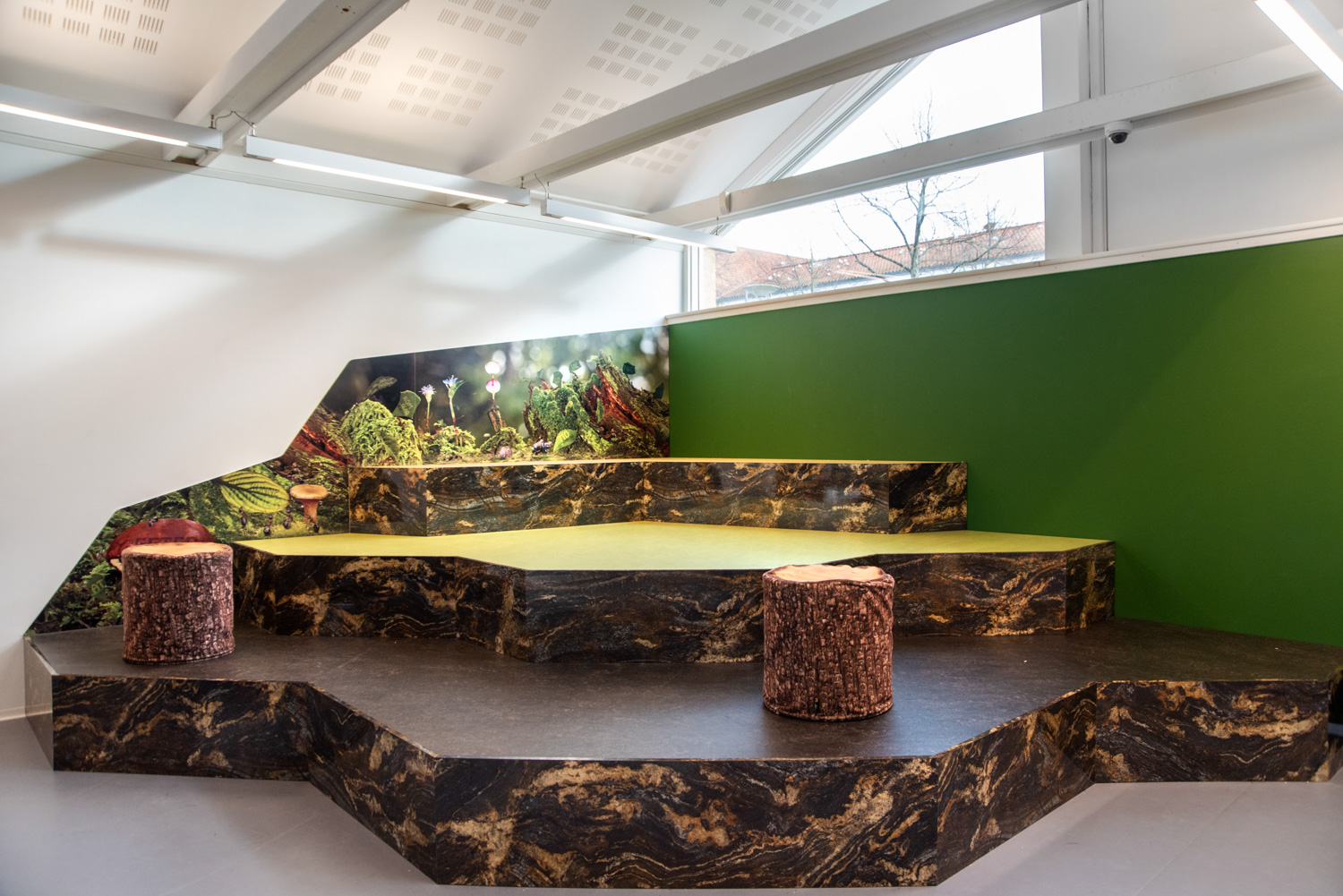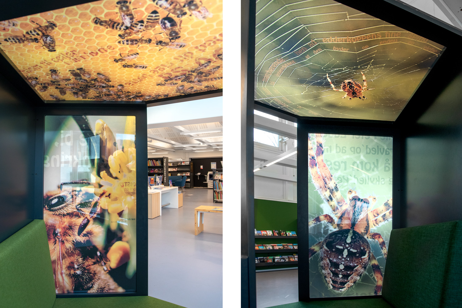 In de bibliotheek van Halsnæs spreken prachtige foto’s van insecten en de natuur tot de verbeelding van de kinderen, die er de details van dichtbij kunnen bewonderen. In de afbeeldingen zijn verwijzingen naar populaire kinderliedjes verwerkt. Op die manier worden natuurlijke elementen (biofiel design) gecombineerd met aspecten als taalontwikkeling, interesse voor het lezen, immersie en observatie.