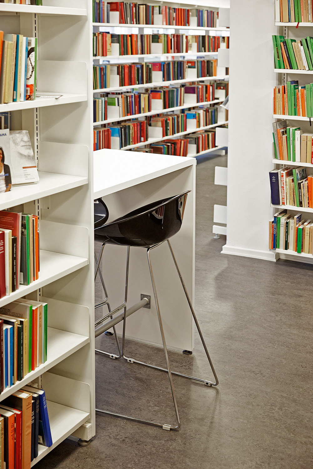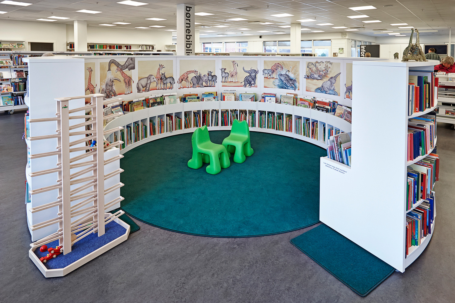 Door slim en creatief met ruimte om te gaan is een wijde en verwelkomende bibliotheek tot stand gekomen met toegewezen plaatsen voor zowel stilte en lezen als voor discussies. Neem ook een kijkje in de kinderafdeling met het ronde rek en de kleurrijke illustraties, gemaakt door lokale artiesten.