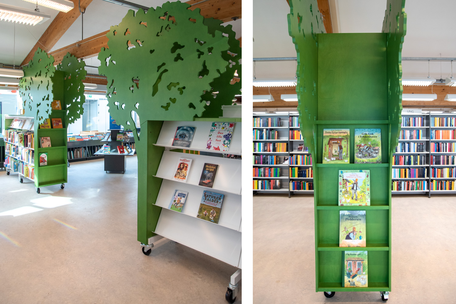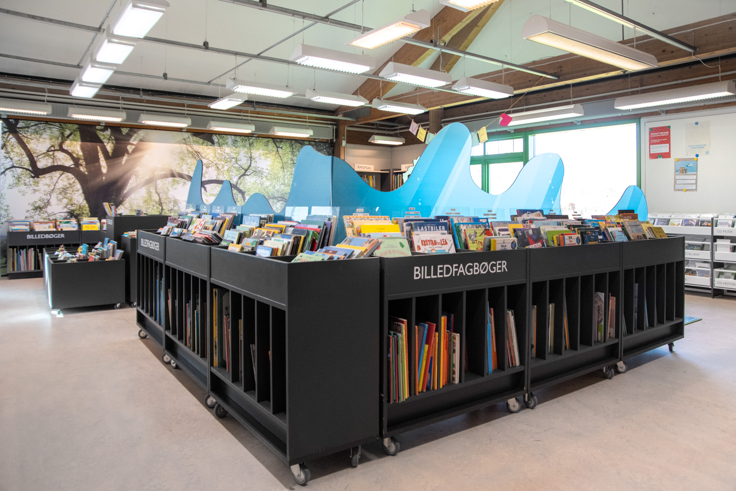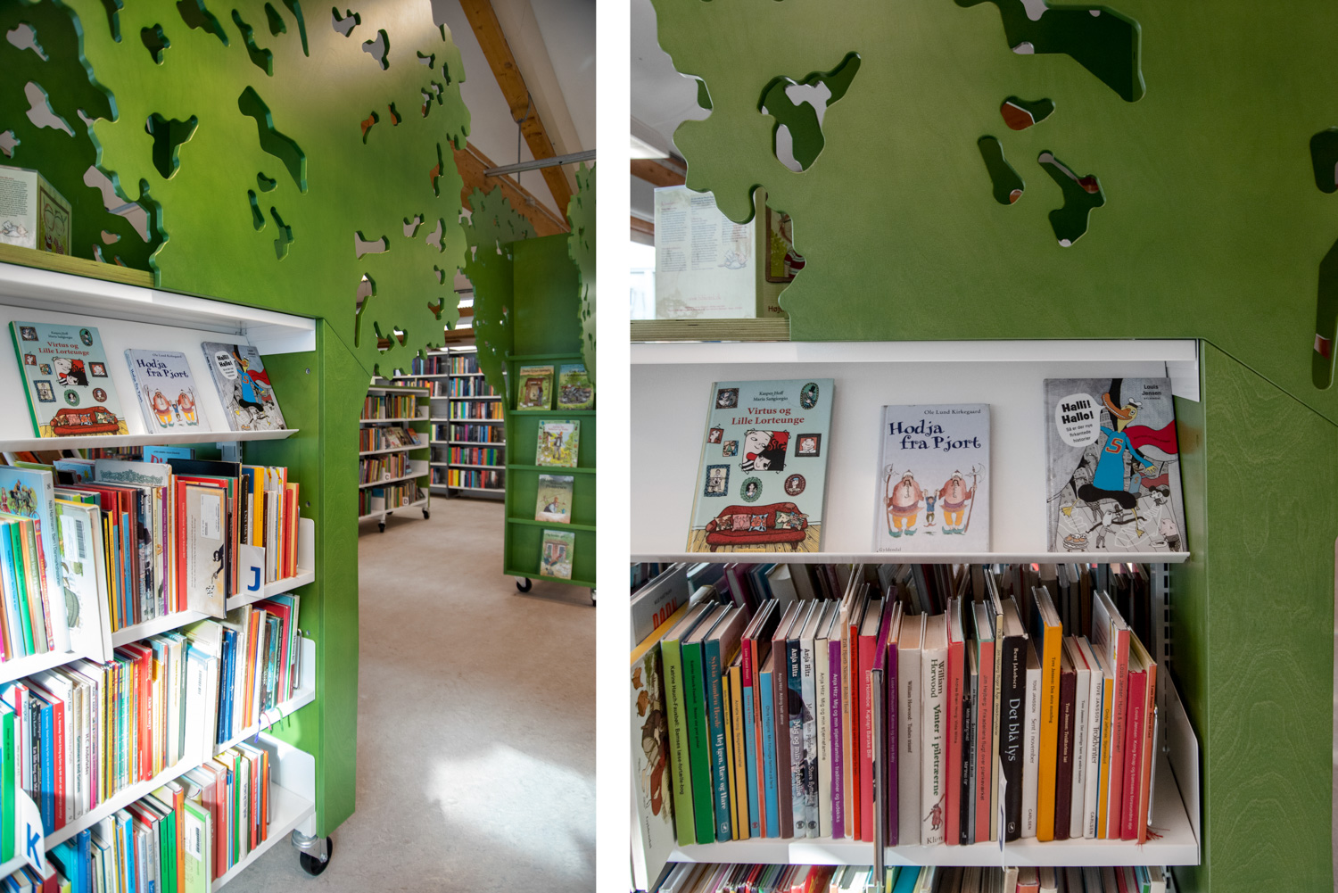 De bibliotheekrekken hebben een omkasting in gebeitst multiplex in verschillende tinten groen en de ingang van de kinderbibliotheek werd voorzien van twee grote bomen. Indexboeken worden gepresenteerd in boekenbakken die voorzien zijn van geïntegreerde zit- en speelpodia. Een groot tapijt, dat eruitziet als gras en water, creëert de ideale ruimte om te spelen en tijd door te brengen bij het raam, terwijl de bestaande boekenbakken voor prentenboeken, evenals een acrylmuur met prints van golven en vissen het gebied omringen.