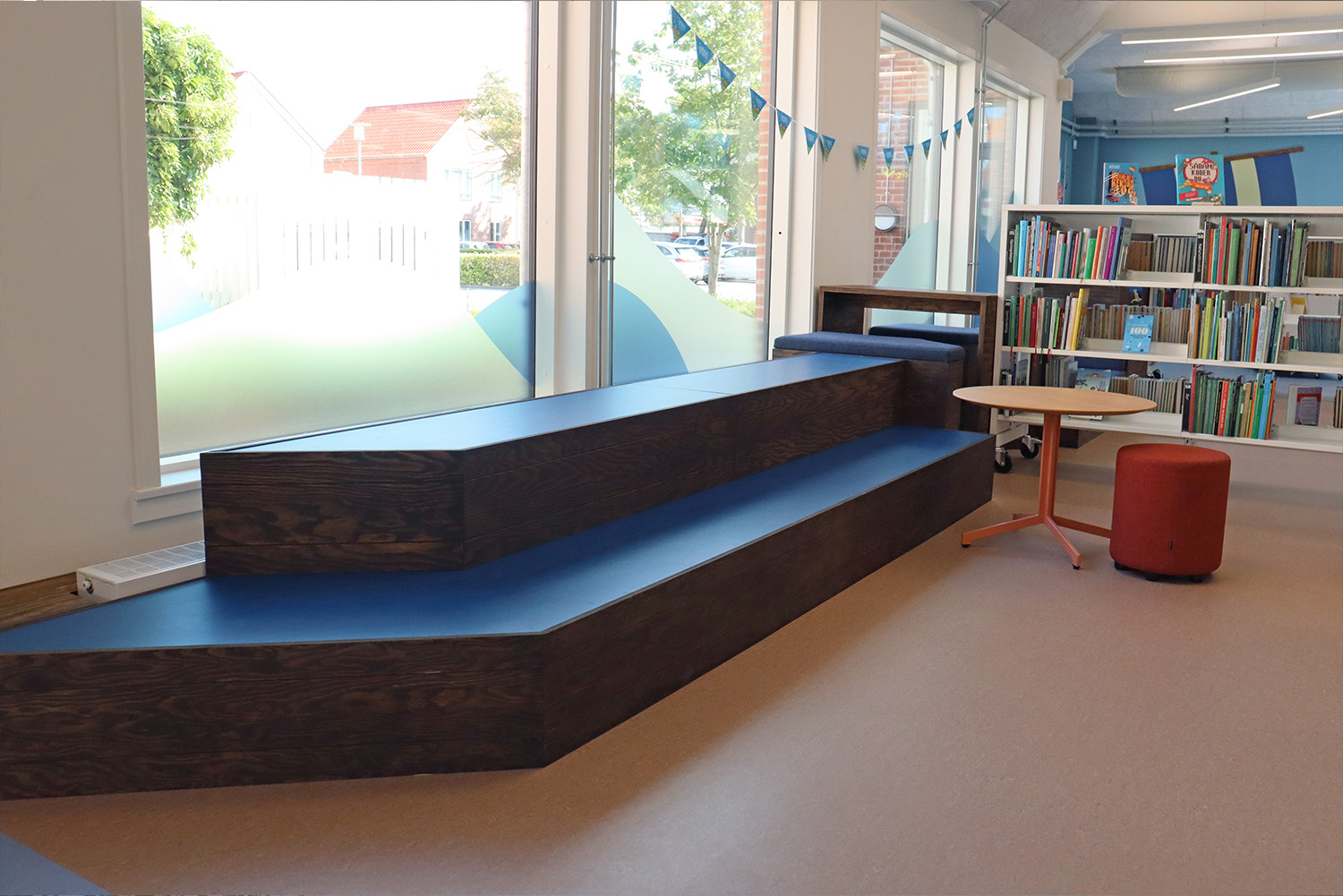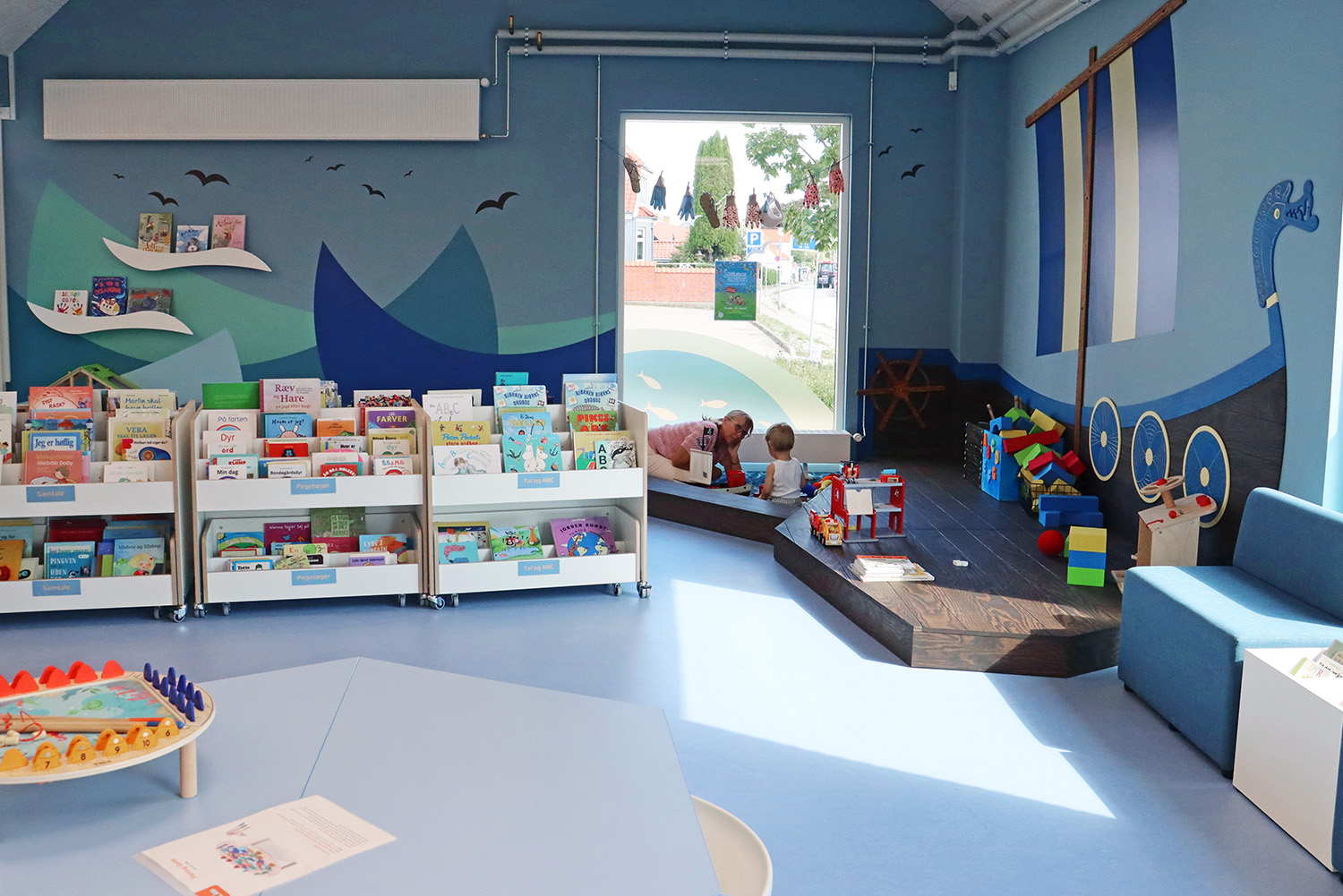 Het op maat gemaakte ontwerp is geïnspireerd op het maritieme erfgoed van Kerteminde, met het Ladby-schip als absolute blikvanger omtrent het thema. Het rustgevende kleurenpalet van wit en blauw creëert een uitnodigende sfeer voor bezoekers van alle leeftijden. De bibliotheek is zorgvuldig onderverdeeld in verschillende zones, gaande van rustige leesplekken tot dynamische creatieve ruimtes en een totaal nieuwe kinderbibliotheek. Deze weldoordachte indeling zorgt ervoor dat iedereen een plek vindt om te leren en inspiratie op te doen.