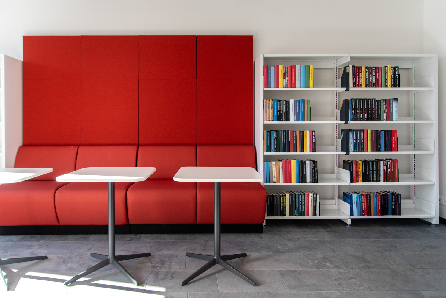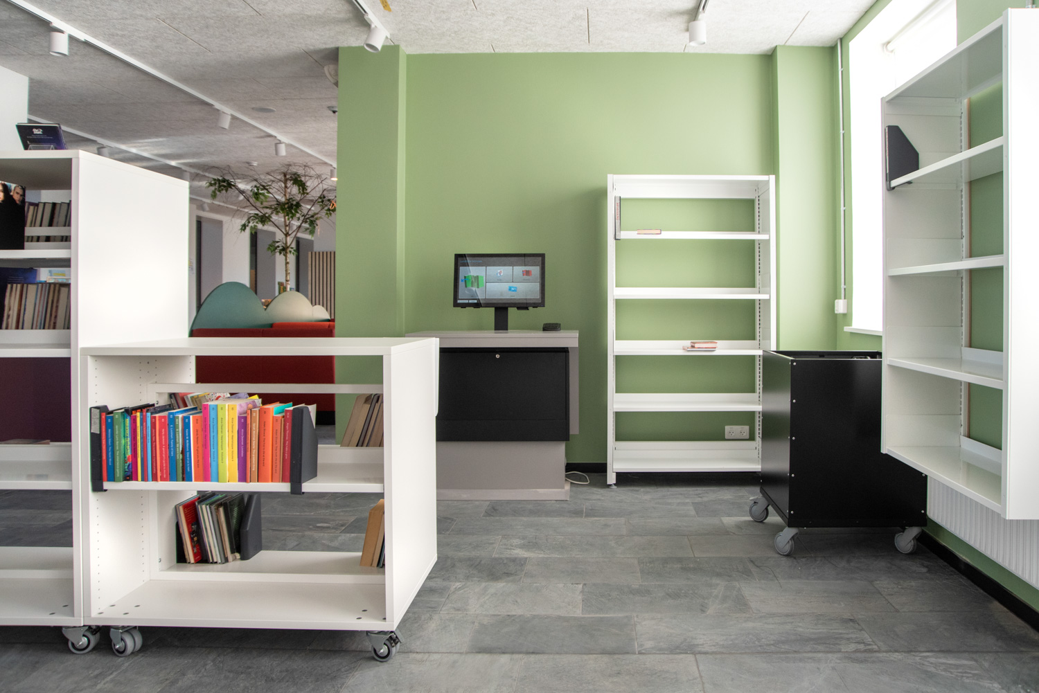 De aardse kleuren en oranje bekleding van bepaalde bibliotheekelementen contrasteert mooi met de meer neutrale, natuurlijke tinten. Met de Maria podiumboekenbakken kunnen displayhoekjes worden ingericht en bepaalde items in de kijker worden geplaatst.