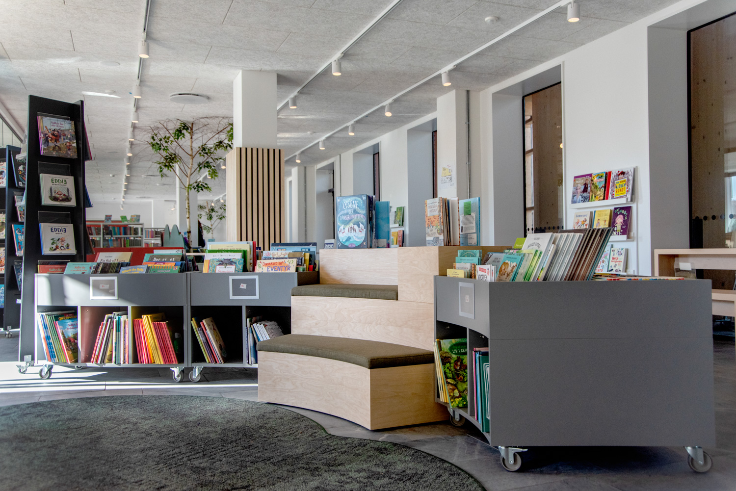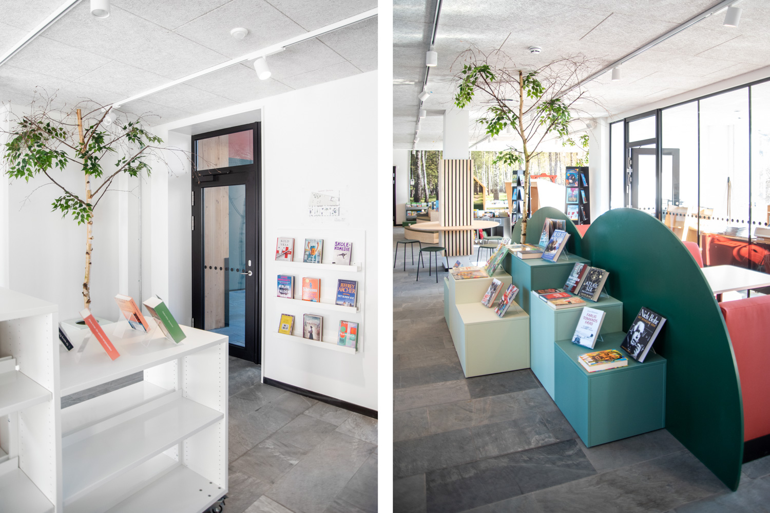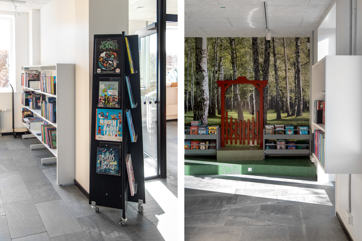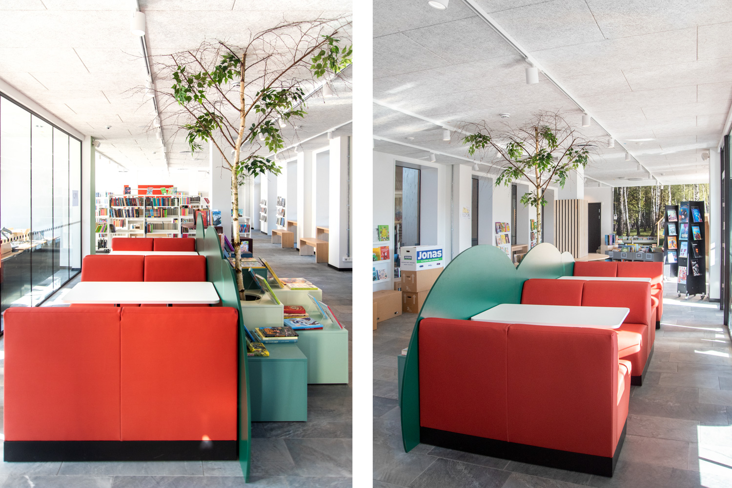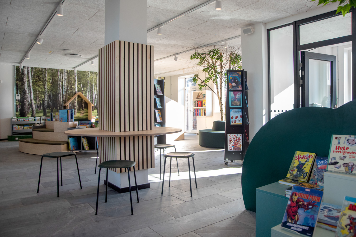 Het interieur van de schoolbibliotheek van de Lundtofte Skole – tegelijk de openbare bib van Lyngby – werd speciaal ontworpen om de omringende natuur te weerspiegelen. De natuur kreeg dan ook een cruciale en betekenisvolle plaats in de kinderafdeling van de bib, waar het lokale hertenpark en het buitenleven het thema bepalen. Zo kunnen de kinderen als het ware de natuur opzoeken in een op maat ontworpen schuilhutje omringd door levensgrote natuurfoto’s aan de muren, een tapijt dat aan gras doet denken, groene planten en andere materialen en texturen geïnspireerd op de natuur.