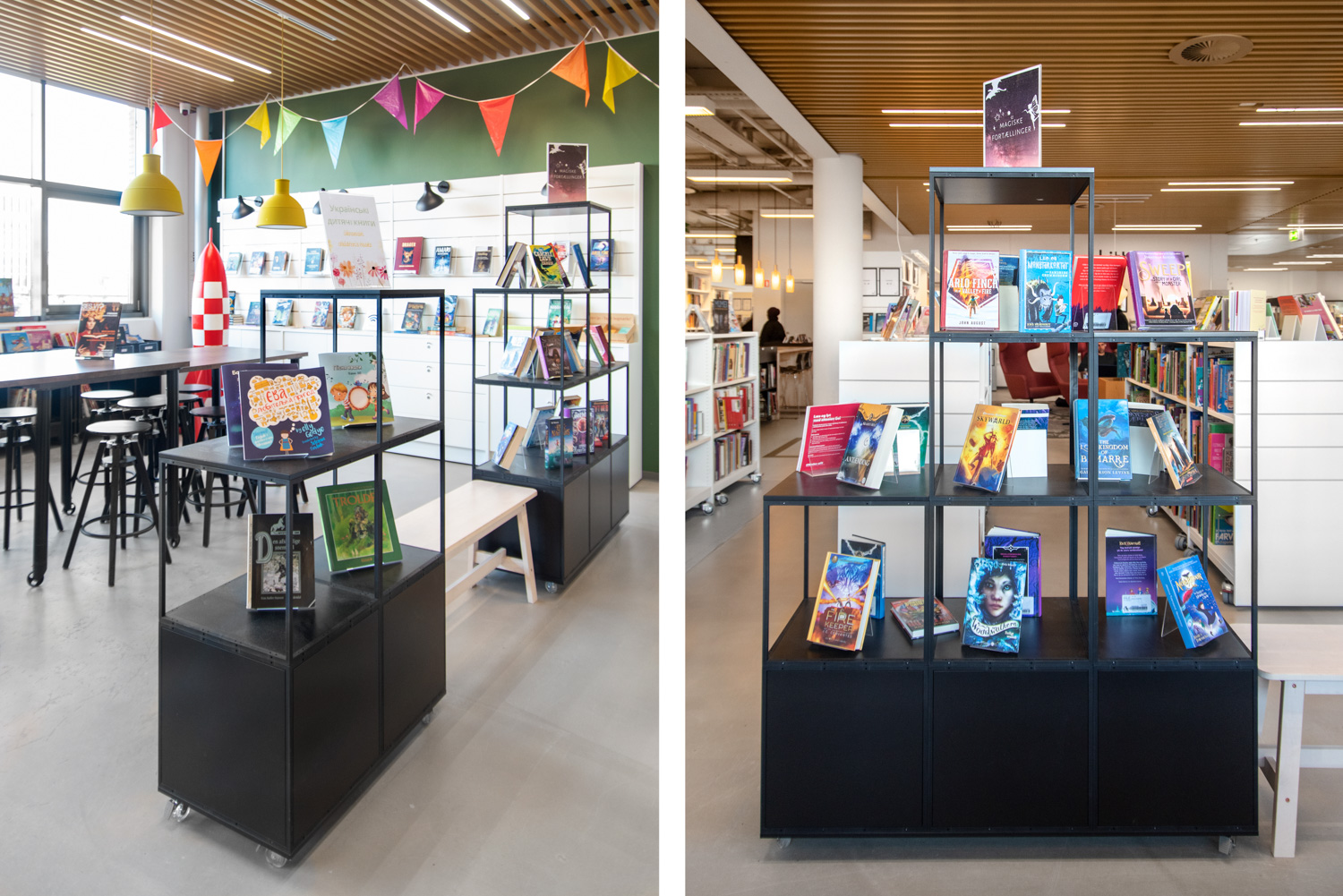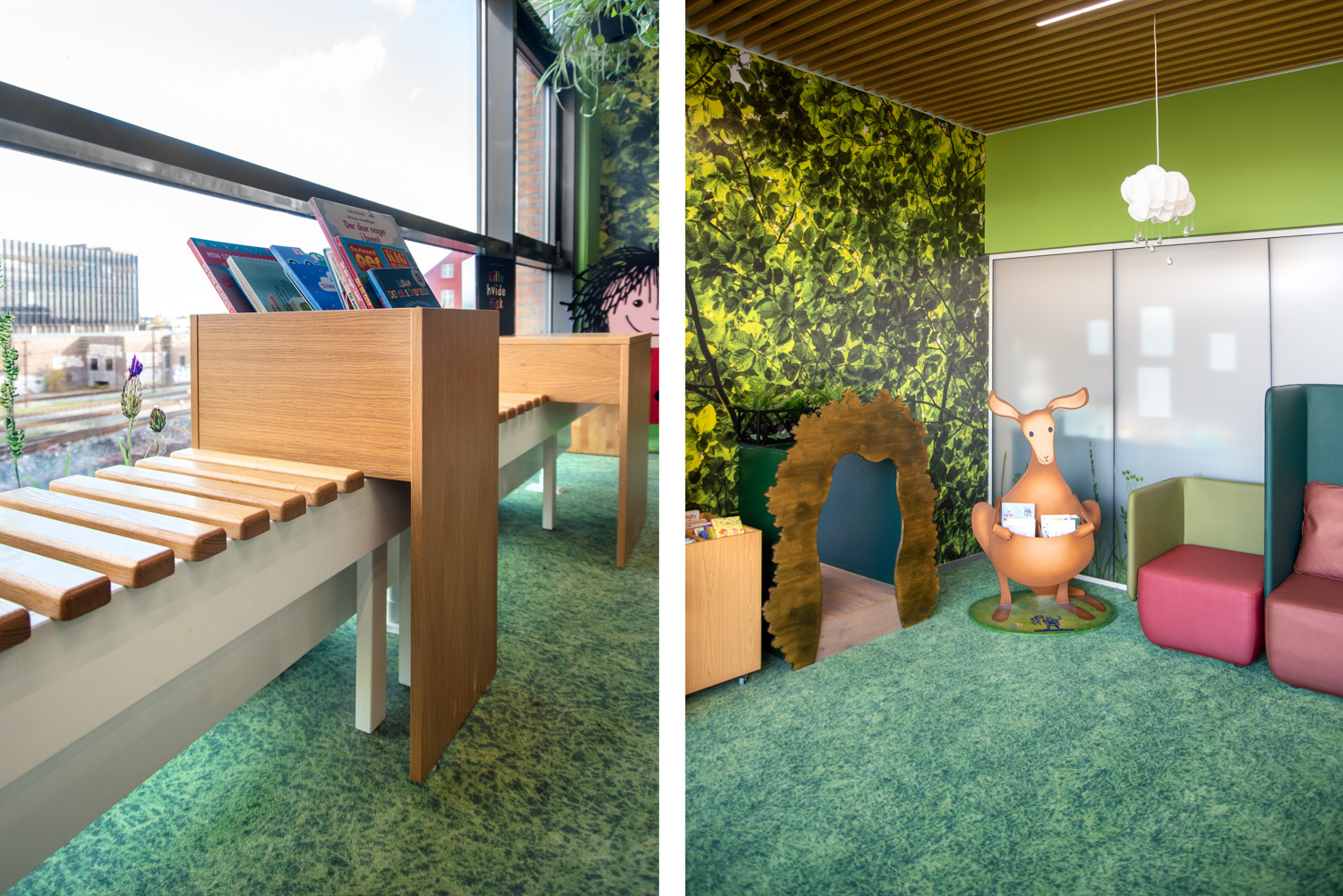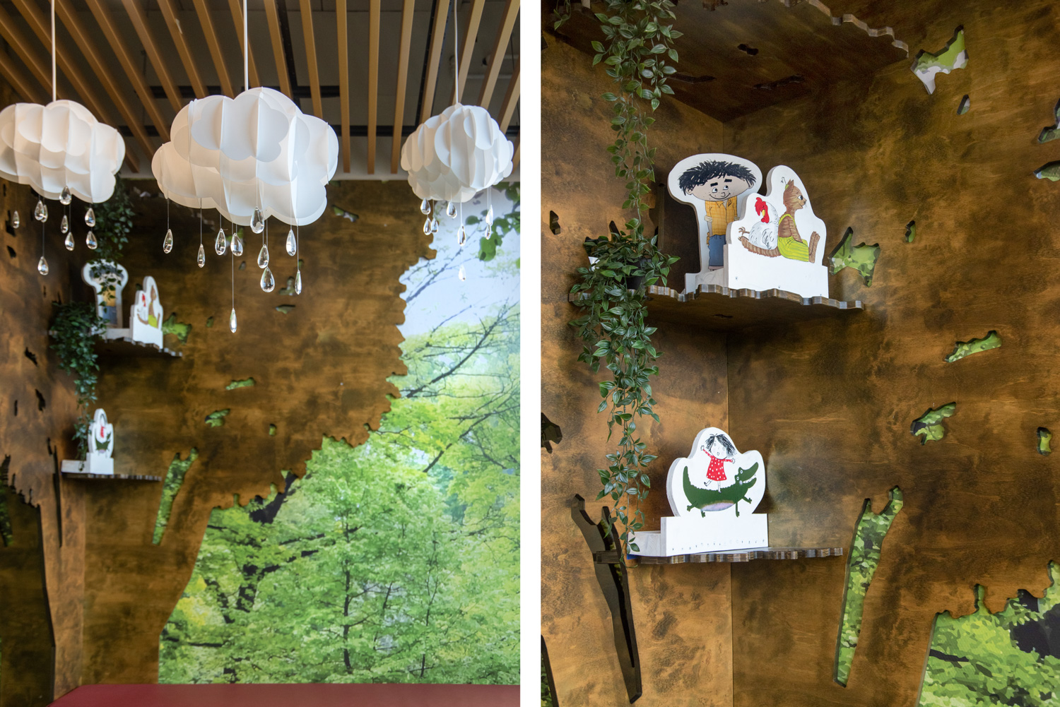 Ook de kinderafdeling, afgebakend met een tuinhek, is een puzzel van oud en nieuw meubilair. Tussen de verschillende zones in werd ruimte voorzien om zich in de lectuur te verdiepen of voor spel en creativiteit. Vooral de ‘tuin’ voor de kleintjes springt meteen in het oog. Wie zich tussen de huisjes bij de muur in bosthema begeeft, komt in een heuse tuin terecht, omringd door gras, bomen, bloemen en andere natuurlijke elementen. De decoratieve elementen treden in dialoog met de uitgestalde boeken. Zo wordt de literatuur deel van de ervaring.