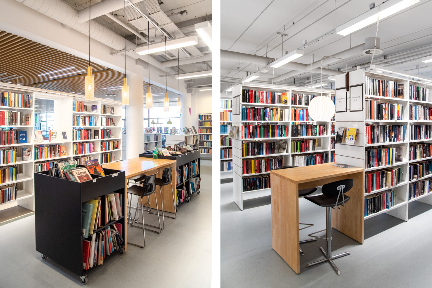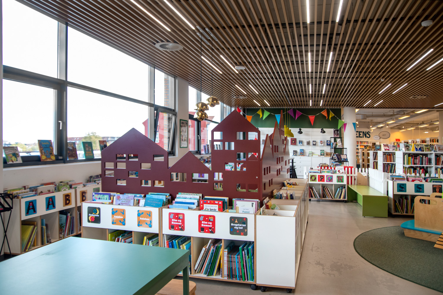 De bibliotheek van Odense onderging een ware metamorfose. De uitdaging bestond er vooral in uiteenlopende zones en wensen in een coherent geheel samen te brengen. Het bestaande bibliotheekmeubilair werd hergebruikt om het veelvoud aan materiaal een plaatsje te geven, aangevuld met meubilair voor ontspanning, activiteiten en expo’s.