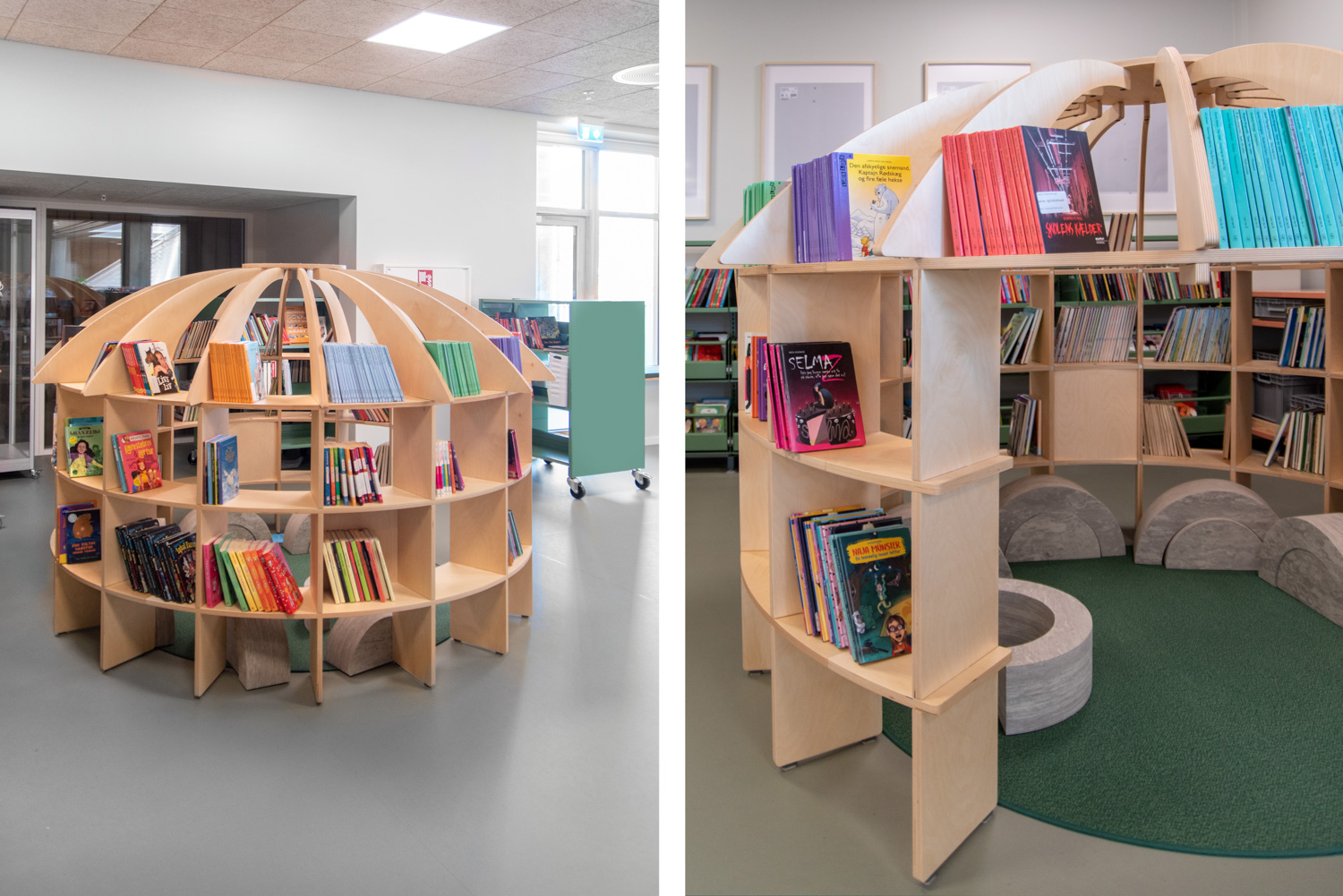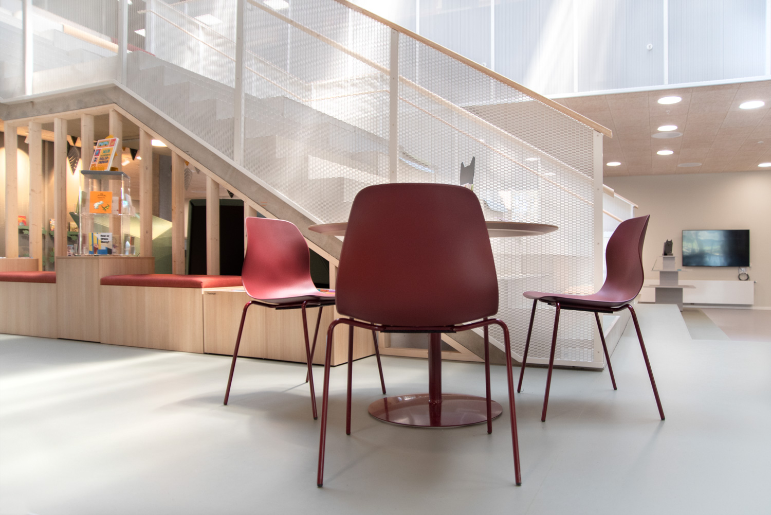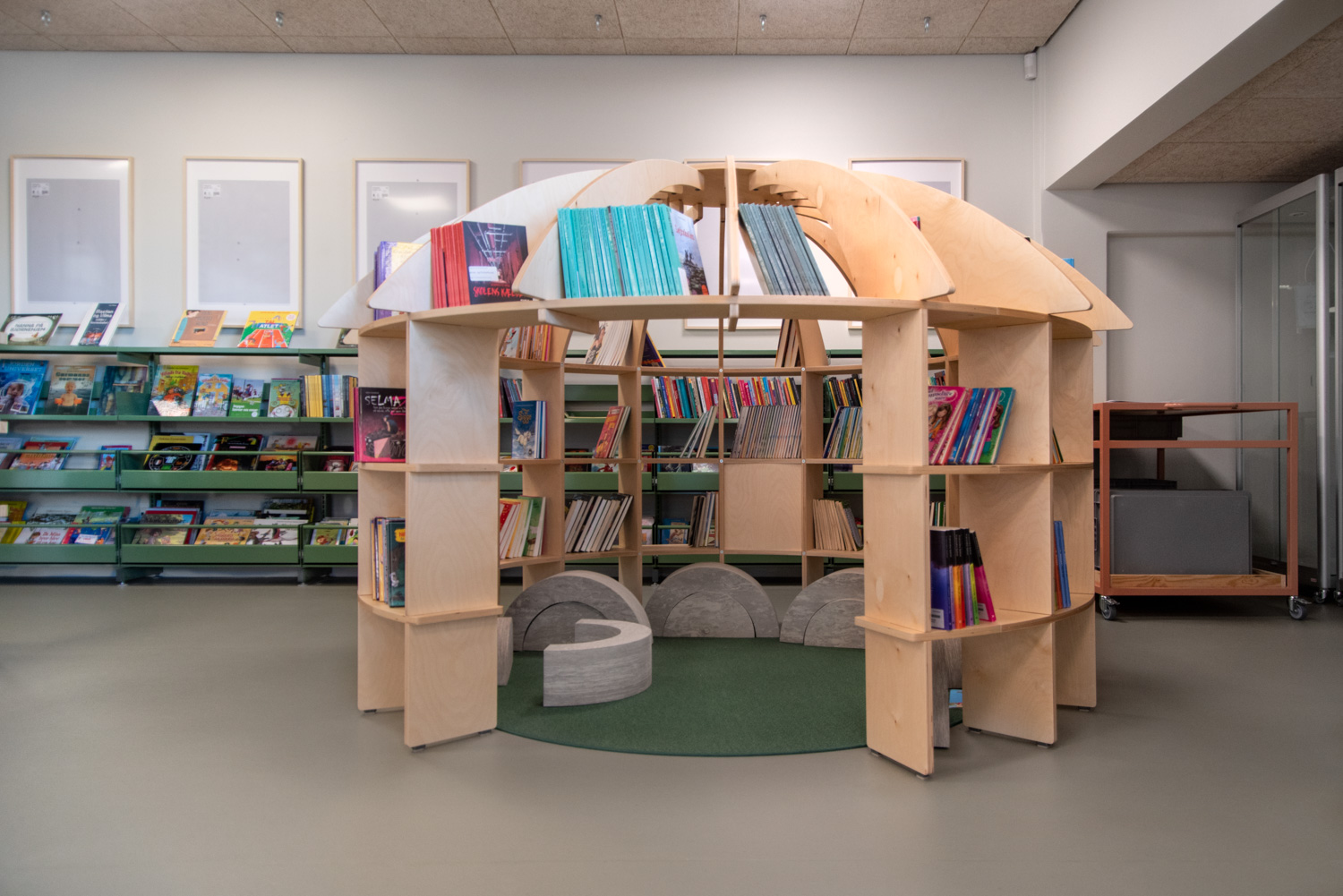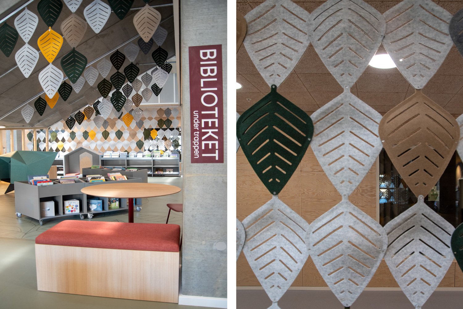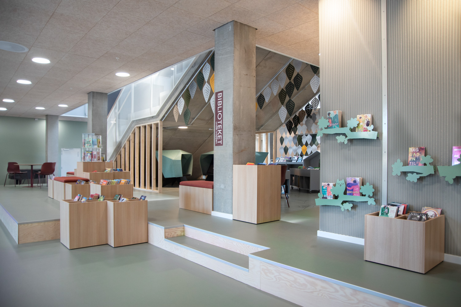 De opvallende decoratieve elementen in de bib scheppen een speelse en biofiele sfeer. Tegelijk gaat de bibliotheekzone perfect op in de rest van het gebouw, met kleuren die passen bij de warme rood- en groentinten die overal in het cultuurhuis te zien zijn.