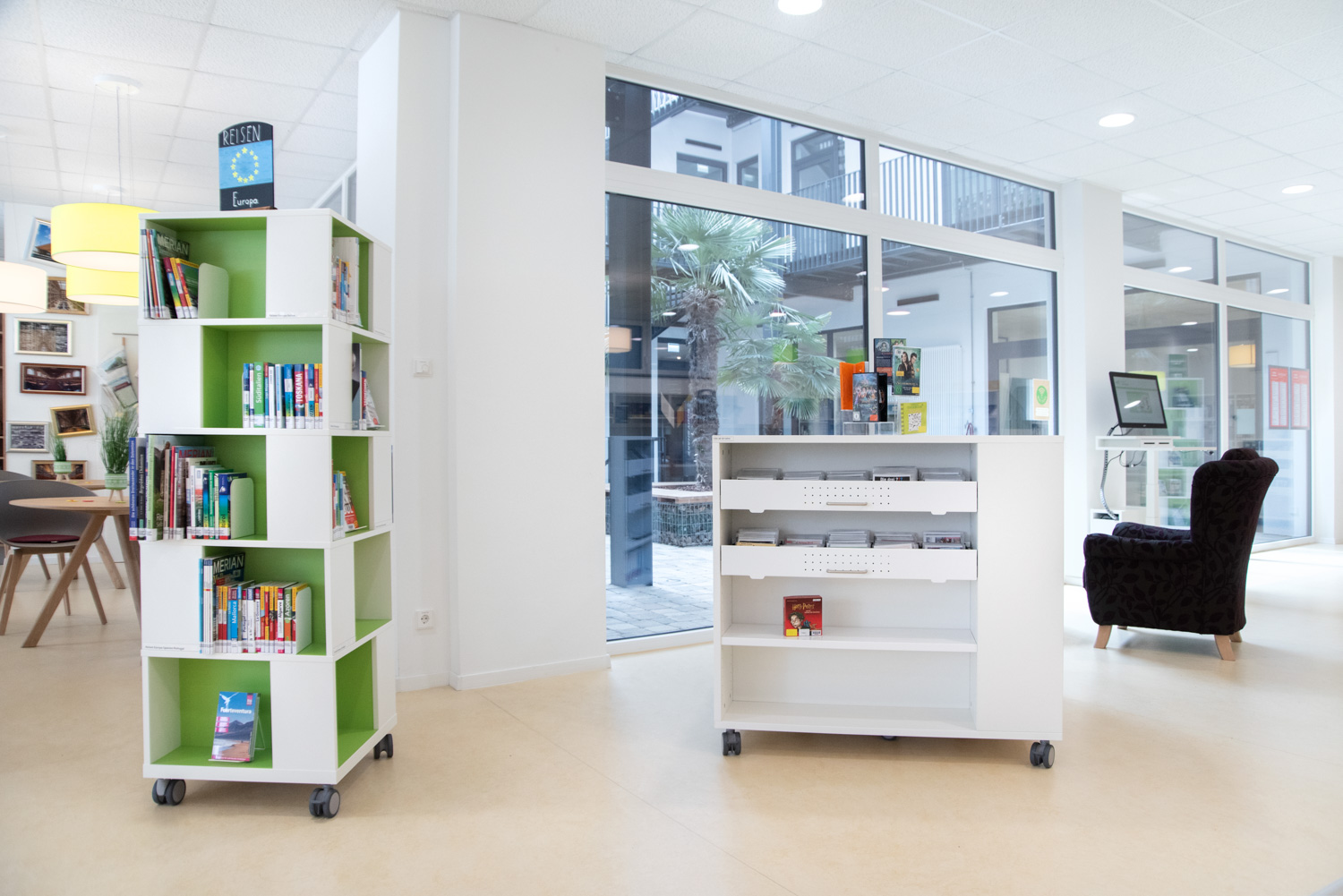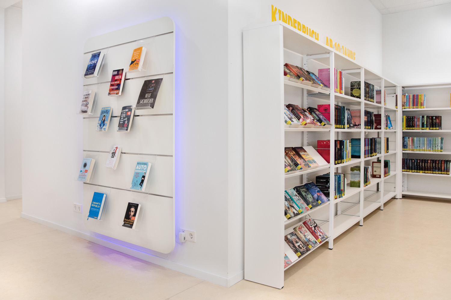 Ons team van architecten bedacht samen met het bibliotheekbestuur van Ilsfeld creatieve combinaties van kleuren en vormen voor het meubilair, met een mooie, warme en kwaliteitsvolle bibliotheekinrichting als resultaat.