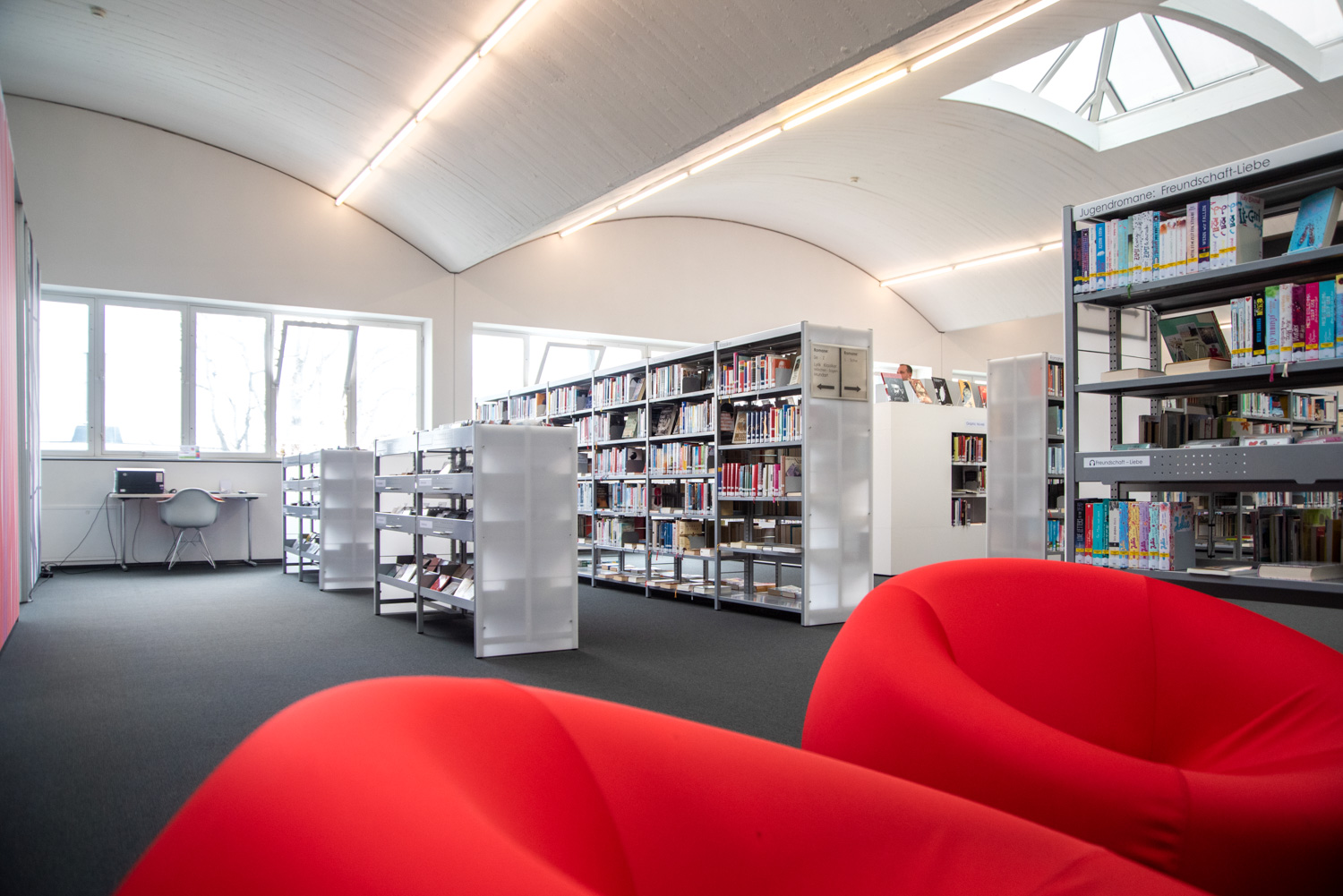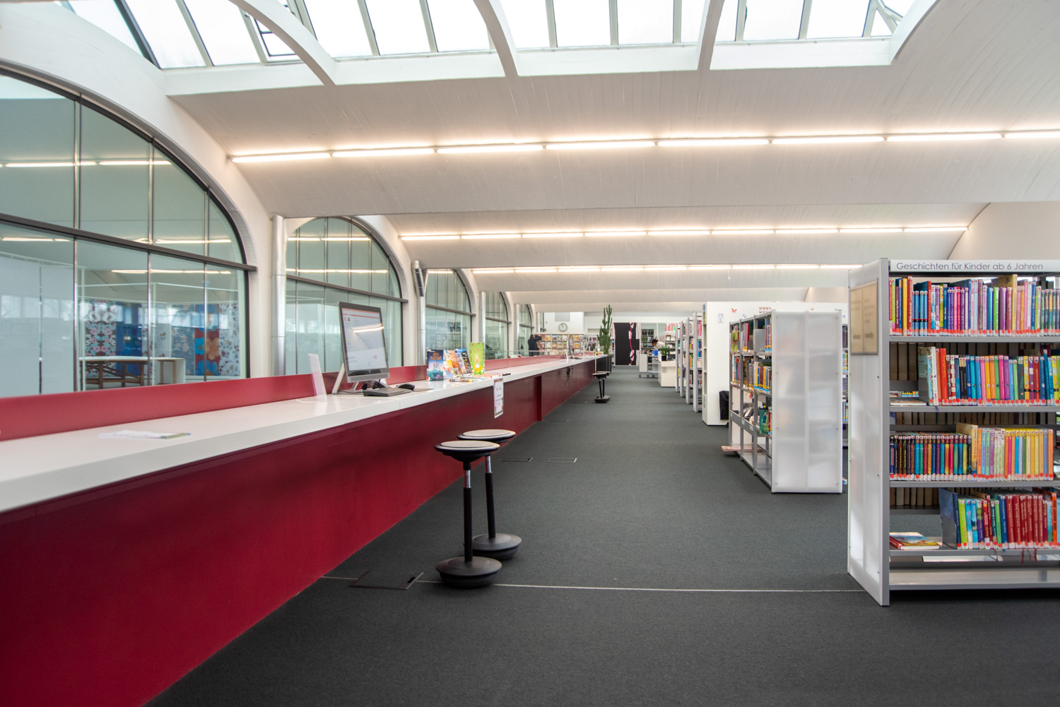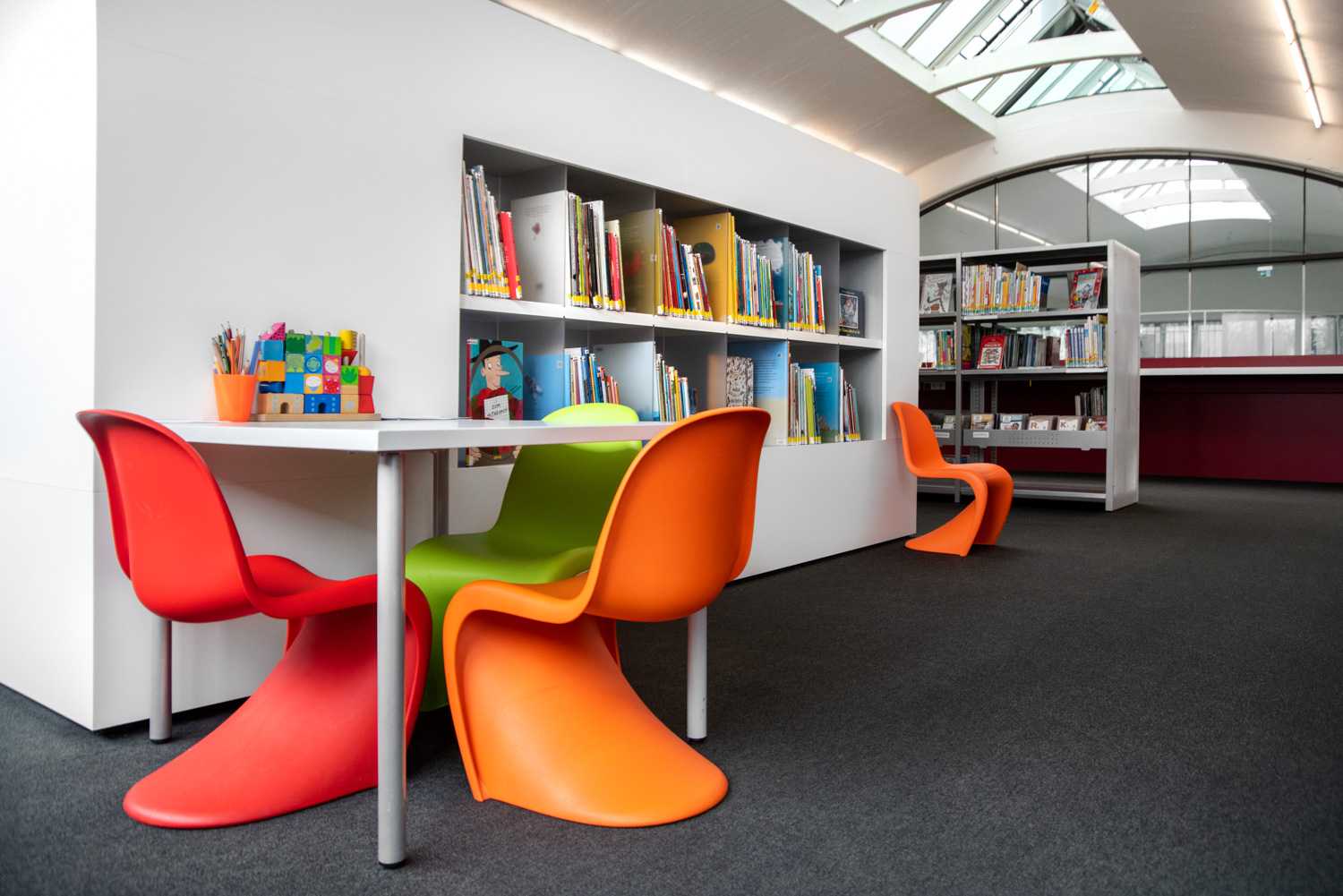 Dat hebben de architecten in de bib van Mössingen goed begrepen. Dankzij hun vakkundige ingrepen en oog voor detail, verwelkomt de bibliotheek de bezoekers in een lichtrijke, ruime en speelse omgeving, die aangenaam aanvoelt en ruimte schept voor ontmoeting.