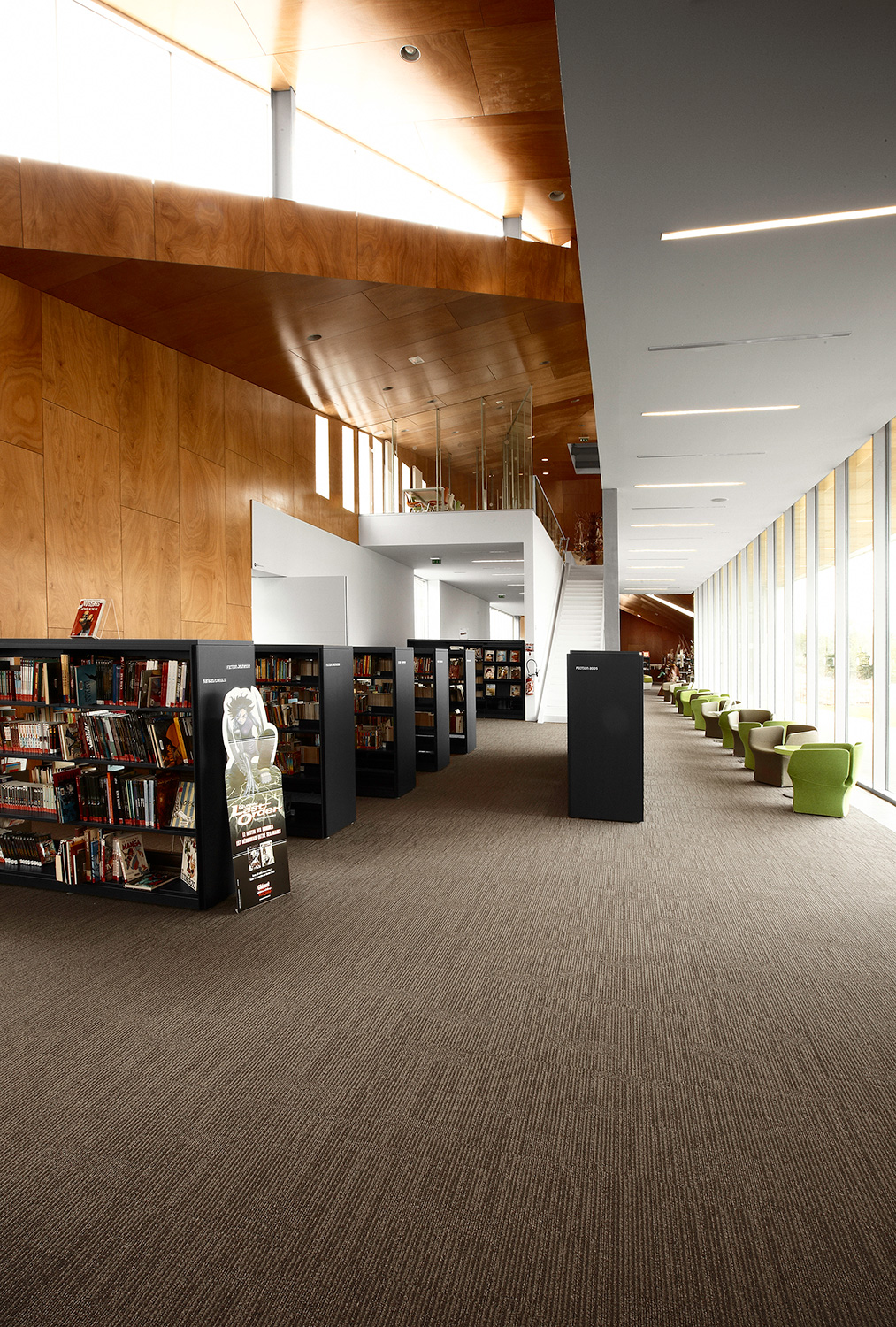 Aan de binnenkant voegt het BCI rekken systeem 60/30, met Londen eindpanelen en top planken, functionaliteit toe en draagt dit bij aan het maken van de mediatheek dewelke een krachtige omgeving heeft voor het lezen en het ervaren van nieuwe culturele media.
