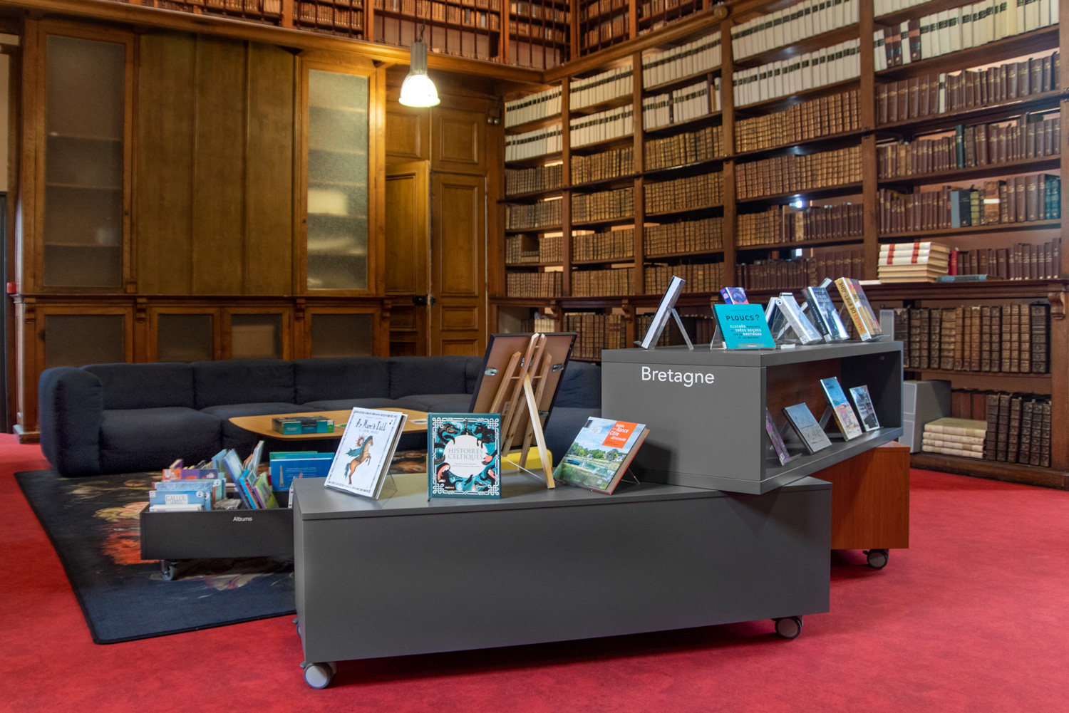 De bibliotheek strekt zich uit over drie verdiepingen en biedt plaats aan 55.000 boeken. De heringerichte ruimte voelt vandaag ruimer en gezelliger aan. Het hele gebouw werd voorzien van meubilair uit ons 60/30 Classic London gamma, inclusief gebogen rekkensystemen op de gelijkvloerse verdieping. Een bezoekje aan de erfgoedruimte op de tweede verdieping wordt warm aanbevolen. Naast de vrijstaande zwarte rekken die contrasteren met het rode tapijt, zijn vooral de hoge authentieke eiken rekken tegen de muren echte eyecatchers.