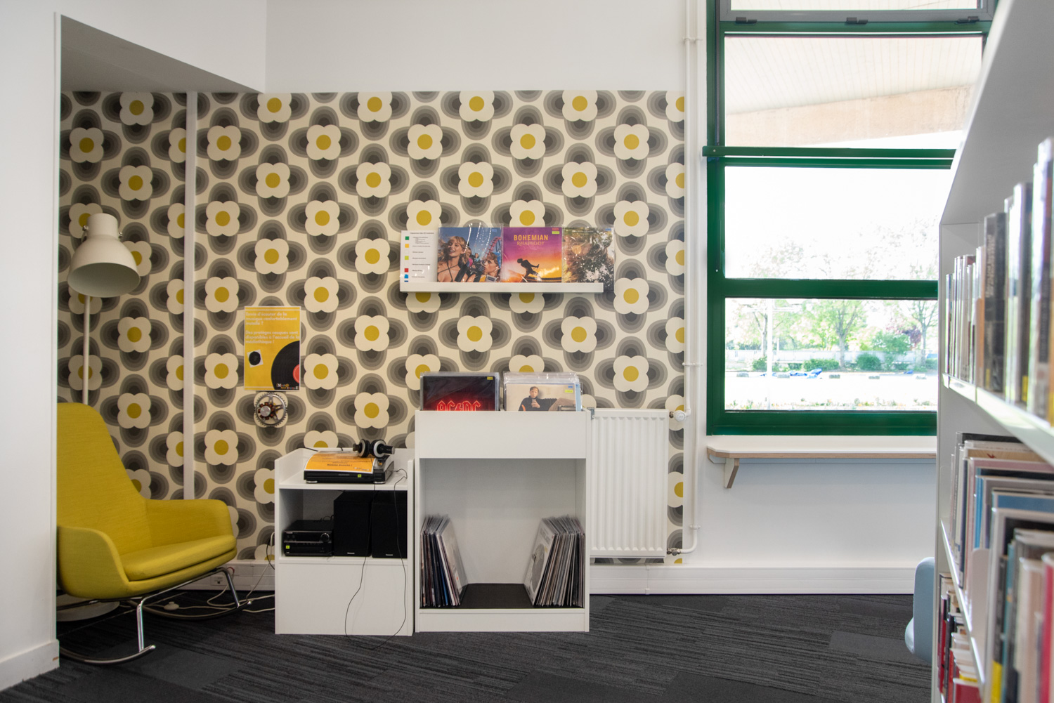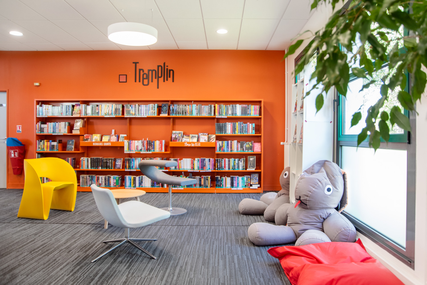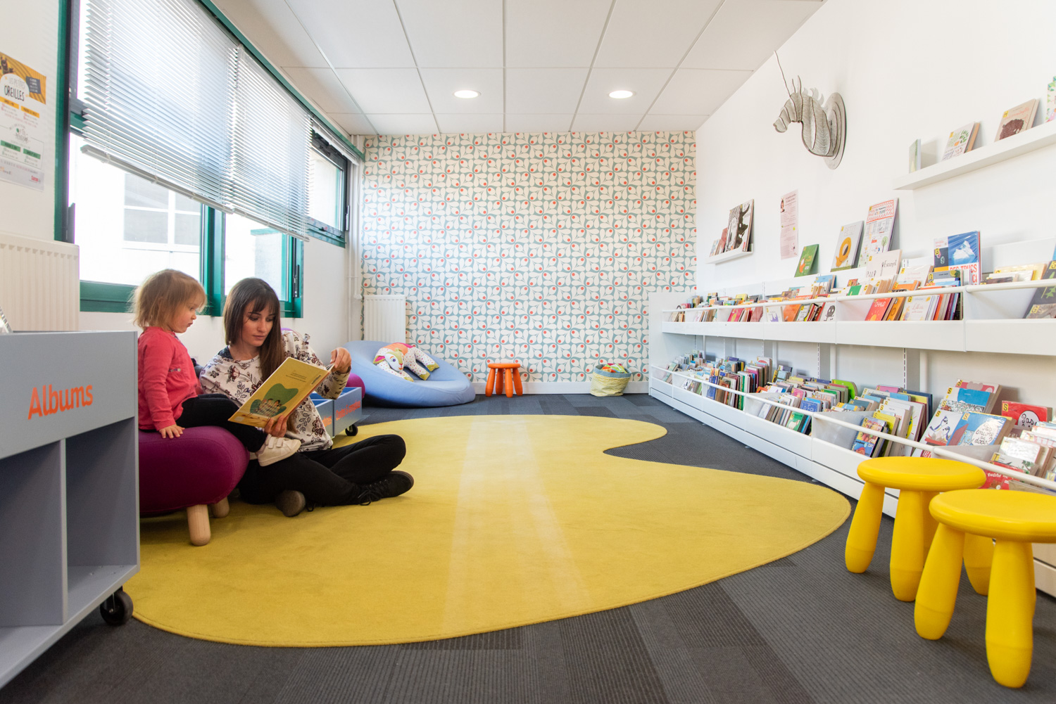 Een trendy vintagehoekje werd voorzien van een schommelstoel, terwijl de kleintjes terechtkunnen in een Cocoon leesgrot bij de ingang van de kleuterhoek. Twee grote konijnen wachten dan weer geduldig op de tieners die bij hen kunnen neerploffen. Een kleurrijk allegaartje in een mooie en volledig gerenoveerde ruimte.