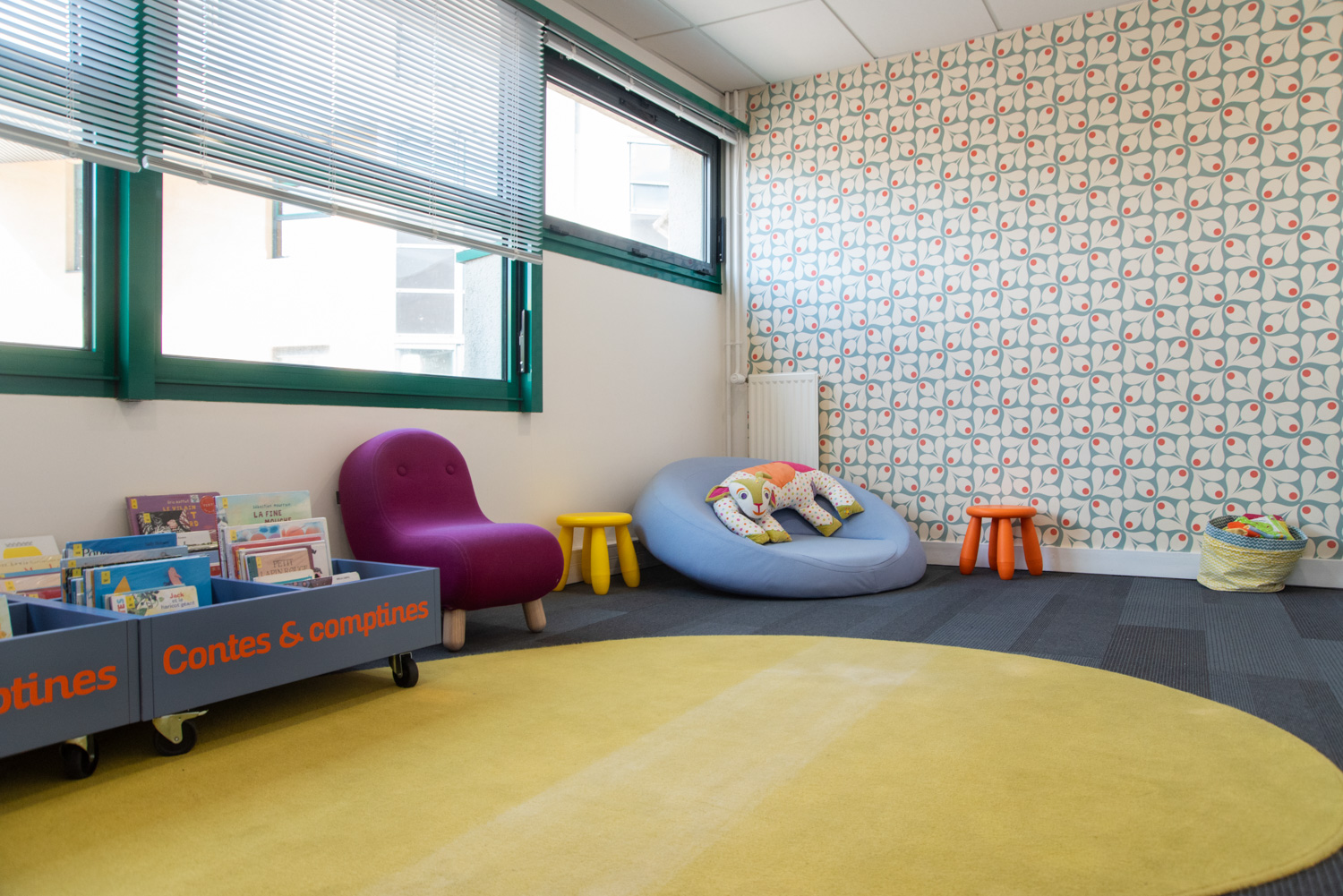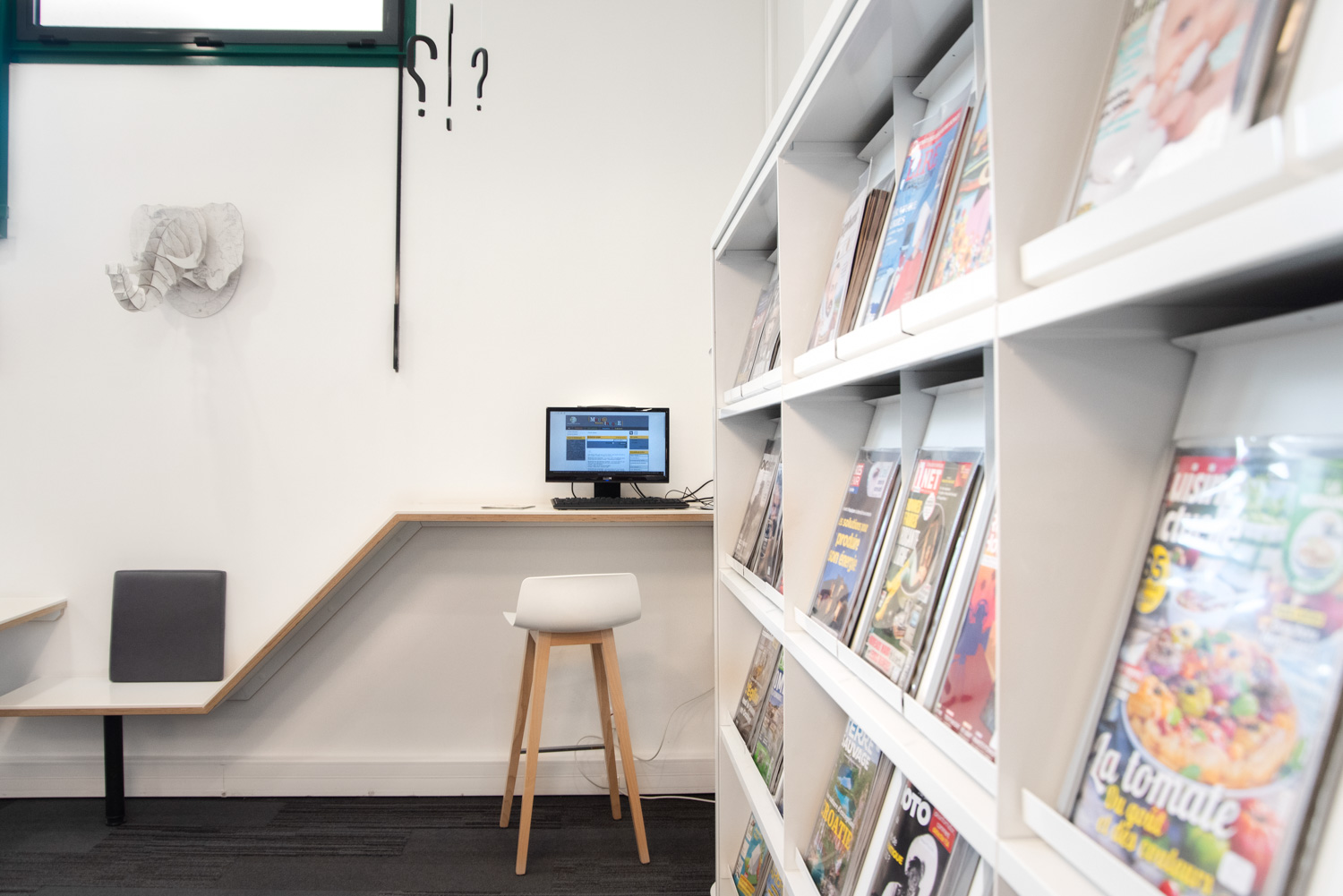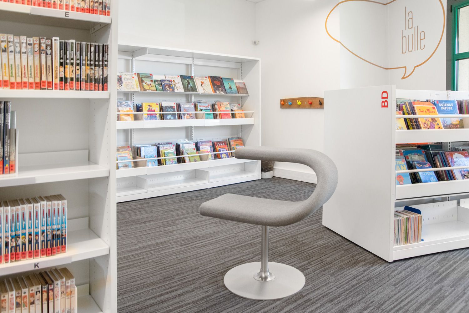 Een trendy vintagehoekje werd voorzien van een schommelstoel, terwijl de kleintjes terechtkunnen in een Cocoon leesgrot bij de ingang van de kleuterhoek. Twee grote konijnen wachten dan weer geduldig op de tieners die bij hen kunnen neerploffen. Een kleurrijk allegaartje in een mooie en volledig gerenoveerde ruimte.