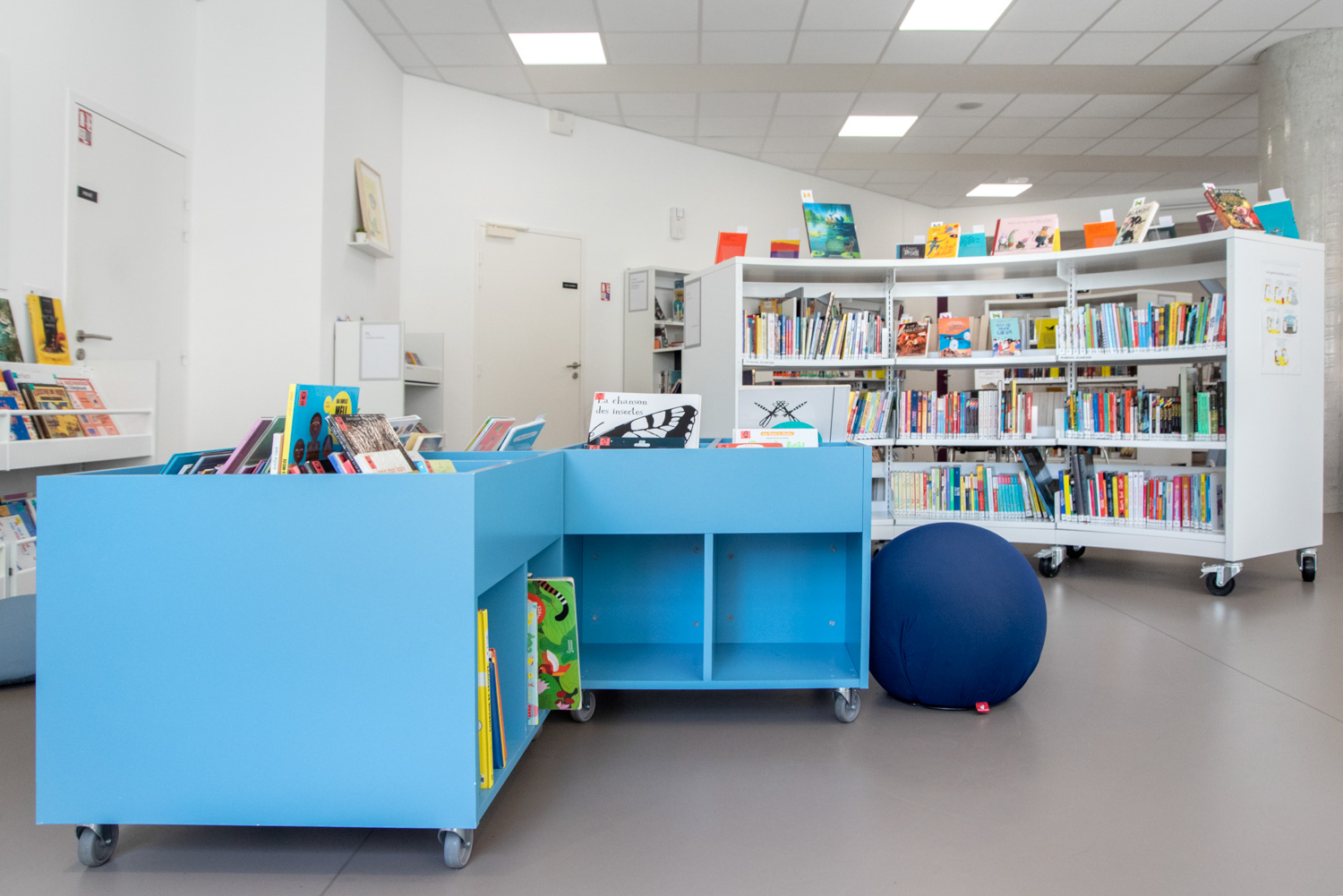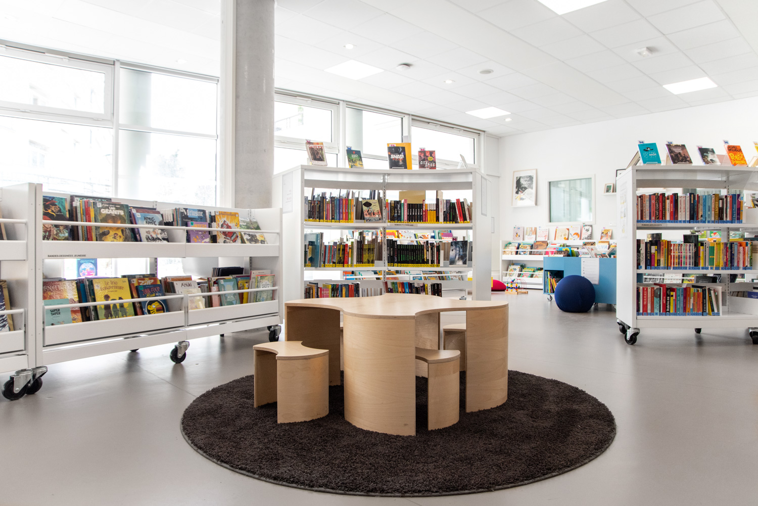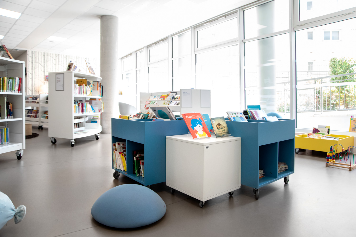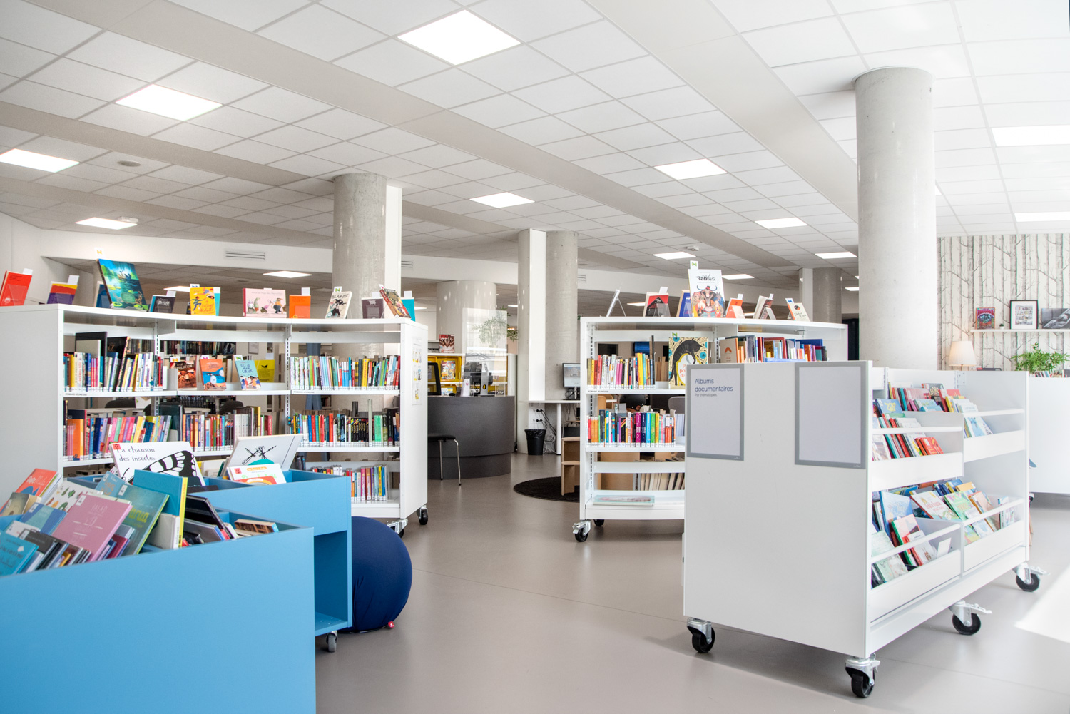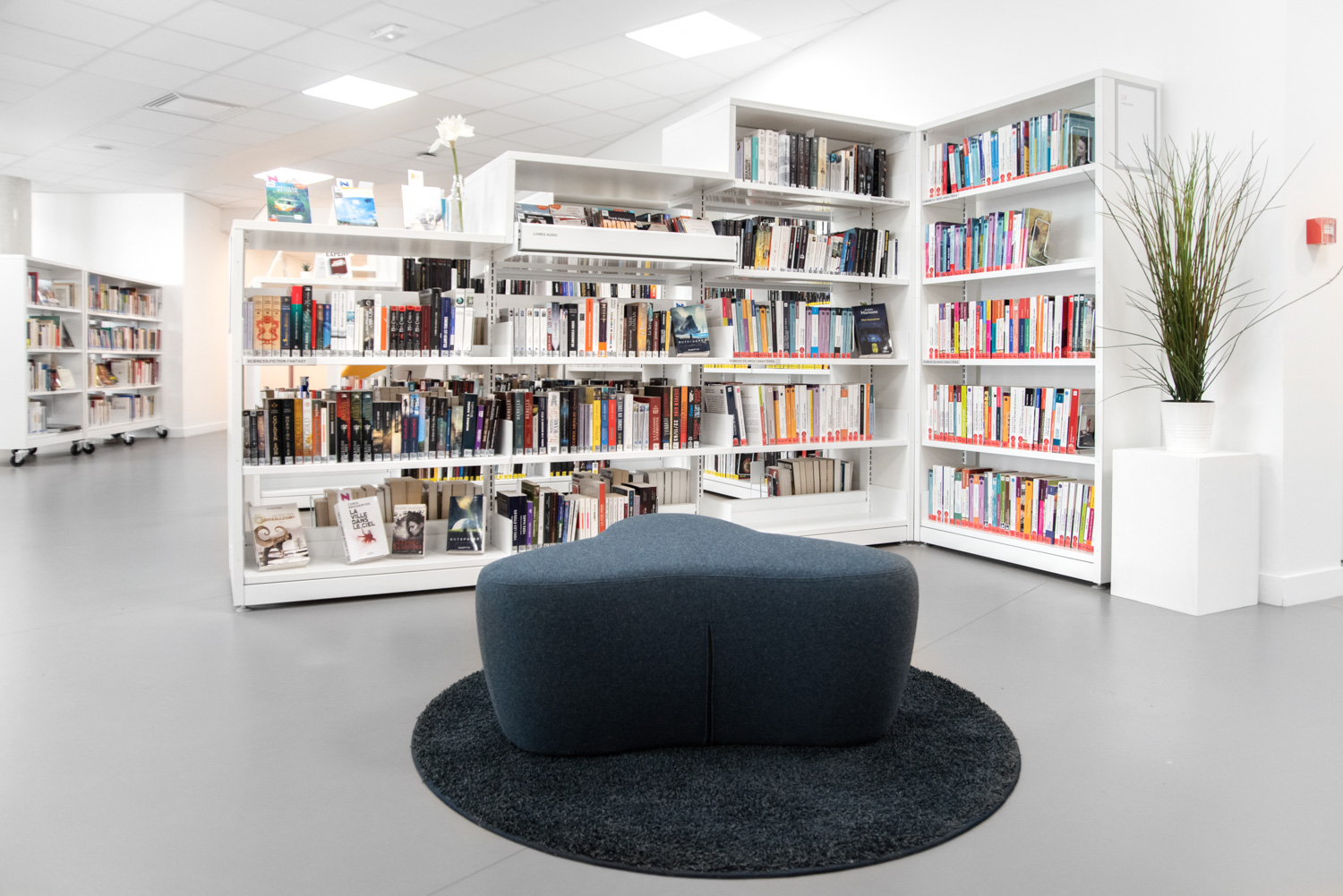 Het werk, uitgevoerd in samenwerking met BC Intérieur voor het gehele interieurontwerp, heeft geresulteerd in een vrolijke en flexibele bibliotheek, met ruimtes die visueel samenhangend en duidelijk gedifferentieerd zijn! Deze succesvolle samenwerking heeft geleid tot een culturele ruimte die burgers uitnodigt om binnen te komen en tijd door te brengen in de bibliotheek. Ofwel naar een plaat te luisteren in de grote fauteuils, verhalen of strips te lezen op comfortabele krukjes, of in kleinere groepen te werken.