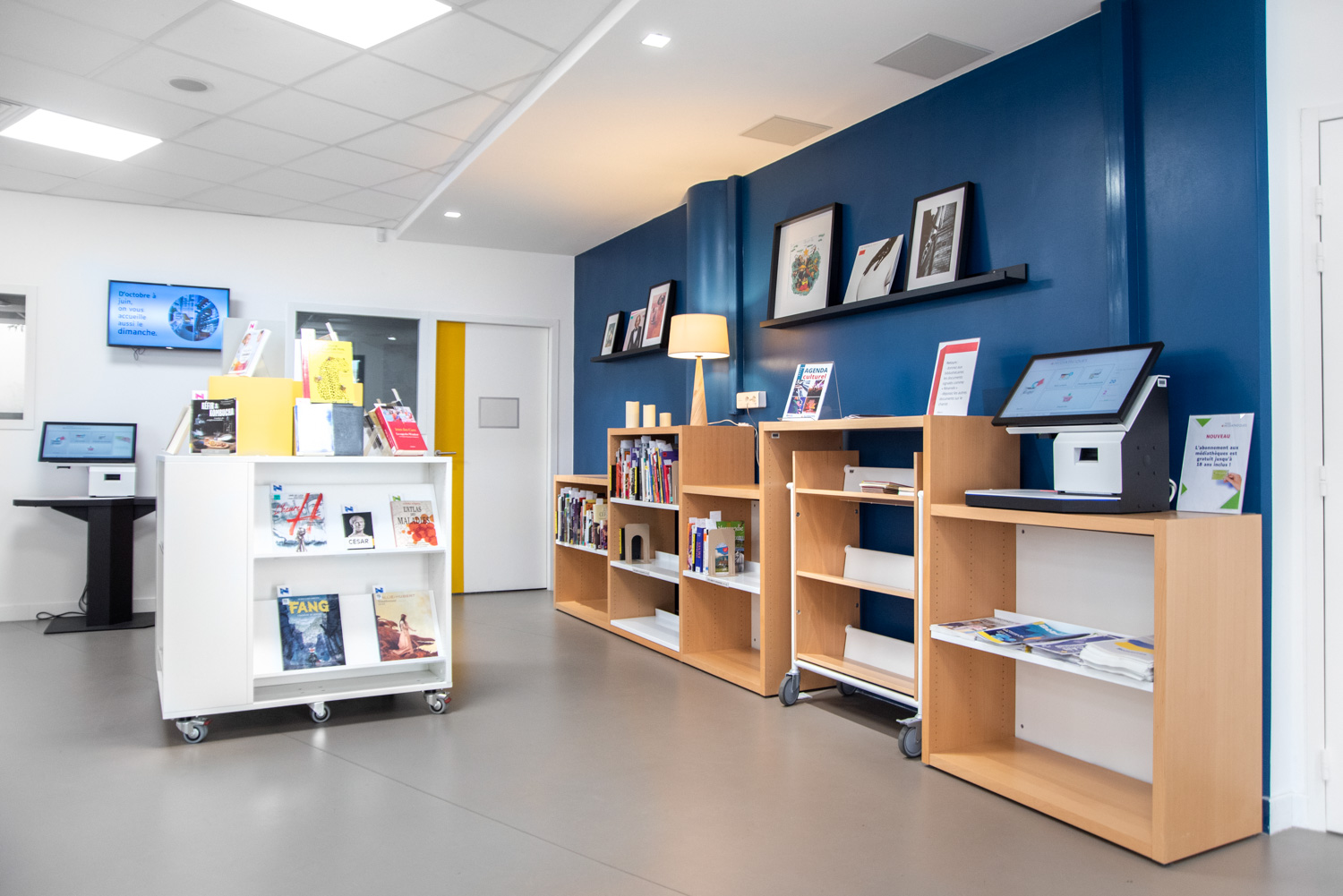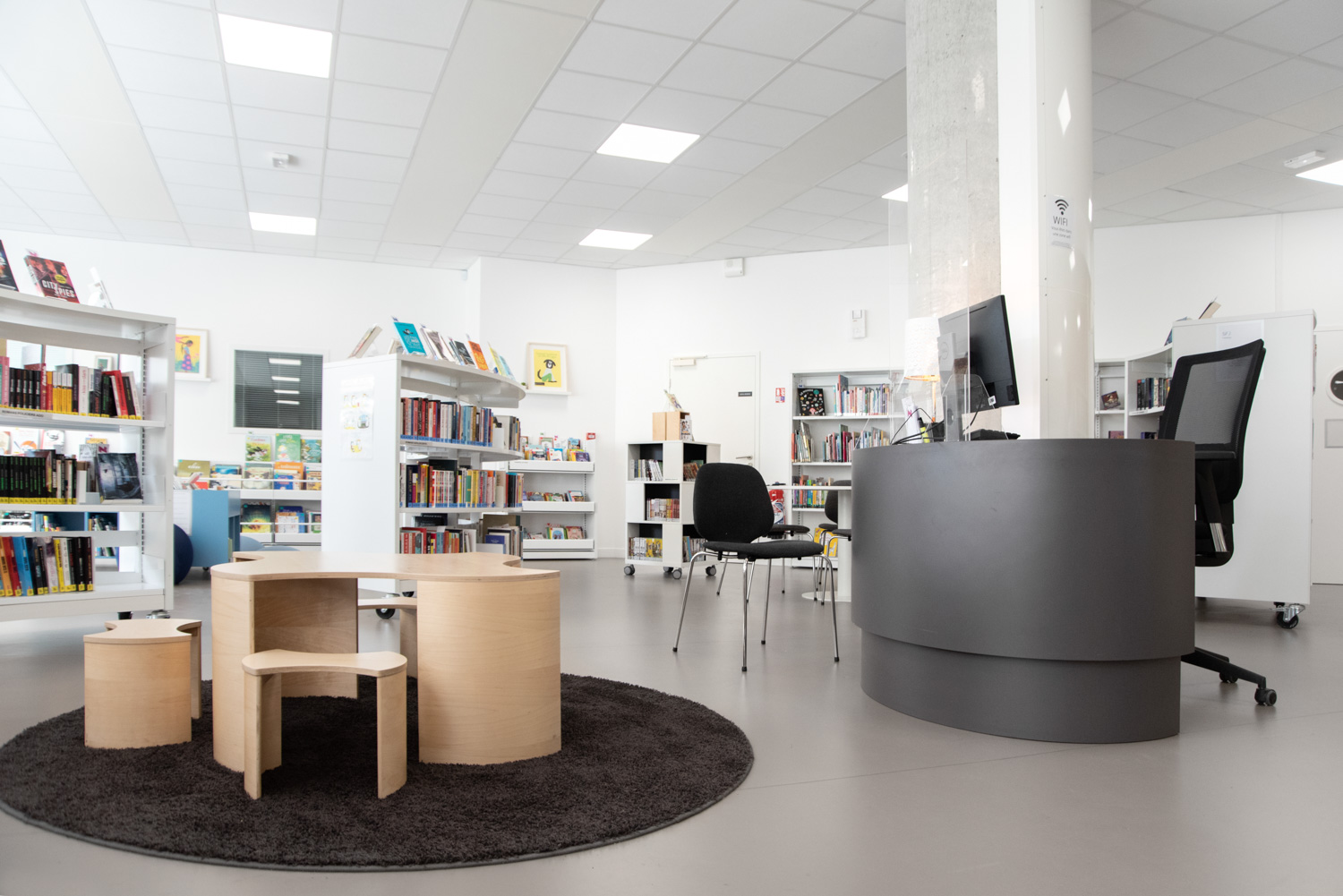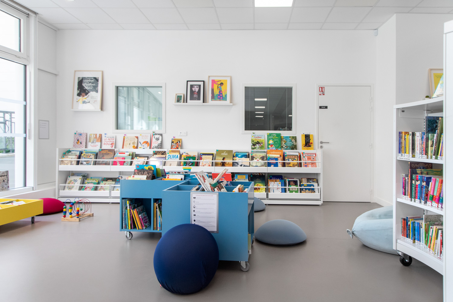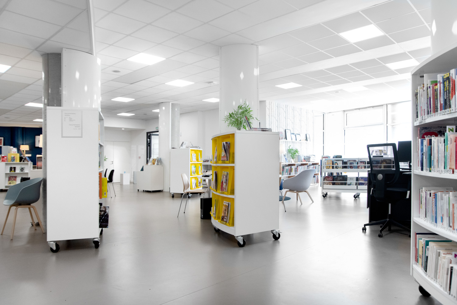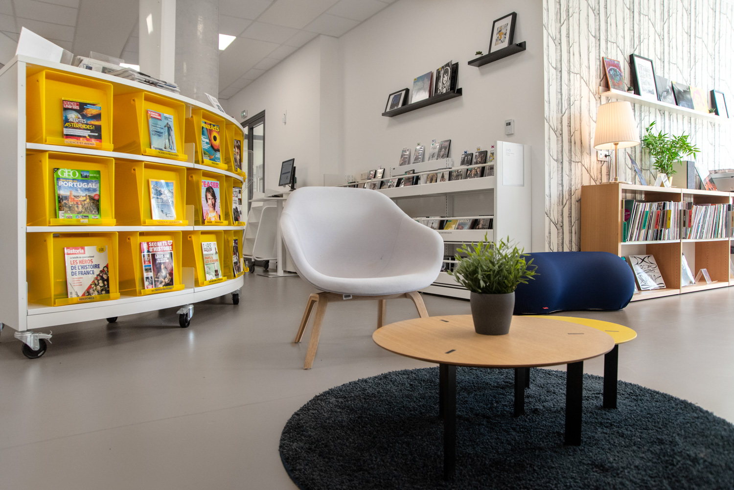 Het werk, uitgevoerd in samenwerking met BC Intérieur voor het gehele interieurontwerp, heeft geresulteerd in een vrolijke en flexibele bibliotheek, met ruimtes die visueel samenhangend en duidelijk gedifferentieerd zijn! Deze succesvolle samenwerking heeft geleid tot een culturele ruimte die burgers uitnodigt om binnen te komen en tijd door te brengen in de bibliotheek. Ofwel naar een plaat te luisteren in de grote fauteuils, verhalen of strips te lezen op comfortabele krukjes, of in kleinere groepen te werken.