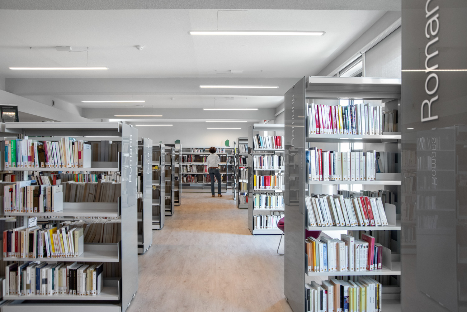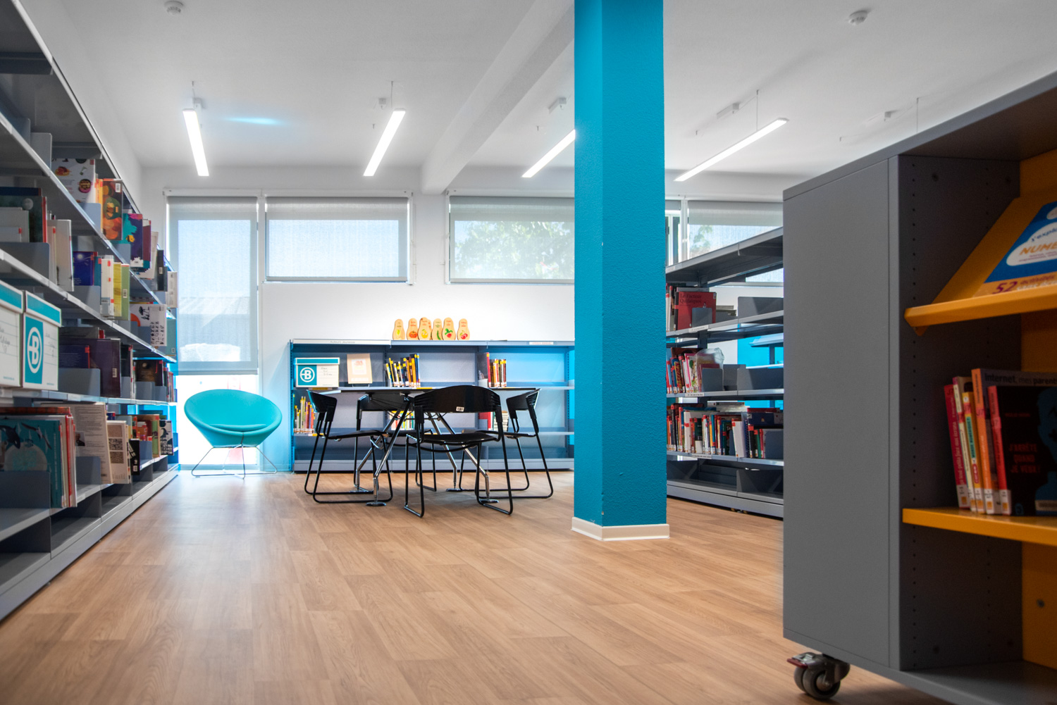 De gewezen handelsruimte werd opgedeeld in vier zones: op de begane grond werd een jeugdhoek en entertainmentruimte ingericht, terwijl volwassenen op de eerste verdieping terechtkunnen, waar ook de gezelschapspellen te vinden zijn. Elke zone is gemakkelijk herkenbaar dankzij bordjes in een specifieke kleur. In de verschillende zones is overigens informatie en hulp beschikbaar in het Catalaans. Bovendien werd de mediatheek uitgerust met de nodige toepassingen voor een publiek op afstand . Het aanbod omvat collecties in grootletterdruk, brailleboeken en luisterboeken, naast uiteenlopende mediatypes, waaronder cd’s, vinylplaten en dvd’s.
