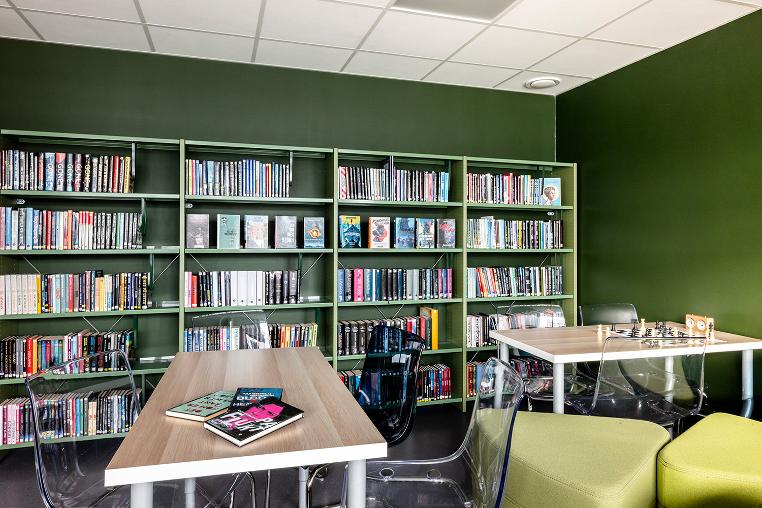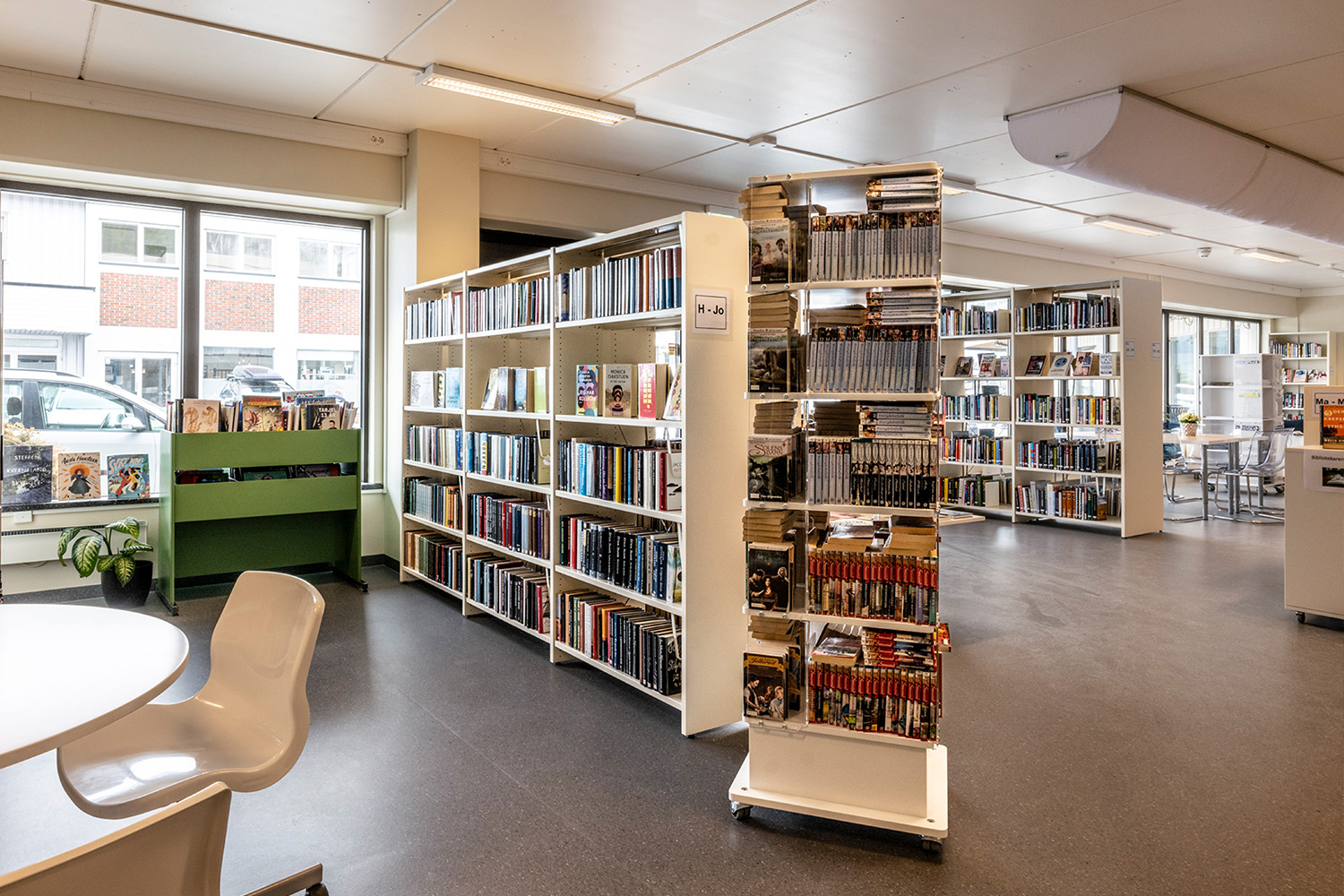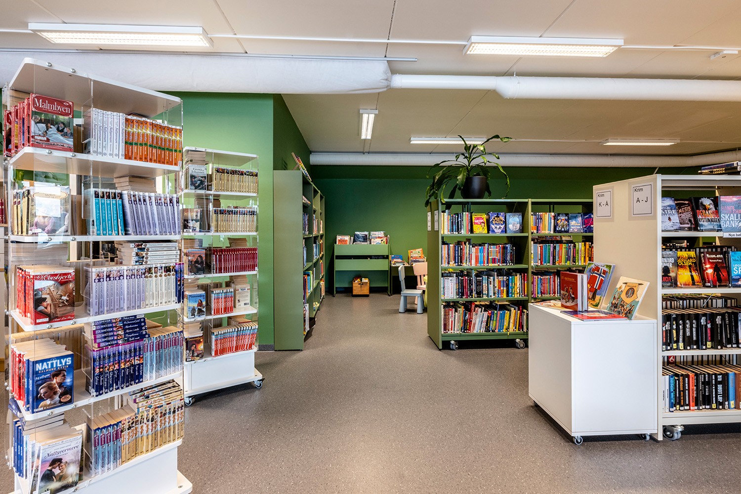 De bibliotheek streefde naar een harmonieuze mix van nieuwe, functionele legborden en infobalies, aangevuld met het hergebruik van bestaand meubilair en boekdisplays. Ons Noorse ontwerpteam BS Eurobib was verantwoordelijk voor de lay-out en kleurenschema's en werkte samen met een dealer voor de aanlevering van rekkensystemen, balies, displaytorens, boekentrolleys en meer.