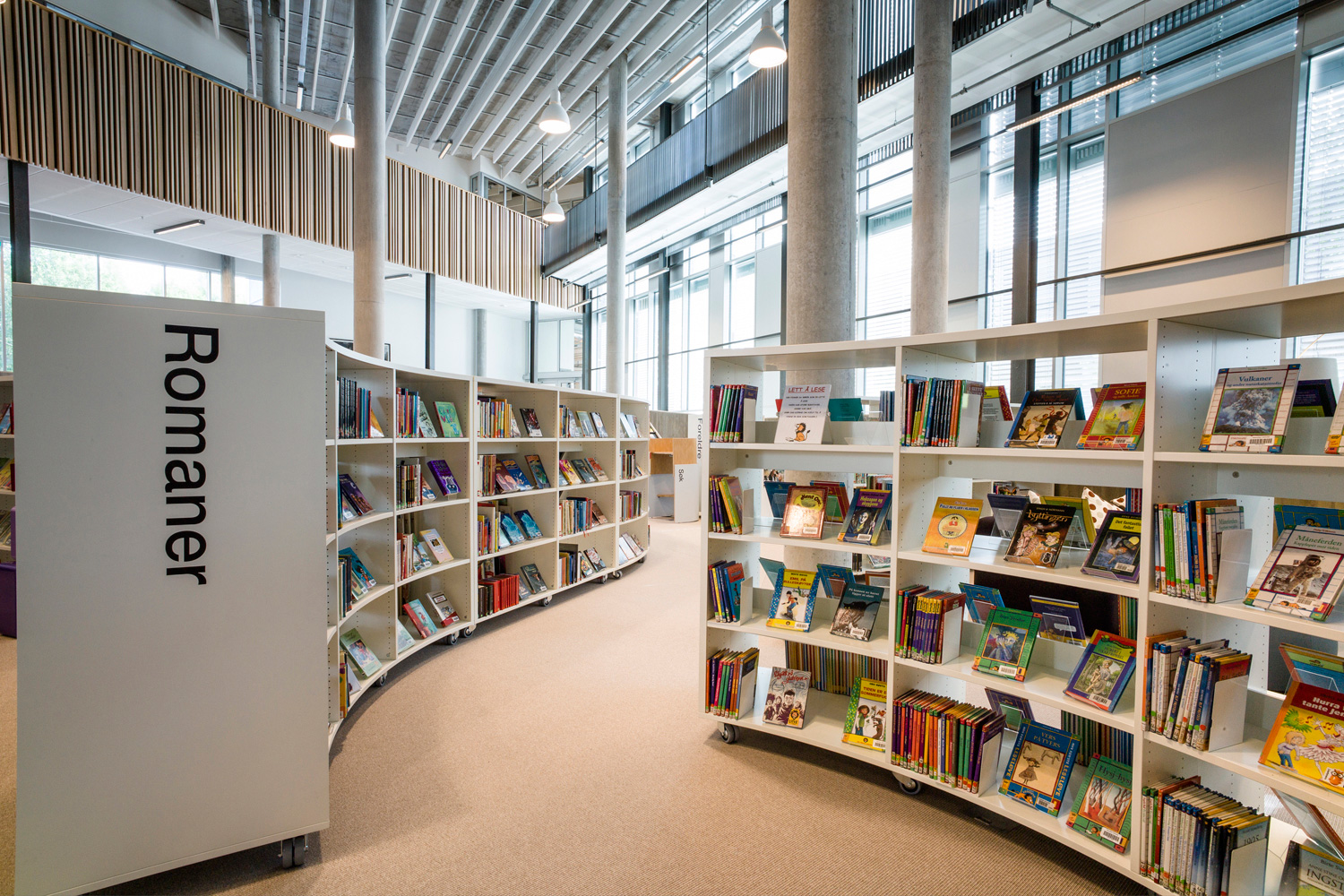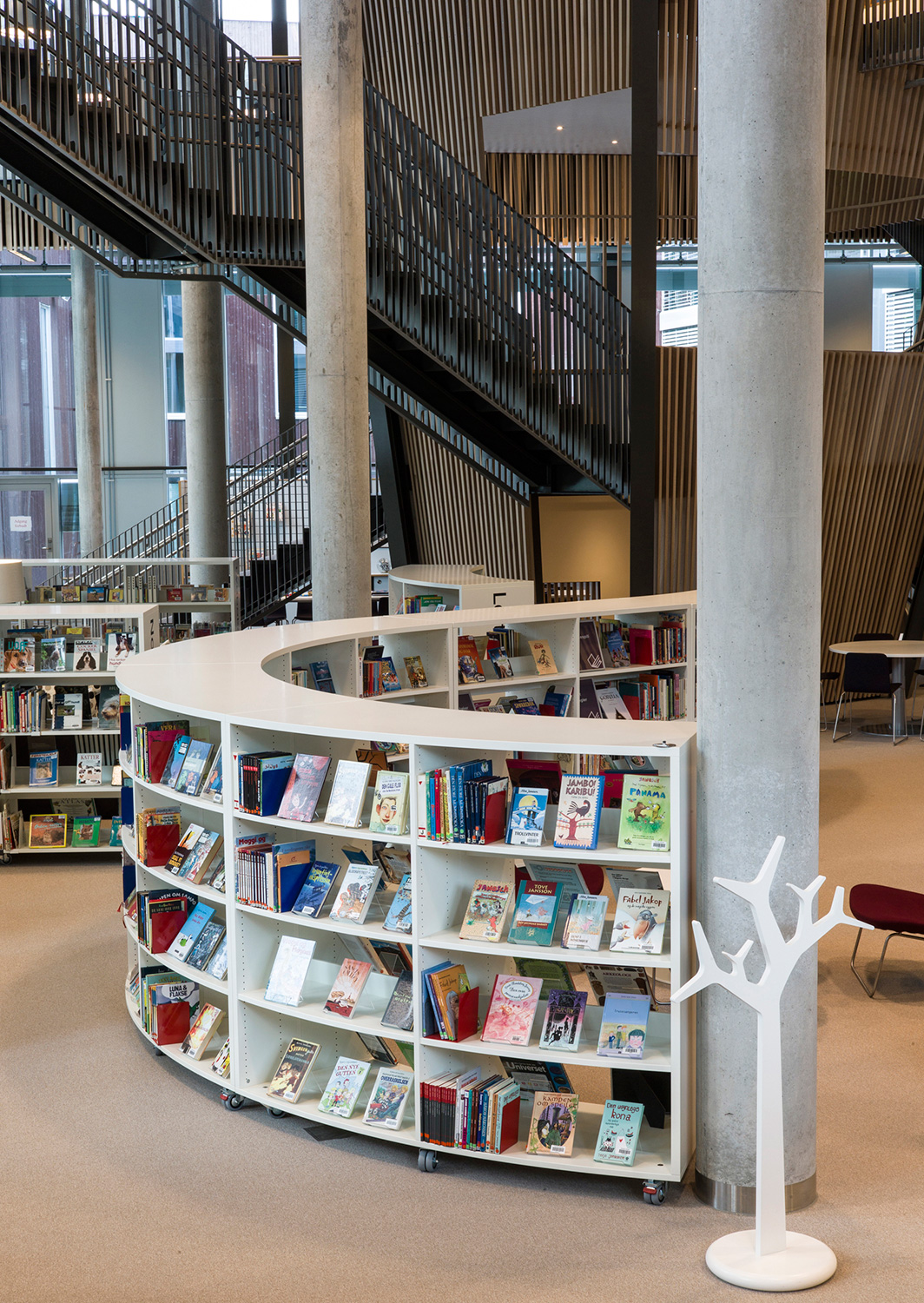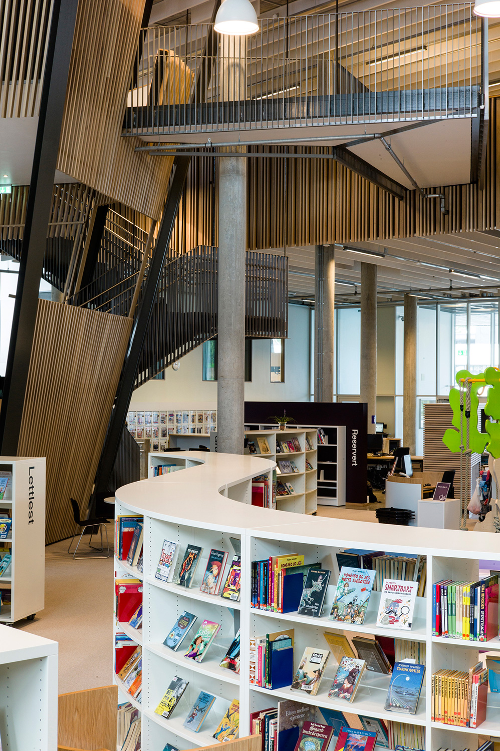 De organische vormen en zachtgolvende lijnen verlenen het gebouw een eigentijds karakter. Niet alleen de architectuur maar ook de bibliotheekrekken zijn organisch gevormd. De vele studietafels, de comfortabele zitjes, de infopunten en zelfuitleenbalies maken van deze bib een aangename plaats om te vertoeven.