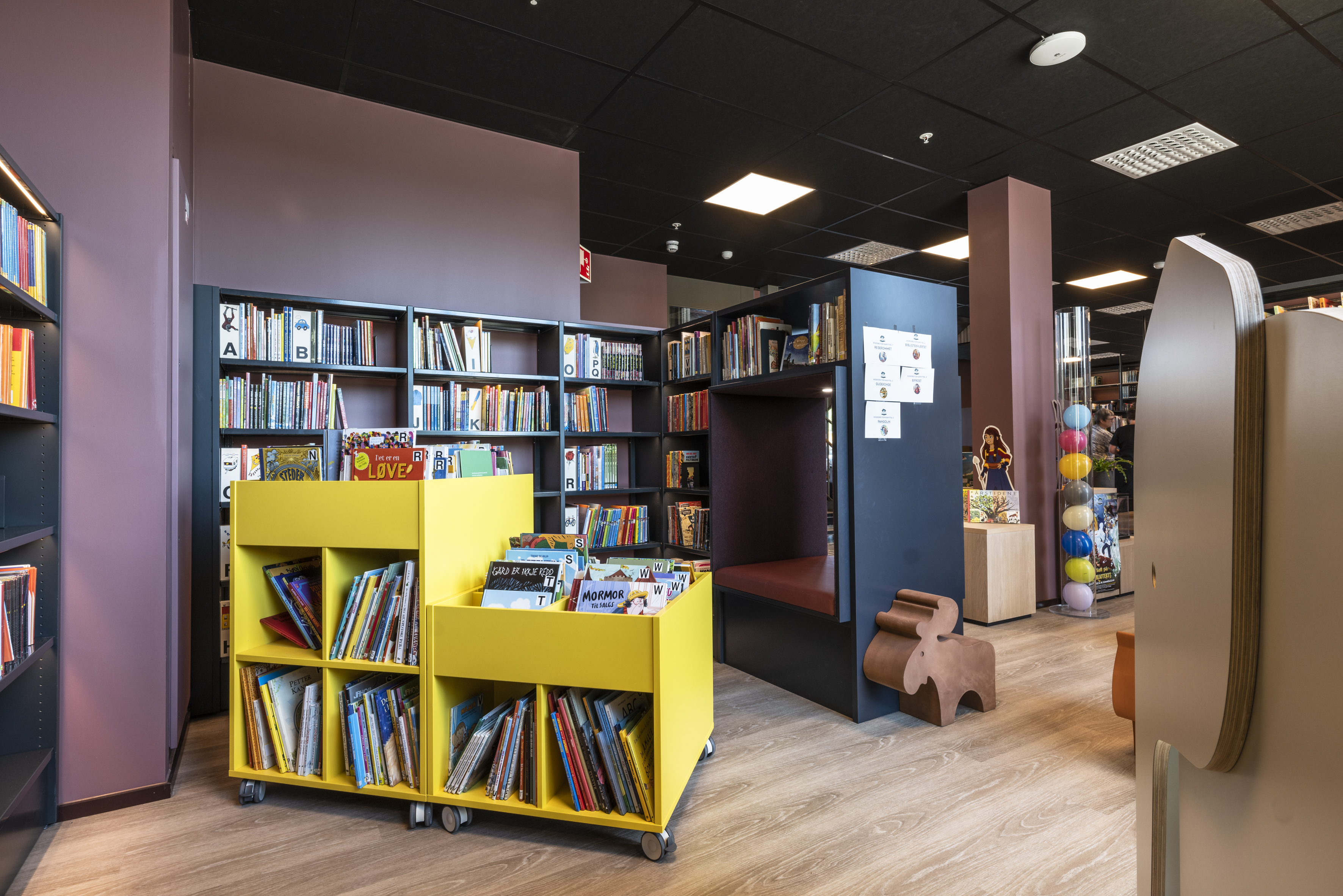 De kinderafdeling op de gelijkvloerse verdieping werd voorzien van kleurrijk meubilair en prentenboekenbakken, die een mooi contrast vormen met de zones voor non-fictie en tijdschriften. Volwassenen op zoek naar fictie kunnen terecht op de eerste verdieping, waar een heuse ‘mysterieruimte’ werd voorzien. Centraal op diezelfde verdieping werd een knusse jeugdafdeling ingericht, waar de jongeren rustige plekjes en hoekjes vinden voor studie of groepswerk. Ook de lokale collectie kreeg hier een veilig onderkomen in hoge rekkensystemen met glazen, vergrendelbare deuren.